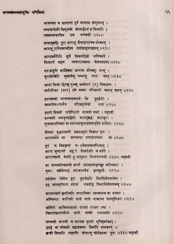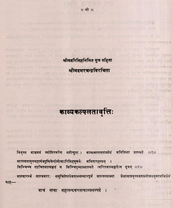 Right from the oldest days, the काव्यकल्पलतावृत्ति or काव्यकल्पलता-कविशिक्षावृत्ति of Amara Candra Yati (V. S. 12th century) is known, both for its original subject-matter and for the deep scholarship of the author reflected in it. So many mss. of the work are listed to be found in different manuscript libraries, mainly in western India. The author has written another very elaborate and detailed Vrtti on his own work. This Vitti, परिमल by name, is unfortunately available only upto 2.1 and a part of 2.2, i. e., only on the first six stabakas and a part of the seventh, in a work of total 21 stabakas. He is also said to have written a third Vrtti, "Manjari by name on his work, thus betraying his constant, unending thinking on the training and equipment of a poet seeking literary perfection. It also seems that during the course of writing of the 'Parimala', the author has revised his 'Vrtti' at places. This is evidenced from the fact that he asks the reader atleast at three places in his 'Parimala' to refer to his Vrtti'. The reason of the non-completion of 'Parimala' is not known. Later writers also seem to know it upto a part of 2.2 at the most, as mentioned above. It is very much likely that this his work on 'training and equipment of a poet' is one of his later and mature works, and, in all probability, he could not complete his 'Parimala' before his death. This is, however, only a conjecture.