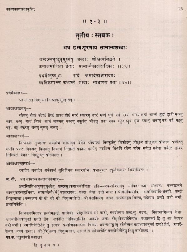 A word, to be elaborated later in its proper place, may be added about the value of the subject-matter of the work to justify this patient, hard and long-time effort and publication of the work. The work, as its name shows, is on the training and equipment of a poet, व्युत्पत्ति and अभ्यास of traditional writers. All topics therefore, associated with the two are discussed by the author. He expects the poet to be well equipped on the lines laid down by him and then to train himself in the composition of poetry so that he progresses step by step and constantly evolves into a greater poet by scaling higher and higher heights. The sum-total of all this discussion is that the poet should be a सर्वज्ञ. But important is the fact that he shows how he can become a सर्वज्ञ; this सर्वज्ञता that comes by stages is also expected to be well-planned systematic. This brings in the discussion of four main topics छन्दः सिद्धि, शब्दसिद्धि, श्लेषसिद्धि and अर्थसिद्धि in four प्रतान. Other important topics discussed and analysed are वर्णनं, अद्भुतविधि, चित्रप्रपञ्च, अलंकार and समस्याक्रम' etc. All these are of importance on the art-side (Kalapaksa) of Kavya and therefore the poet is expected to master these. We do not come across such detailed discussion on the topics and the problem posed in any work accepted by tradition. Thus, the work is original in its own way and so is the subject-matter that perhaps no other author could analyse and elaborate better, not even Vinaya Candra Suri, the writer of काव्यशिक्षा'. The work of Amara Candra Yati would therefore be a positive addition to knowledge in general and add substantially to the wealth of knowledge of poetics in particular.
