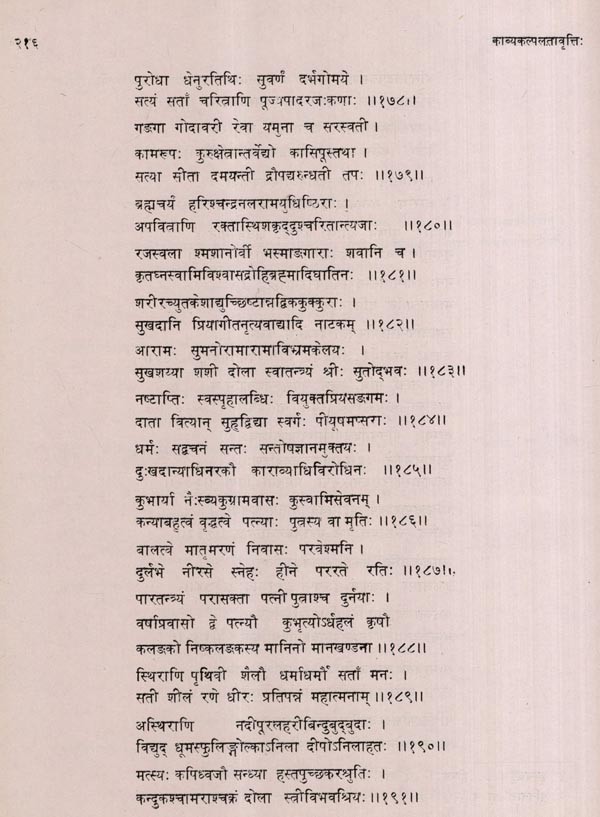 काव्यकल्पलतावृत्ति is published twice and translated into Marathi once. The first edition was published about 95 years back and the second edition came out in 1931. The Marathi translation is also very old. The 'Parimala' and 'Makaranda' are available only in mss, and await publication. Again, the latest printed Vrtti edited by Pundit Jagannath Shastri Hoshing, is very much faulty, corrupt, hurried and full of misprints. It therefore needs a thorough revision with the help of several authentic and valuable mss. that were perhaps not available to Pundit Hoshing. Except for the Sutra or Karika part, it is likely more to misguide rather than guide its readers. It seems that the editor did not have access to so many mss. available to us to-day.