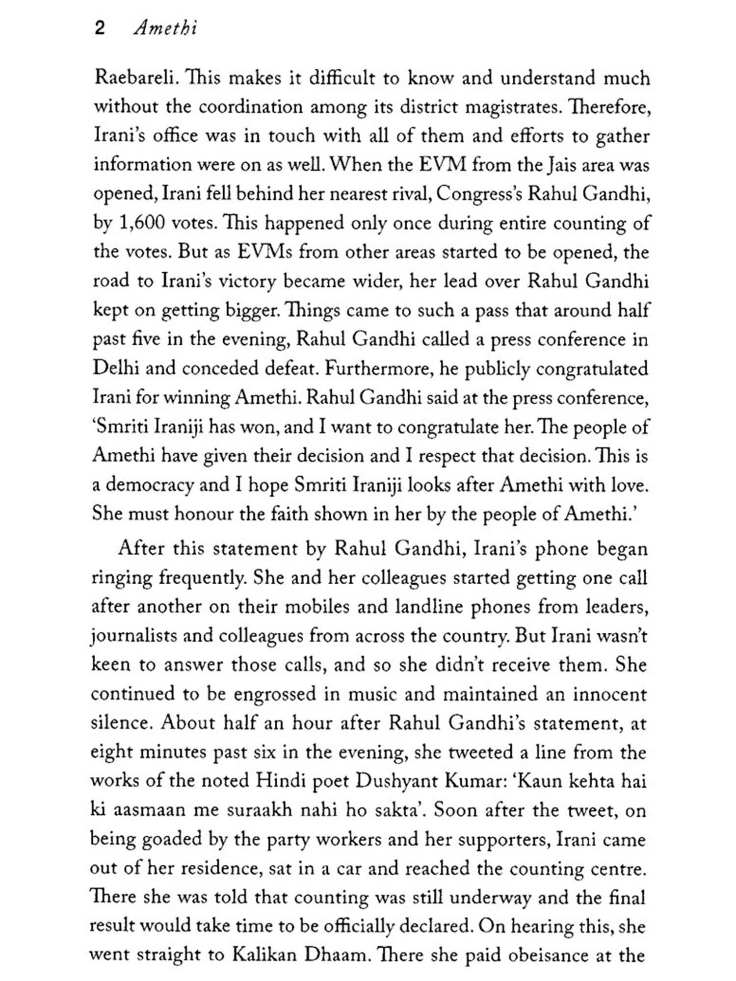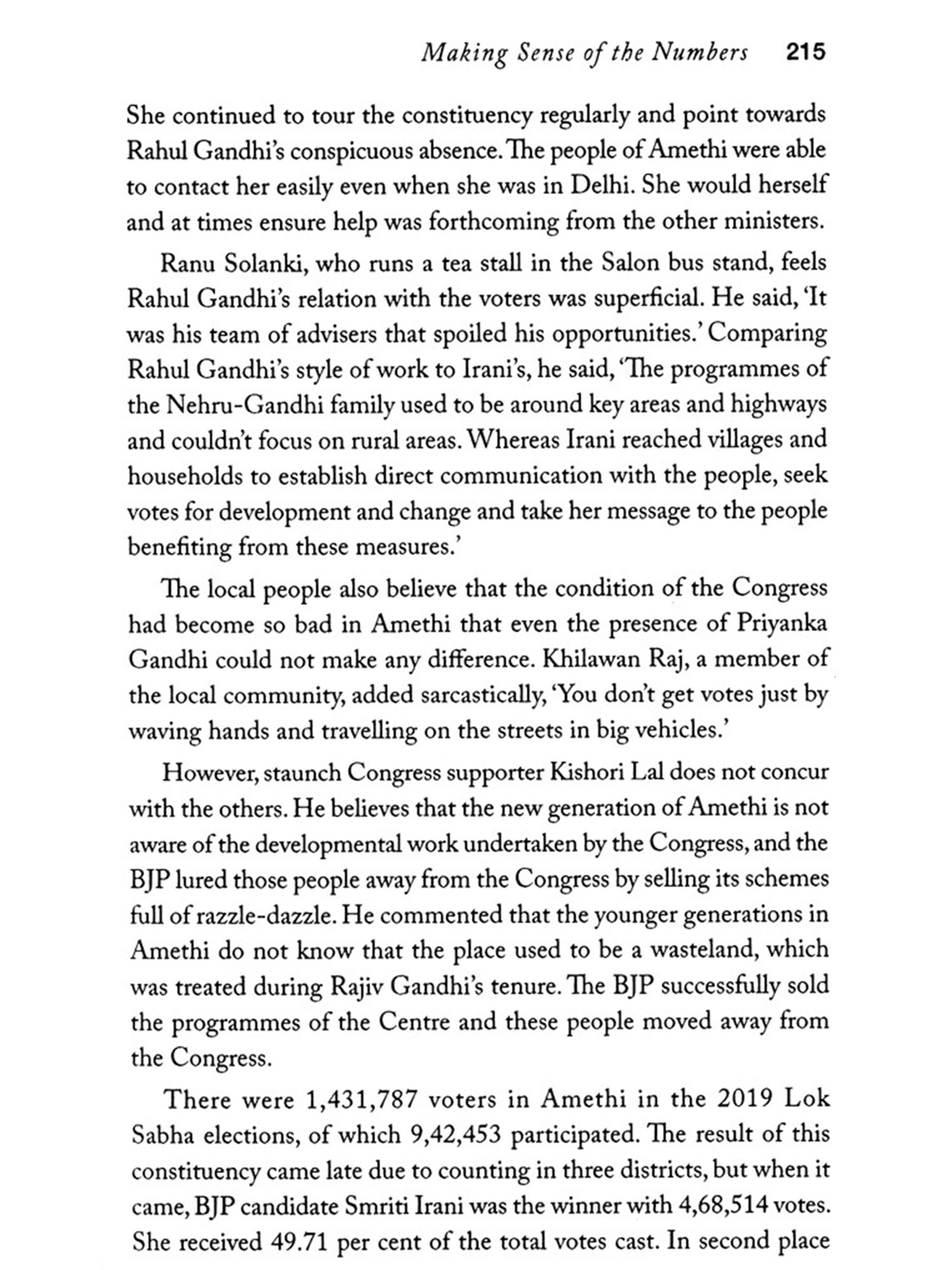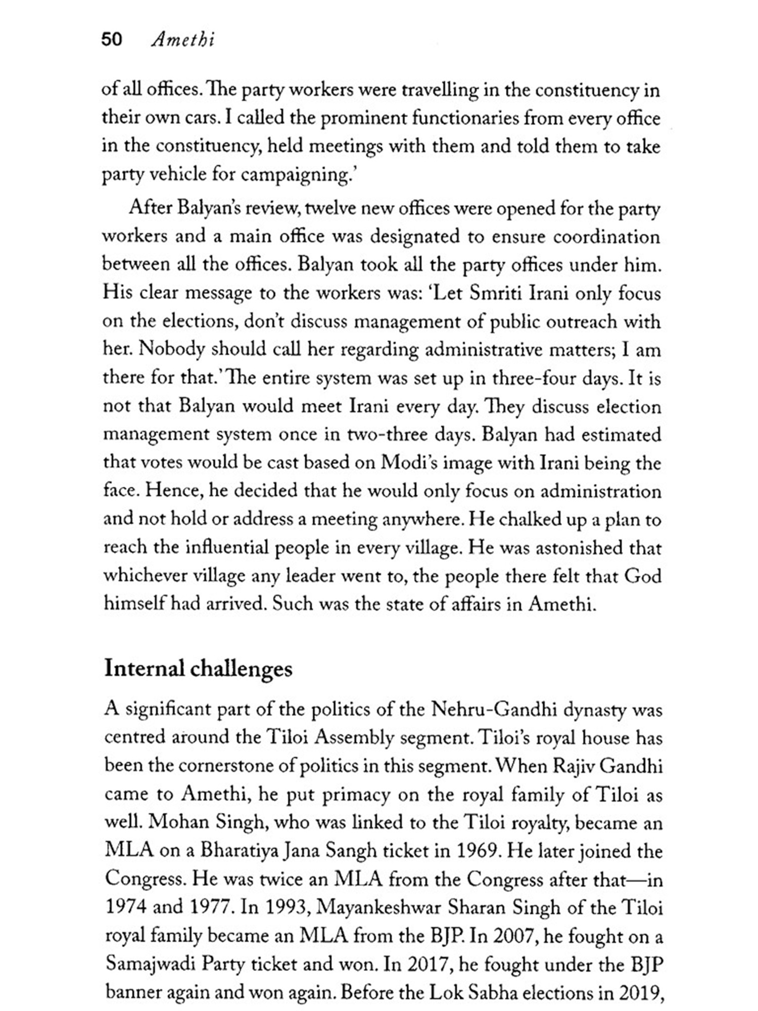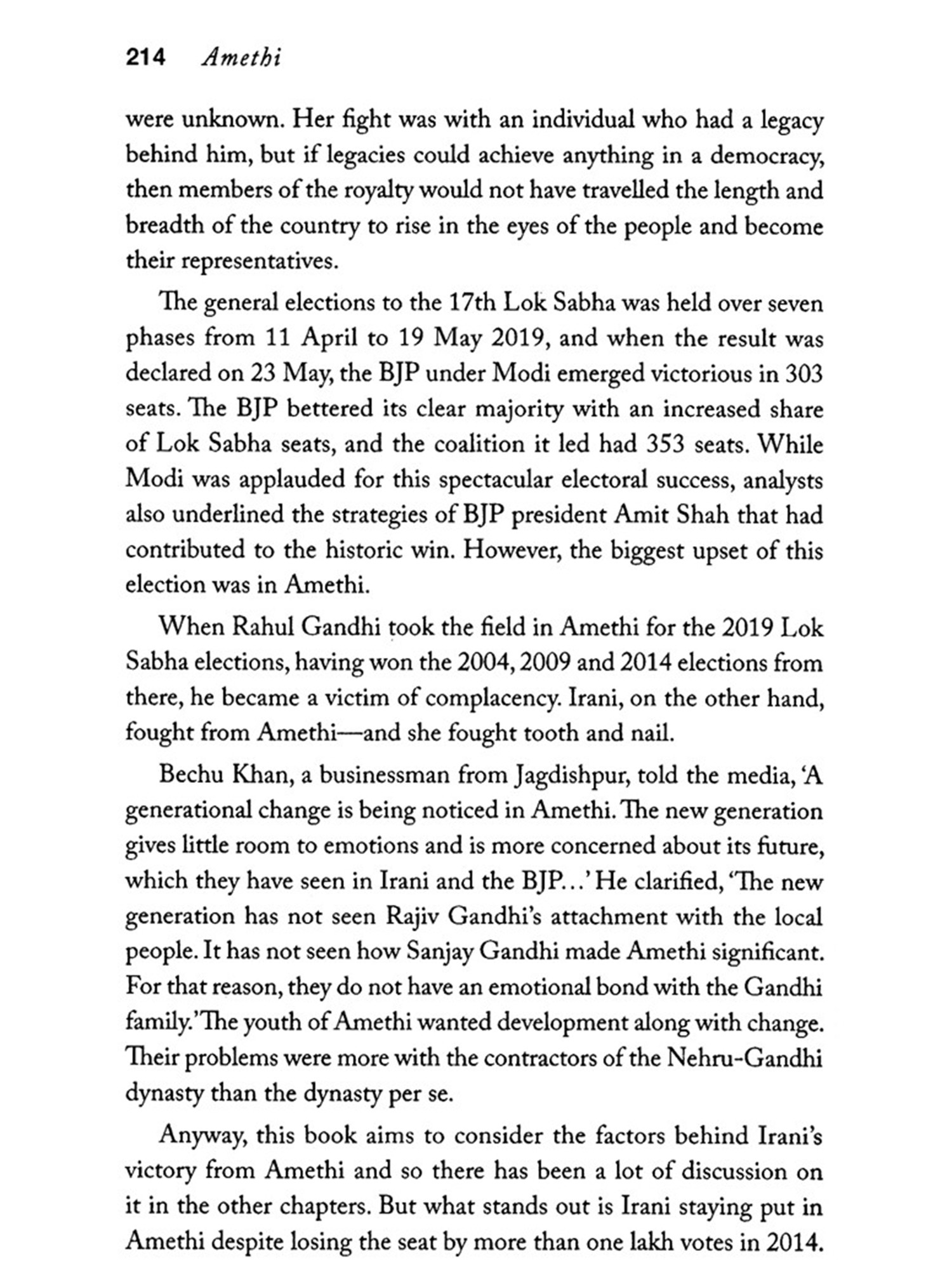 During many of my Amethi visits, I used to simply roam around to get a sense of the mood of the people there. I would stop anywhere and chat with people to collect information that would be useful for this book. In Lucknow, I met the leaders of different political parties. Now that the book is in your hands, the credit for that should go to these people who helped me understand Amethi and its grassroots politics. At the outset, I would like to express my gratitude towards Smriti Iraniji who shared her thoughts about Amethi with me. She never avoided my questions and answered them with considerable clarity-many thanks to Smritiji. Union minister Dr Sanjeev Balyan narrated his experiences of the Amethi election for several hours. My heartfelt thanks to Balyanji. I would also like to thank the Chief Minister of Goa Pramod Sawantji. I was allotted an hour by the chief minister's office, but when we sat down at his residence, we continued to chat on the Amethi election for nearly two-and-a-half hours.