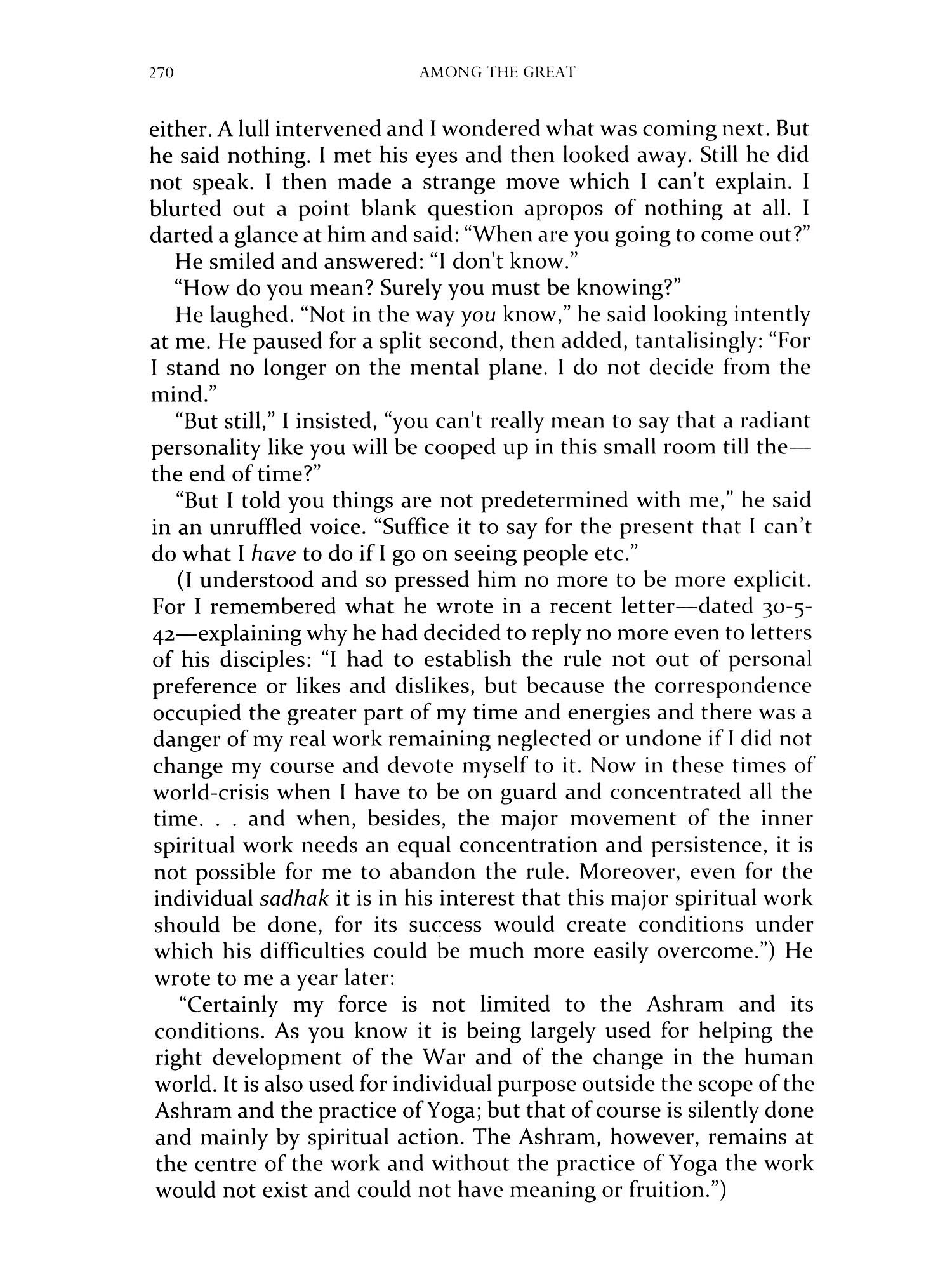Sri Dilip Roy’s teachers, except Bertrand Russell, believe in a Godhead which is the unmanifested principle of all manifestations and in the capacity of human beings to love, know and become assimilated to the Divine nature. To achieve this contact or communion is the final end and purpose of human existence. All these five teachers hold that humanity does not yet exist, that it is laboring, that its ideal defines itself only progressively. Humanity is in the making and requires to be made. This means a new discipline, a new law or dharma which must be followed and the way is profoundly and profusely illustrated in the writings of Sri Aurobindo.
