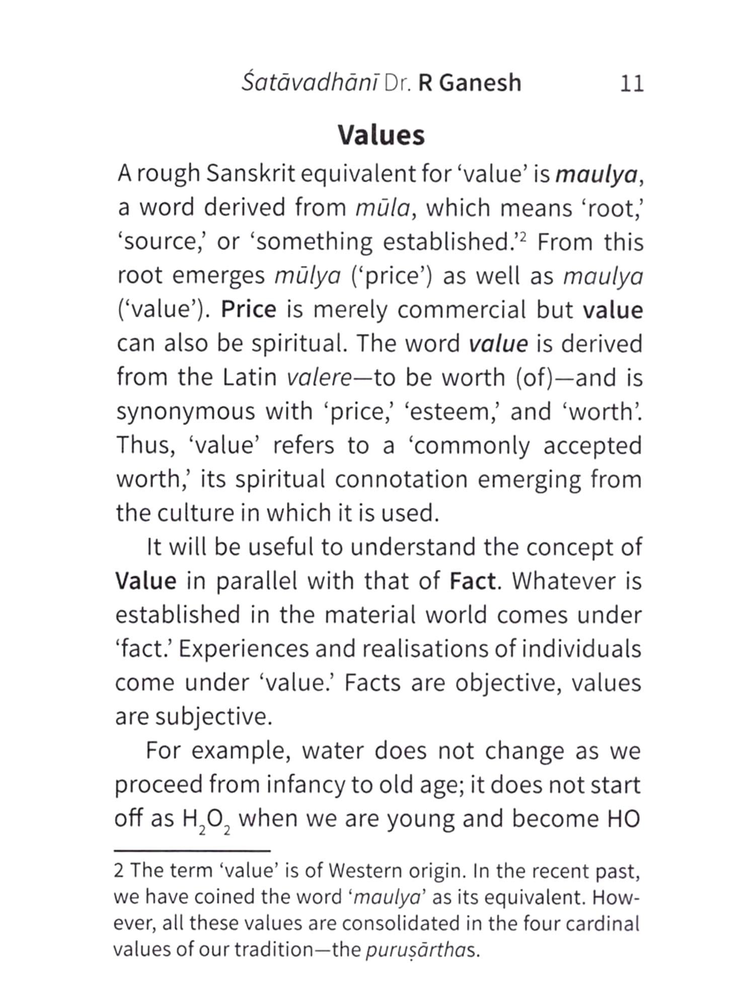 A rough Sanskrit equivalent for 'value' is maulya, a word derived from mula, which means 'root,' 'source,' or 'something established. From this root emerges mulya ('price') as well as maulya ('value'). Price is merely commercial but value can also be spiritual. The word value is derived from the Latin valere to be worth (of)-and is synonymous with 'price,' 'esteem,' and 'worth'. Thus, 'value' refers to a 'commonly accepted worth,' its spiritual connotation emerging from the culture in which it is used.