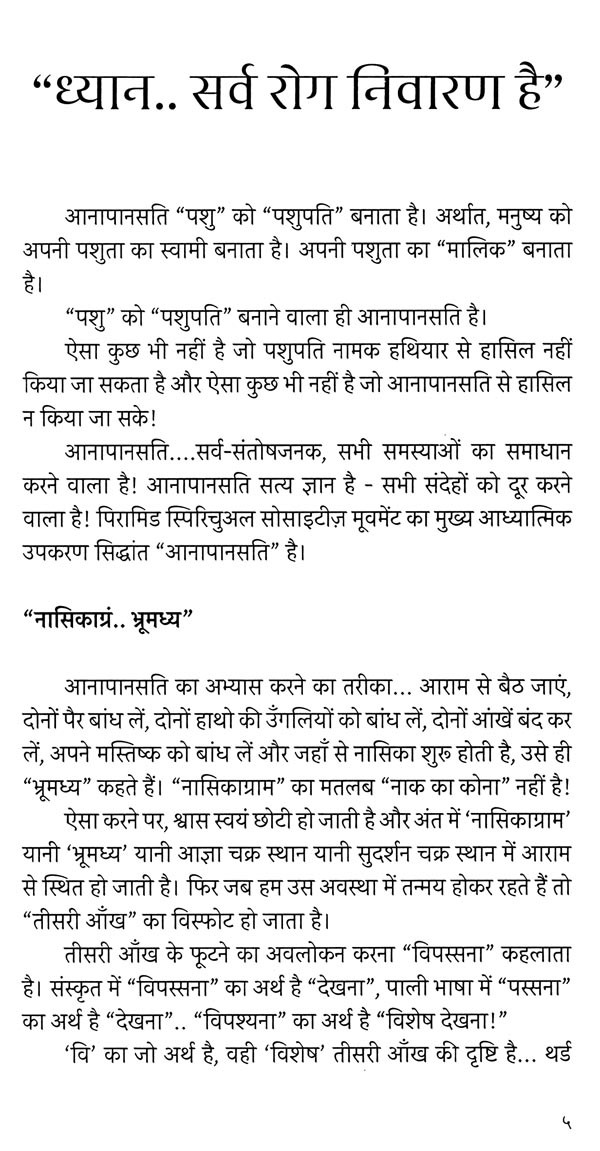 इस जगत की सबसे सरल ध्यान पद्धति आनापानसति है! इस सत्य को जानकार, ब्रह्मर्षि पितामह पत्री जी ने ध्यान के बारे में सखोल स्वरूप से इस पुस्तक में बताया है। सत्य पहचानने हेतु शोध करने वाले लोगों के लिए अंत तक पहुंचने की स्थिति ही आनापानसति है। वहीं से उनकी असली आध्यात्मिक यात्रा शुरू होती है!