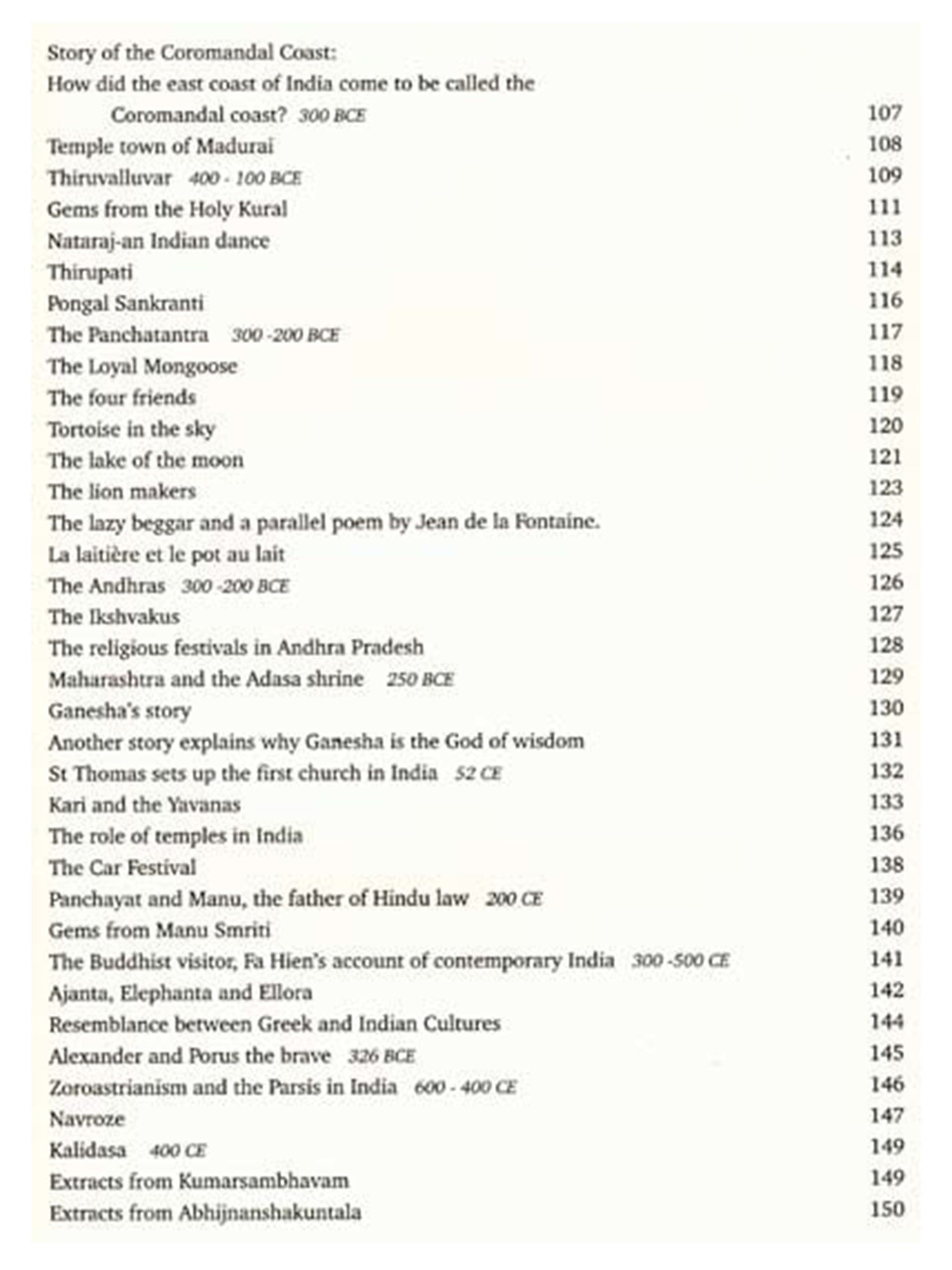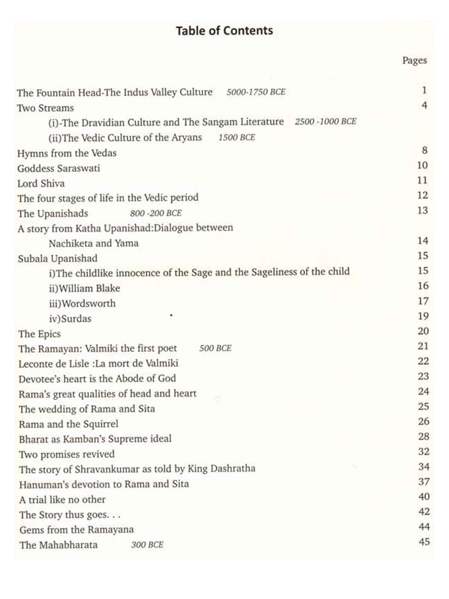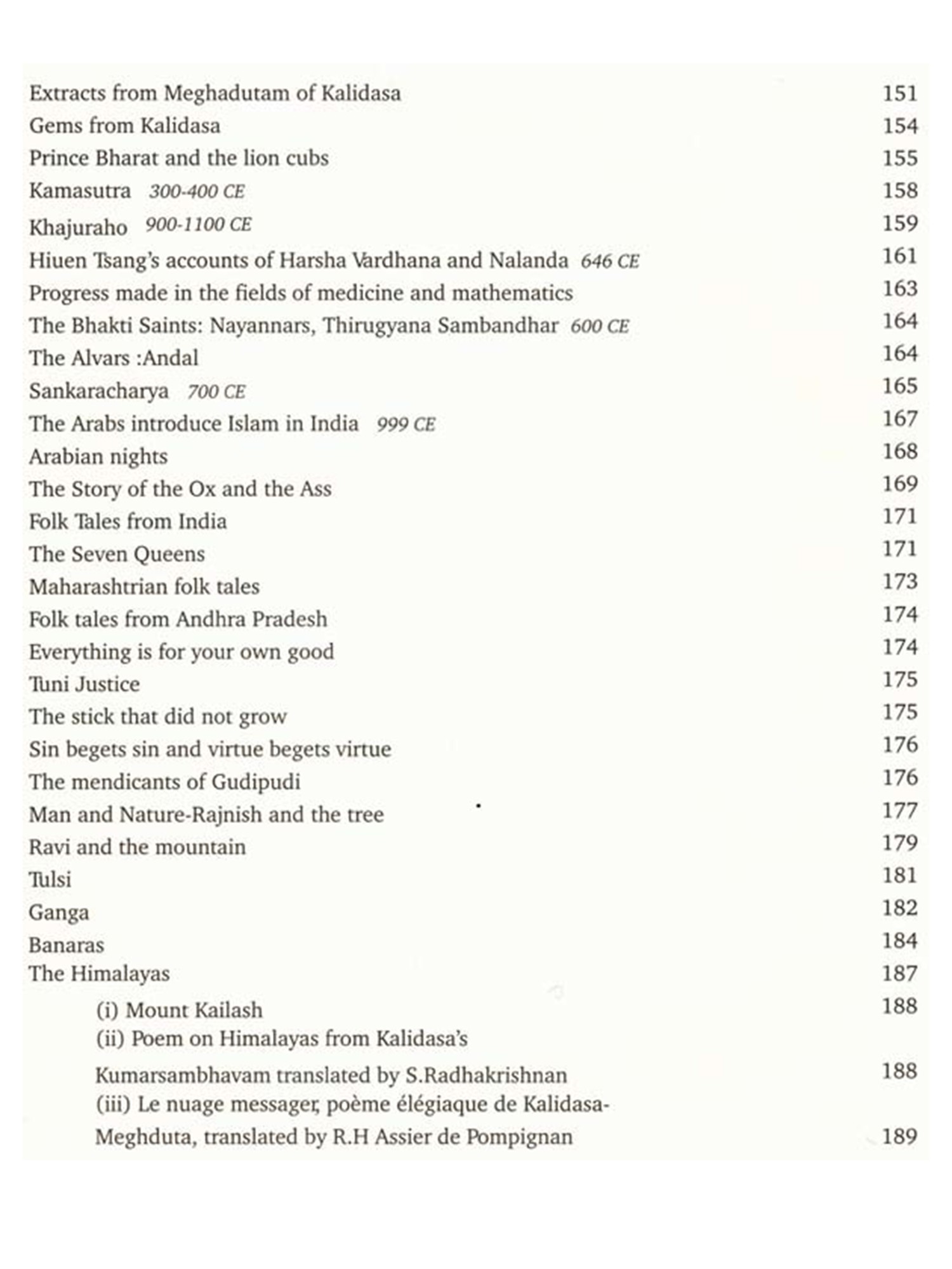 Both Fountain Heads-the Indus Culture as well as the Dravidian stream are described in this book. The Greek and Persian influences on the Indian way of life are clearly shown. We can find in there eternal legends known in the countries of the Diaspora e.g. Savitri and Satyawan, Eklavya, Shrawan Kumar, Raja Harishchandra; the classical Jataka tales and stories from the Panchatantra; the role of the temple in Ancient India; the Sangam literature; the Buddhist heritage and the spread of Buddhist doctrines from India to China as described in the tre records of the Chinese pilgrims Faxian and Xuanzang as well as those of Megasthenes Alexander the Great. The book ends with the Arabs who introduced Islam in India, with tales from the Arabian Nights and folk tales from various parts of the country.