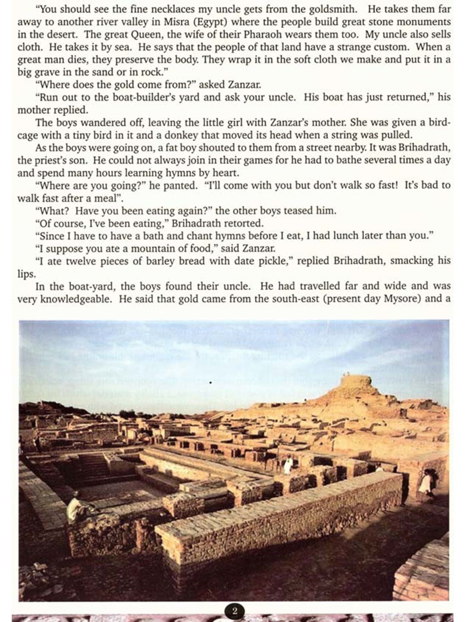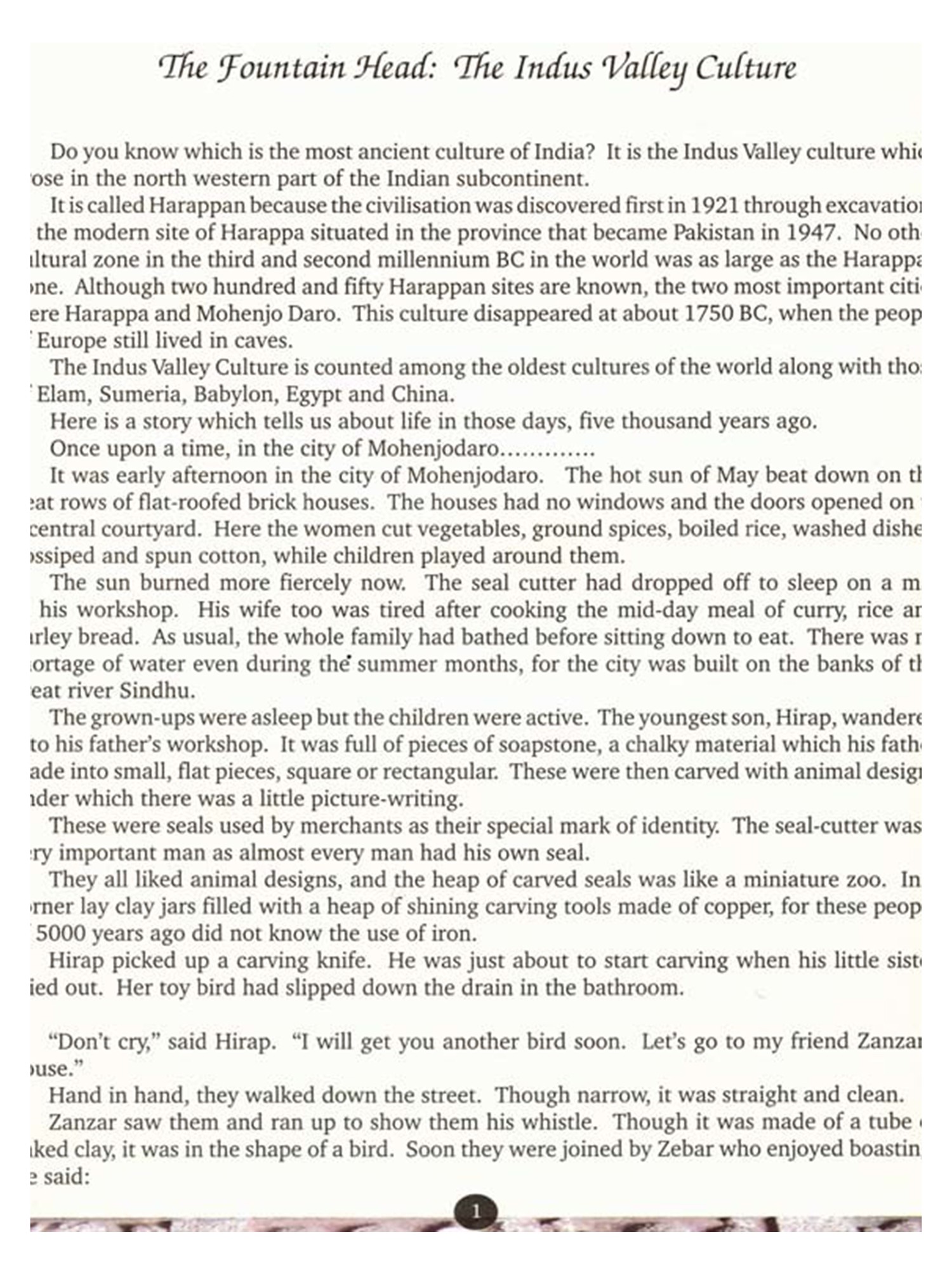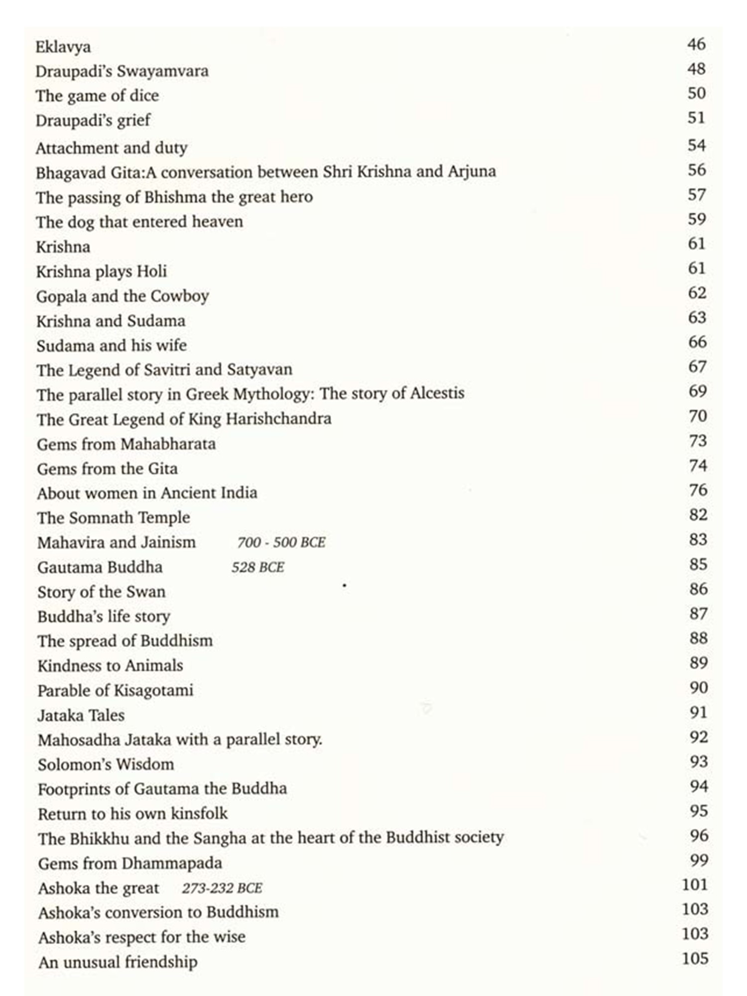 Both Fountain Heads-the Indus Culture as well as the Dravidian stream are described in this book. The Greek and Persian influences on the Indian way of life are clearly shown. We can find in there eternal legends known in the countries of the Diaspora e.g. Savitri and Satyawan, Eklavya, Shrawan Kumar, Raja Harishchandra; the classical Jataka tales and stories from the Panchatantra; the role of the temple in Ancient India; the Sangam literature; the Buddhist heritage and the spread of Buddhist doctrines from India to China as described in the tre records of the Chinese pilgrims Faxian and Xuanzang as well as those of Megasthenes Alexander the Great. The book ends with the Arabs who introduced Islam in India, with tales from the Arabian Nights and folk tales from various parts of the country.