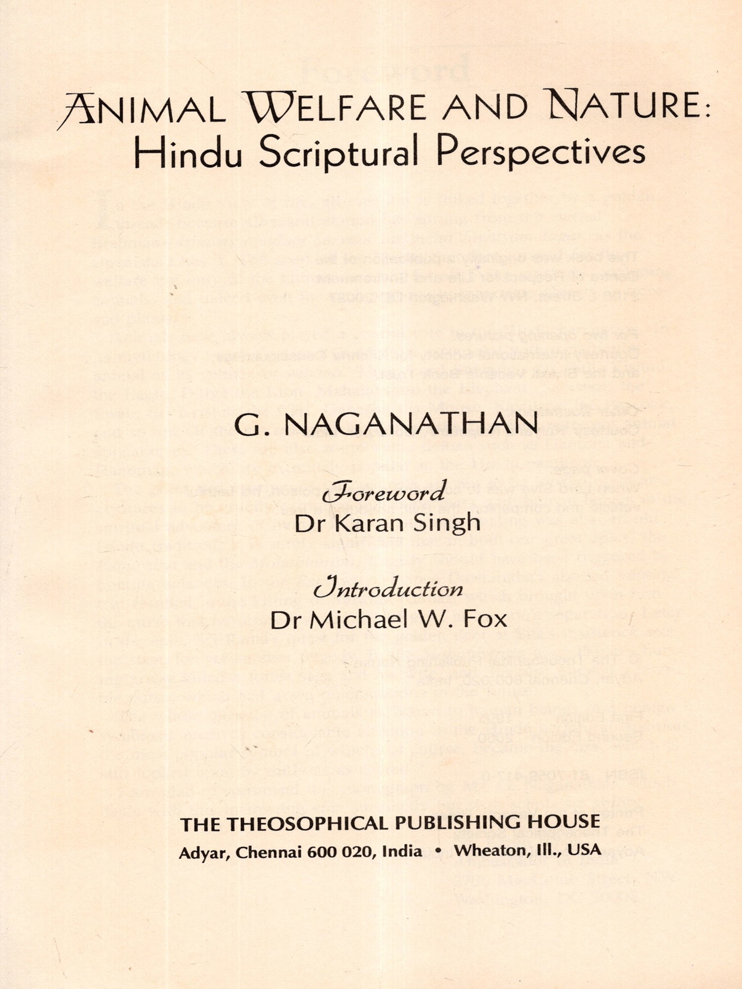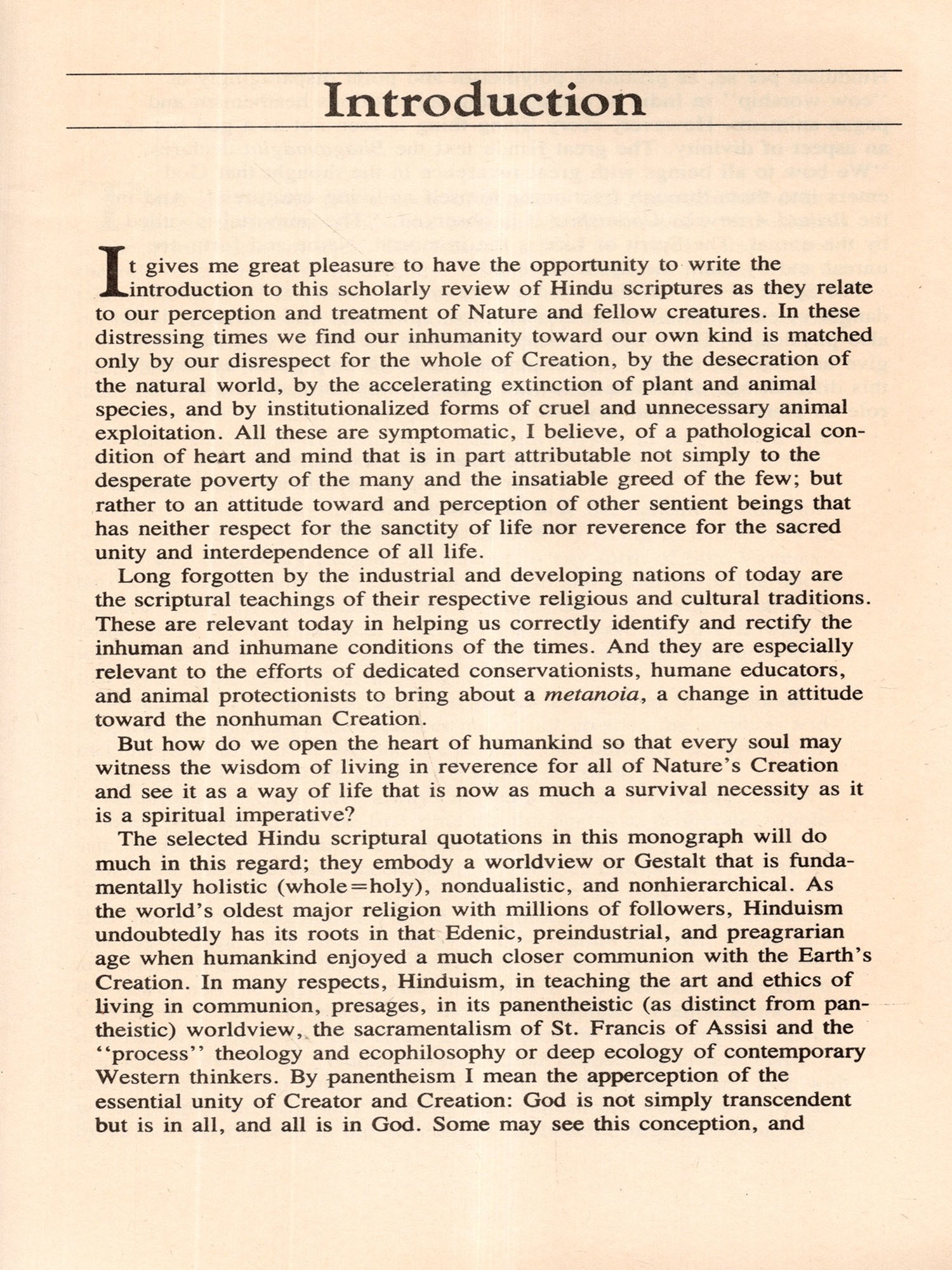 It gives me great pleasure to have the opportunity to write the introduction to this scholarly review of Hindu scriptures as they relate to our perception and treatment of Nature and fellow creatures. In these distressing times we find our inhumanity toward our own kind is matched only by our disrespect for the whole of Creation, by the desecration of the natural world, by the accelerating extinction of plant and animal species, and by institutionalized forms of cruel and unnecessary animal exploitation. All these are symptomatic, I believe, of a pathological condition of heart and mind that is in pan attributable not simply to the desperate poverty of the many and the insatiable greed of the few; but rather to an attitude toward and perception of other sentient beings that has neither respect for the sanctity of life nor reverence for the sacred unity and interdependence of all life.