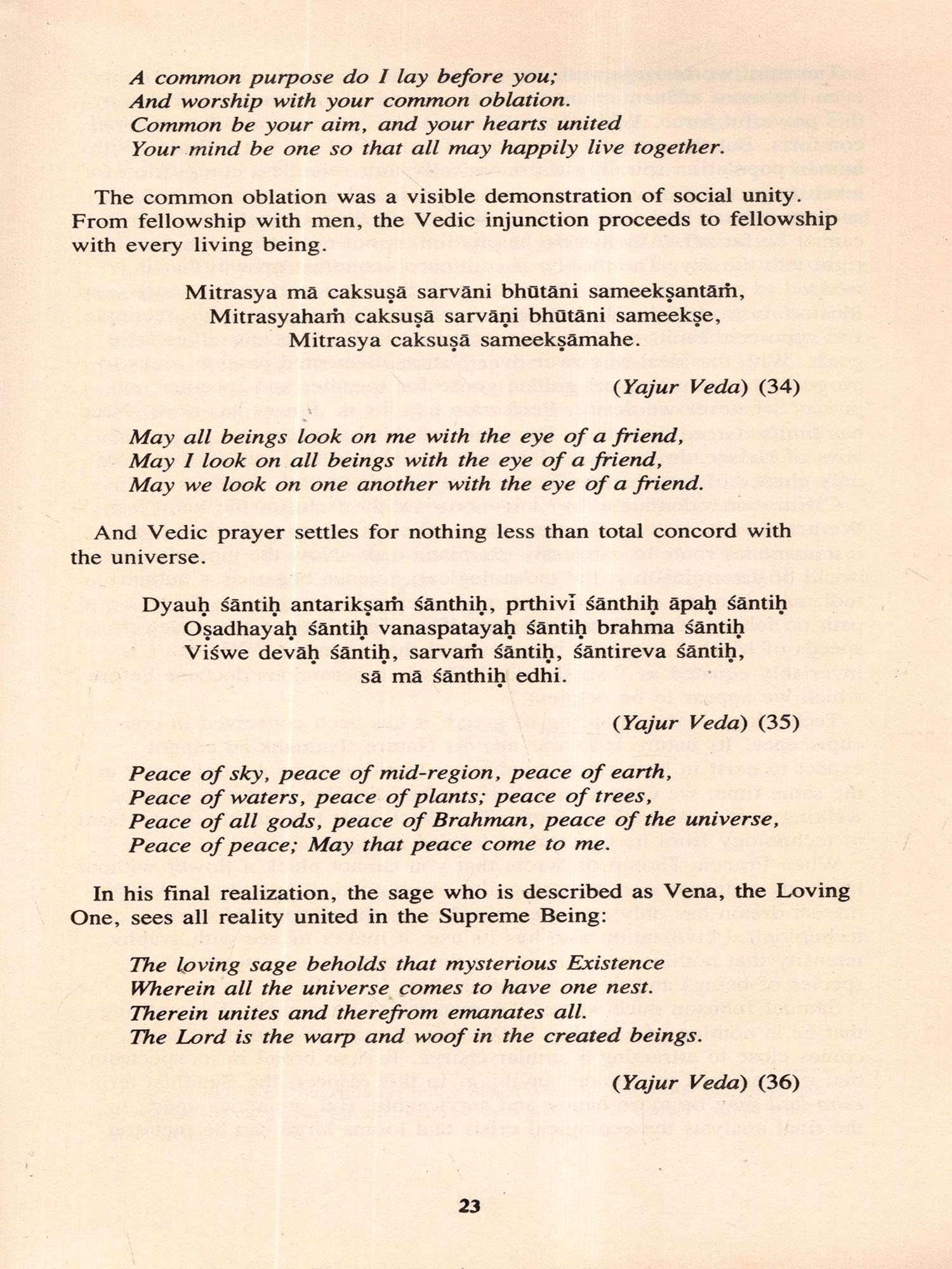 In the Hindu view of life, all creation is linked together by a golden thread, because all manifestation has sprung from the eternal Brahman—Ishavasyarnidam Sarvam Yatkincha Jagatyam Jagat, as the Upanishad has it. The seers of the Vedas, therefore, prayed for the welfare not only of the human race but for all living creatures, including animals, and indeed even for such apparently inanimate objects as trees and plants.