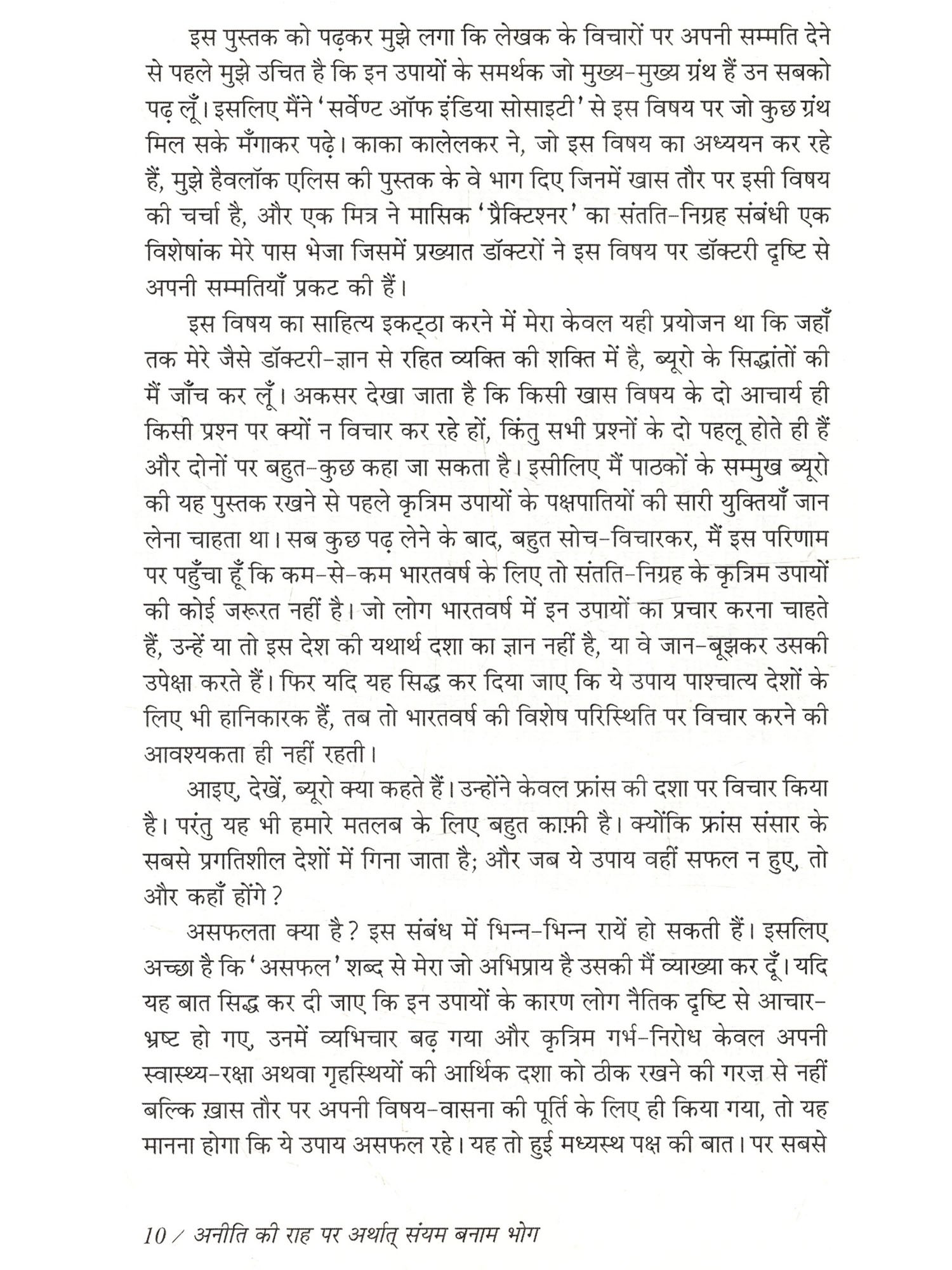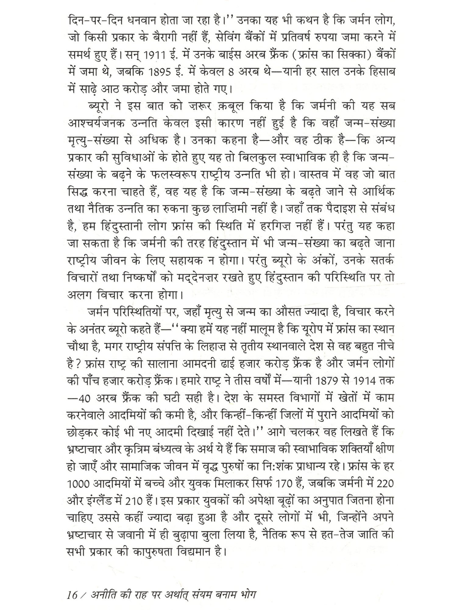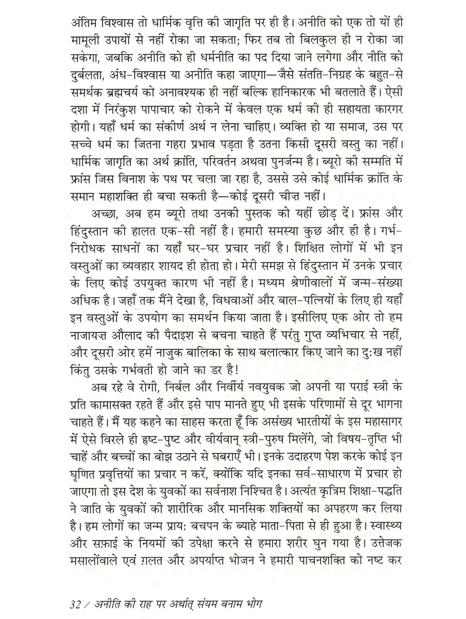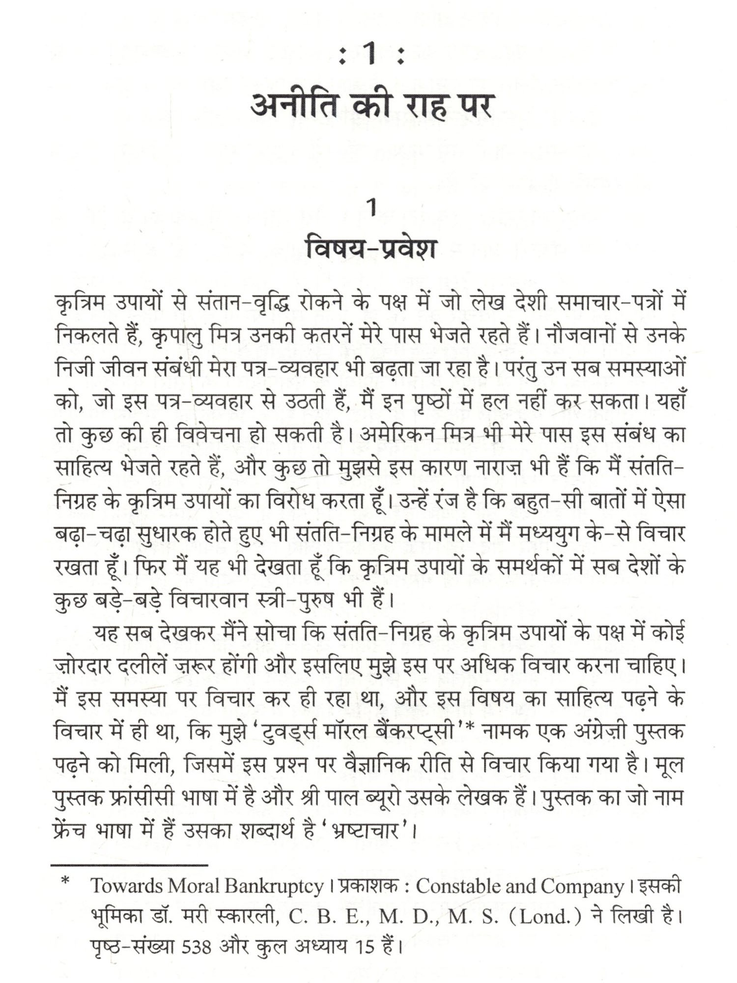 नीति अनीति का विषय ऐसा नहीं जो रुपए आने-पाई में आँका जा सके, बल्कि जीवन का शाश्वत धर्म है। जो व्यक्ति या राष्ट्र विवेक पूर्वक इसका निर्णय करके नीति-मार्ग पर चलता और अनीति के रास्ते से बचता है, वही सच्चा ज्ञानी है और वही खुद ऊँचा उठता तथा दुनिया को ऊँचा उठाता है। इसके विपरीत, अपने अज्ञान से, या जानते हुए भी अमल करने का आलस्य करके, अथवा अपने अहंकार में सत्यमार्ग की उपेक्षा करके, अनीति या असंयम का रास्ता पकड़ता है, वह आगे-पीछे खुद तो गड्ढे में गिरता ही है, साथ ही सृष्टि को भी पीछे की ओर ढकेलता है। नीति-अनीति का या ज्यादा व्यापक रूप में कहें तो सत्-असत् का संघर्ष सदा ही चलता रहता है। इसमें जो जितना ऊँचा उठता है वह उतना ही पहुँचा हुआ है, वही श्रेष्ठ पुरुष या महात्मा है। इसके विपरीत जो जितना नीचे जाता है, वह उतना ही 'साधारण' है; और जो ज्यादा नीचा चला जाए उसे दुनिया पापी कहती है। इसीलिए हरेक का फ़र्ज है कि वह नीति के महत्त्व को समझे और अपने से आगे बढ़े हुओं के अनुभव से प्रोत्साहन पाकर अपने प्रयत्न से उसके मार्ग पर अग्रसर हो। इसके लिए इस संबंधी प्रामाणिक पुस्तकों का अध्ययन और मनन बहुत बड़ा सहारा है। कहना नहीं होगा कि' अनीति की राह पर' एक ऐसा ही सहारा है। आधुनिक युग के सबसे बड़े नीतिवादी महात्मा गांधी के लेखों के इस संग्रह की लोकप्रियता इसी से सिद्ध है कि इसका पुनः पुनः पुनर्मुद्रण होता रहा है। जिस उत्साह से पाठकों ने इसे अपनाया, उससे प्रेरित होकर इसे लगातार परिवर्द्धित एवं संशोधित करके और ज्यादा व्यापक एवं उपयोगी बनाने का प्रयत्न उनके जीवन काल में ही किया गया। इसके गुजराती व अंग्रेजी के नए-से-नए संस्करणों में जो-जो नए अध्याय व परिशिष्ट मिले प्रायः वे सब भी इसमें जोड़े जाते रहे। काफी समय तक अप्राप्य रहने के पश्चात इसे पुनर्मुद्रित किया जा रहा है। आशा है पाठक समाज में इसका स्वागत होगा।