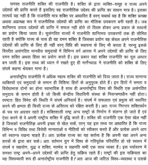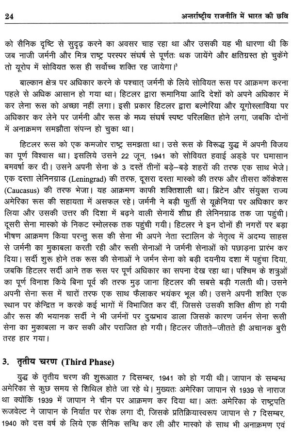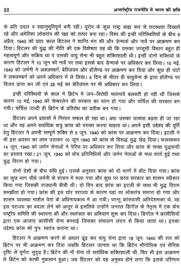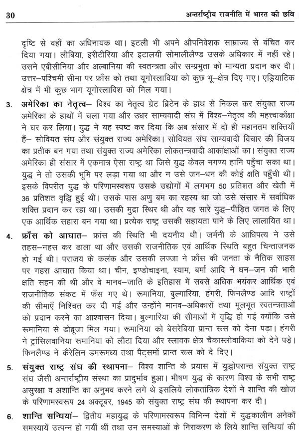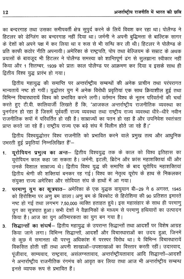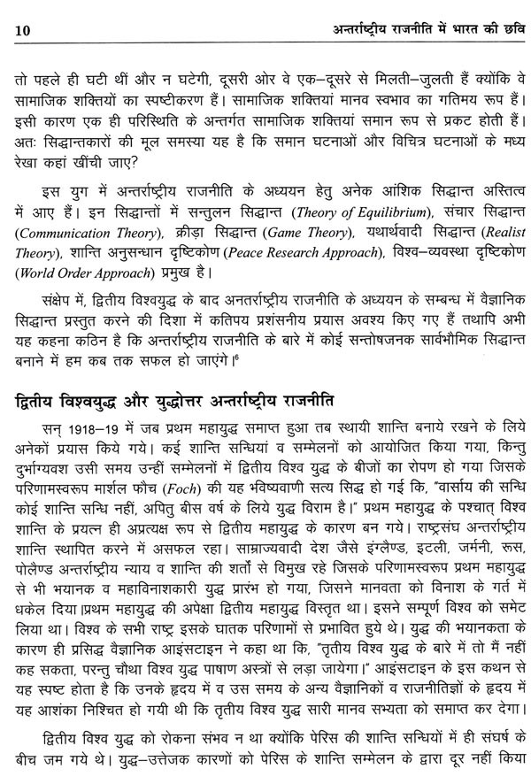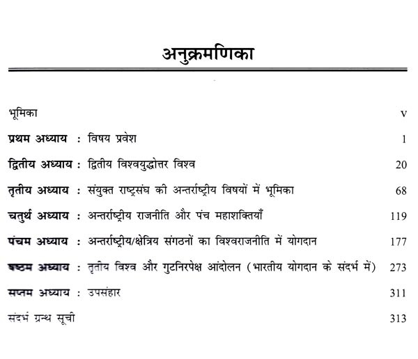 प्रस्तुत पुस्तक की रचना झारखण्ड, बिहार जैसे सीमित साधन वाले राज्यों एवं विभिन्न राष्ट्रीय स्तर के विश्वविद्यालयों के पाठ्यक्रम को ध्यान में रखते हुए की गई है। यह पुस्तक हिन्दी माध्यम के छात्रों, शोधार्थियों एवं सिविल सेवा की तैयारी हेतु उपयोगी सिद्ध होगी। राजनीति विज्ञान विषय के अन्तर्गत इसमें भारत के साथ-साथ अन्य राष्ट्रों के घरेलू एवं वैदेशिक मामलों की जानकारी मिलती है। प्रस्तुत पुस्तक में कुल सात तर्गत अन्तर्राष्ट्रीय राजनीति को समझना एक दिलचस्प विषय है। अध्याय सम्मिलित हैं। प्रथ प्रथम अध्याय में अन्तर्राष्ट्रीय राजनीति की सर्वप्रमुख पंक्ति- "अन्तर्राष्ट्रीय राजनीति शक्ति की राजनीति है"- इस पर आधारित है। राजनीति शक्ति के लिए संघर्ष है। शक्ति प्रत्यक्ष तथा अप्रत्यक्ष रूप में राजनीतिक उद्देश्यों की प्राप्ति का मौलिक उपकरण बनी रहती है। द्वितीय विश्वयुद्ध के बाद युरोपियन प्रभाव का अन्त हुआ और विश्व कई ध्रुवीय शक्तियों में परिवर्तित हो गया। द्वितीय अध्याय में दूसरे विश्वयुद्ध के प्रमुख परिणामों में भयंकर आर्थिक एवं जान-माल की क्षति, राष्ट्रवाद का उदय उदय शांति संधियों का क्रम एवं प्रजातंत्र व समाजवाद को बढ़ावा, शीतयुद्ध का प्रारंभआदि का उल्लेख है। तृतीय अध्याय के अन्तर्गत संयुक्त राष्ट्र संघ की अंतर्राष्ट्रीय विषयों में भूमिका का उल्लेख किया गया है। इस अध्याय में परमाणु परीक्षणों को निषेध किया जाना आदि शामिल है। है। चतुर्थ अध्याय में अंतर्राष्ट्रीय राजनीतिक और पंच महाशक्तियों के उभरते प्रभाव को दर्शाया गया है। अमेरिका, रूस, ब्रिटेन, फ्रांस एवं चीन- पंच महाशक्तियों का विश्व के सामाजिक, आर्थिक, राजनीतिक मंच पर प्रभाव छोड़ना आदि का उल्लेख है। पंचम अध्याय में विभिन्न अंतर्राष्ट्रीय / क्षेत्रीय संगठनों का विश्व राजनीति में योगदान को दिखाया गया है। षष्टम अध्याय के अन्तर्गत तृतीय विश्व को गुट निरपेक्ष आंदोलन (भारतीय योगदान के संदर्भ में) को उल्लेखनीय रूप में बताया गया है। भारत का गुटनिरपेक्ष आंदोलन के अग्रणी राष्ट्रों के नेतृत्वकर्ता राष्ट्र के रूप में जो योगदान है उसको बतलाने की कोशिश रही है। अंतिम अध्याय के रूप में उपसंहार पाठ है जिसमें द्वितीय विश्वयुद्ध के बाद के अंतर्राष्ट्रीय राजनीति में यूरोप का निःशक्त होना, विश्व का द्वि-ध्रुवीय (रूस एवं अमेरिका) के रूप में उभरना, शीतयुद्ध की समाप्ति, निर्गुट आंदोलन में भारत की शांतिदूत की भूमिका इत्यादि सम्मिलित हैं। आशा करती हूँ कि यह पुस्तक पाठकों के द्वारा सराही जाएगी। पाठकों से आशा करती हूँ कि आपकी सफलता में यह पुस्तक महत्वपूर्ण भूमिका अदा करेगी, तथा पुस्तक में किसी त्रुटि के लिये क्षमा प्रार्