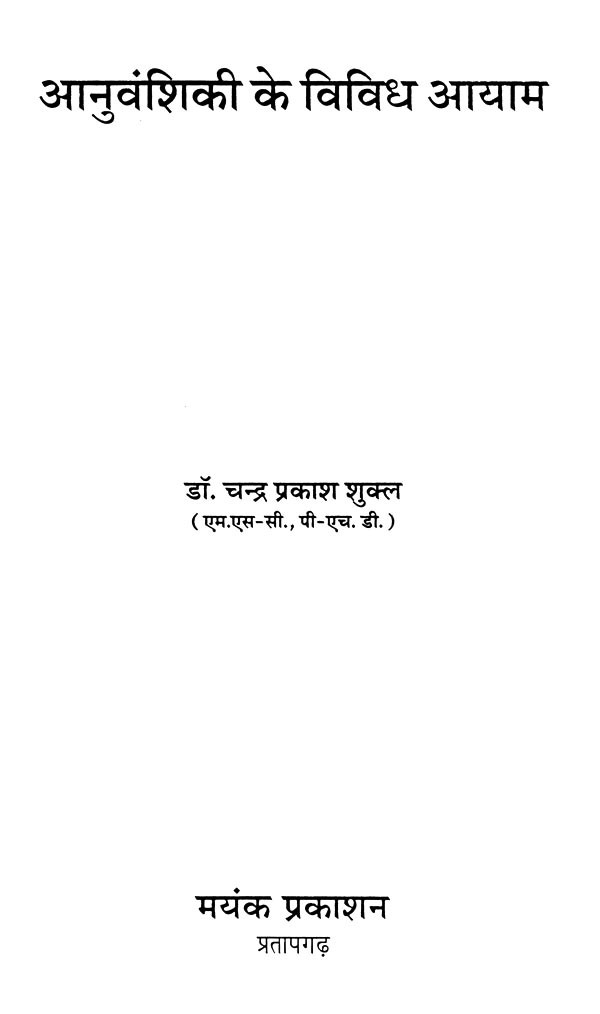 यह पुस्तक 'आनुवंशिकी के विविध आयाम' विज्ञान तथा कृषि वर्ग से जुड़े पाठकों के लिए उपयोगी होगी। पुस्तक की भाषा-शैली सरल, प्रवाहमयी तथा वैज्ञानिक है।