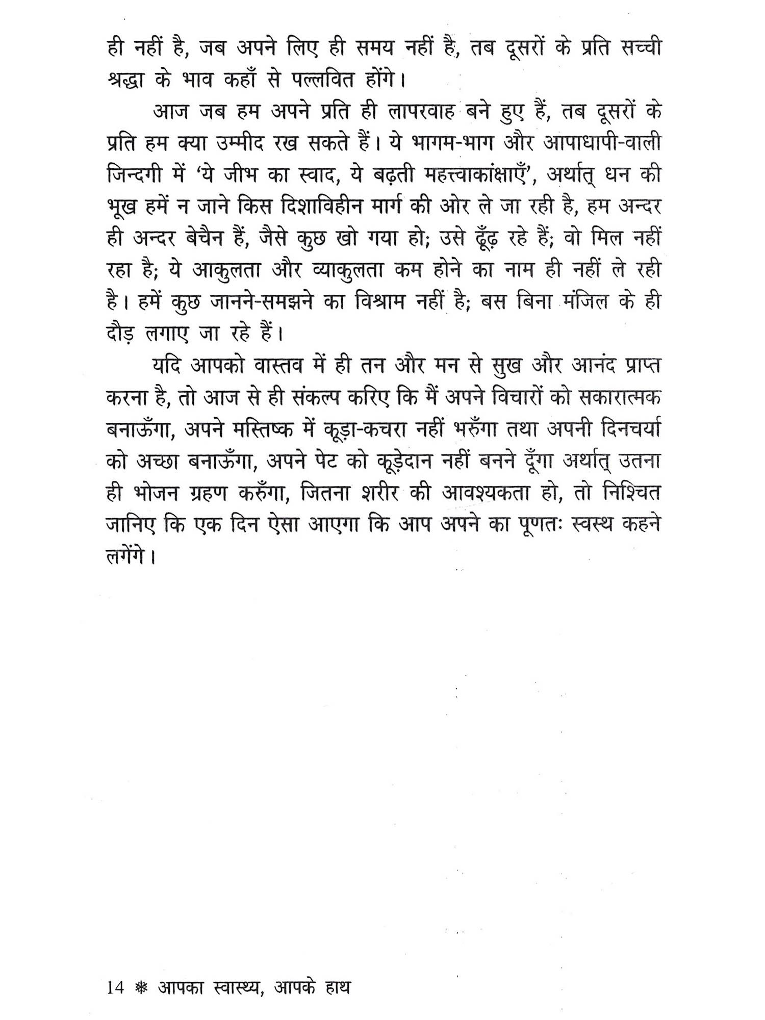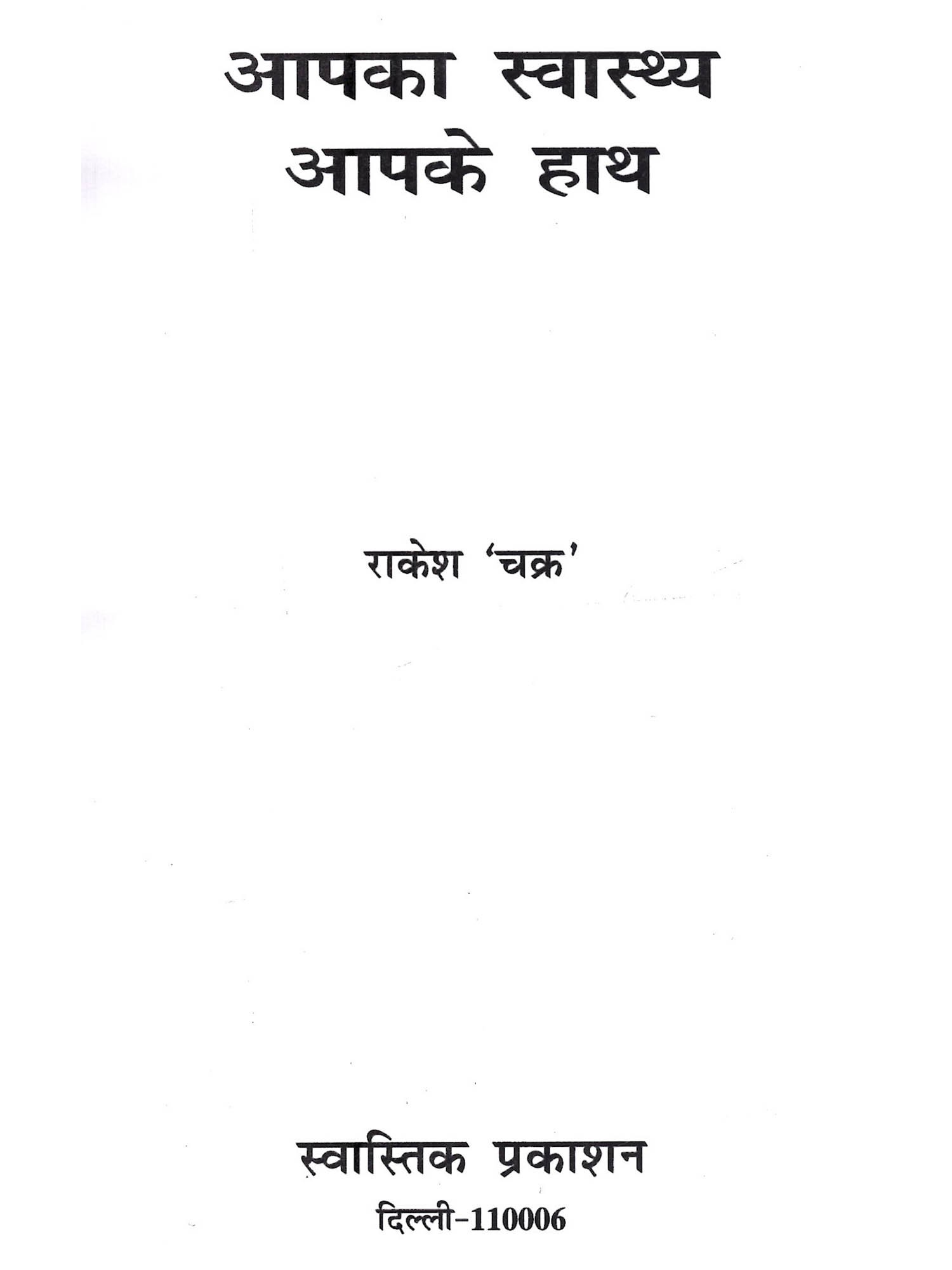 आज भारत क्या, विश्व के अधिकांशतः मनुष्य ही यह कहने की स्थिति में नहीं है कि वे यह कह सकें, 'कि हम पूर्णतः स्वस्थ है।' कोई तन से अस्वस्थ है, तो कोई मन से । पूर्ण स्वस्थ कहने या कहलवाने का वही अधिकारी है, जिसके तन और मन में आशा और विश्वास की गंगा चिर-प्रवाहमान् हो, हिमालय-सी गम्भीरता और हरियाली हो, उगते सूर्य-सी आभा और लाली हो तथा सुख और दुख में समता भी पाली हो, अतः विरले मनुष्य ही प्रकाश को लेकर खोजने से मिलेंगे कि जो मजबूती से कह सकें, 'कि हम पूर्णतः स्वस्थ हैं।' यदि आपको वास्तव में ही पूर्ण स्वस्थ रहना है तो यह पुस्तक आपको जीवन में नया आयाम देगी तथा आत्म-विश्वास से जीने की कला सिखाएगी और आपका जीवन की बीमारियों का बहाना लेकर बोझ-सा नहीं ढोना पड़ेगा। आप सबके लिए समग्र स्वास्थ्य की यह पुस्तक 'आपका स्वास्थ्य, आपके हाथ' इसी उद्देश्य को लेकर ही लिखी गई है।