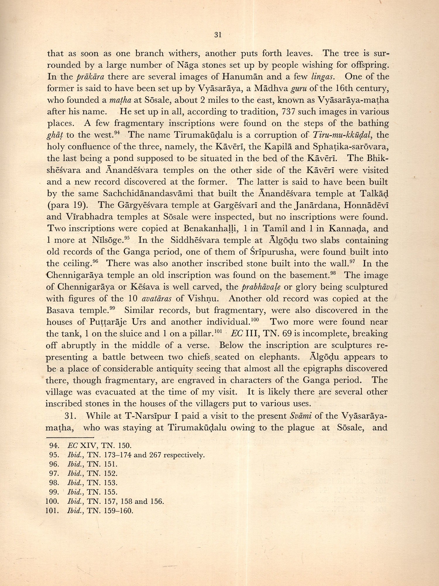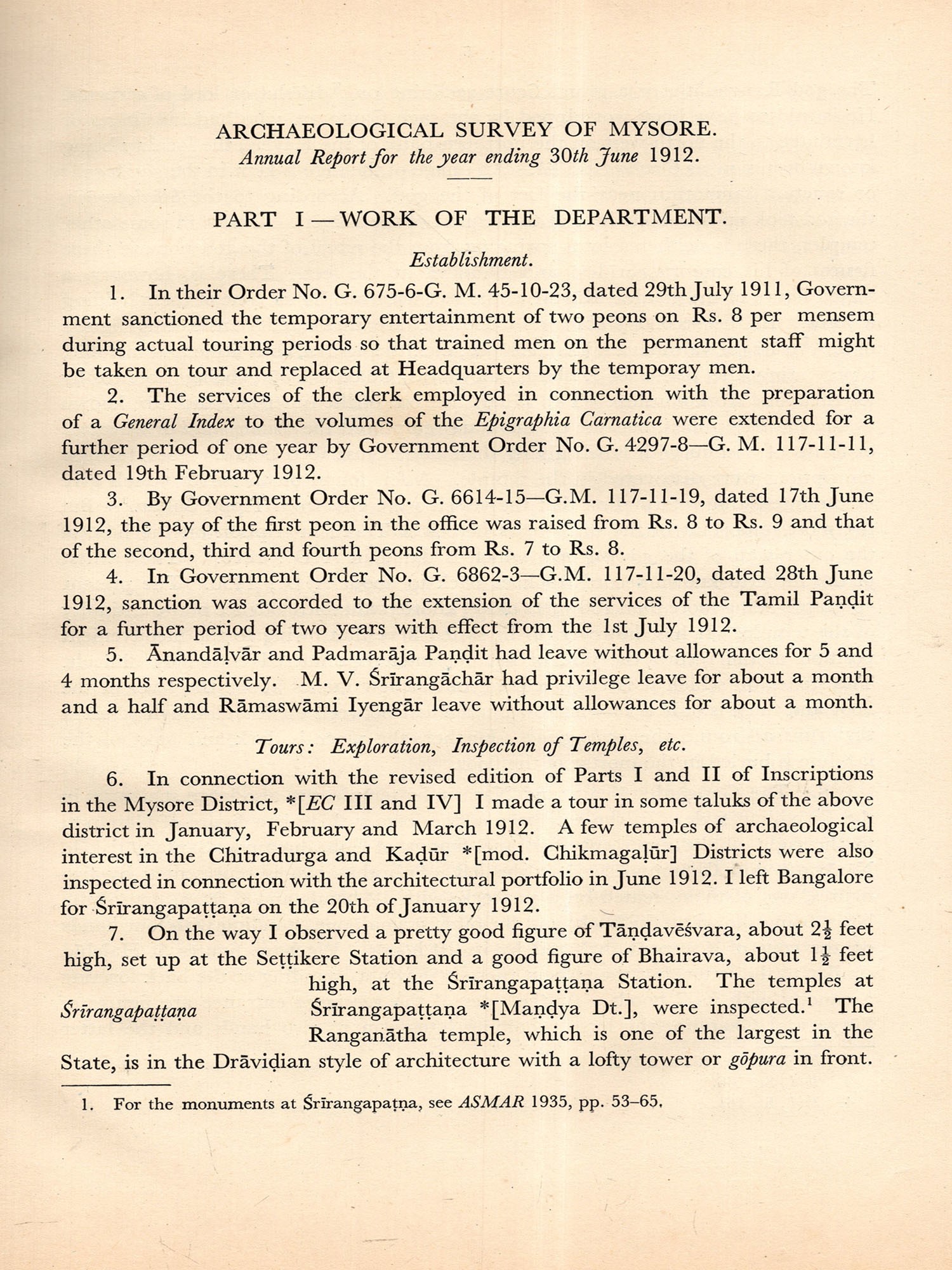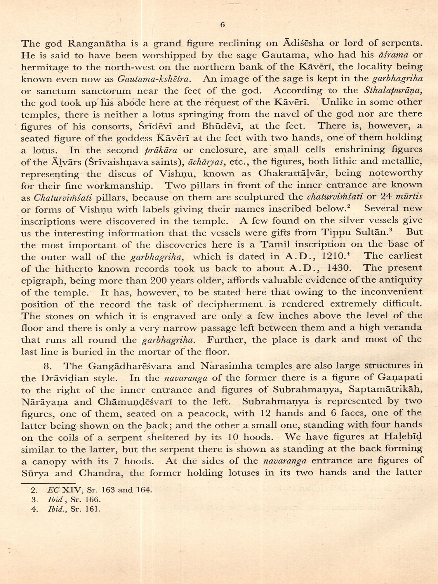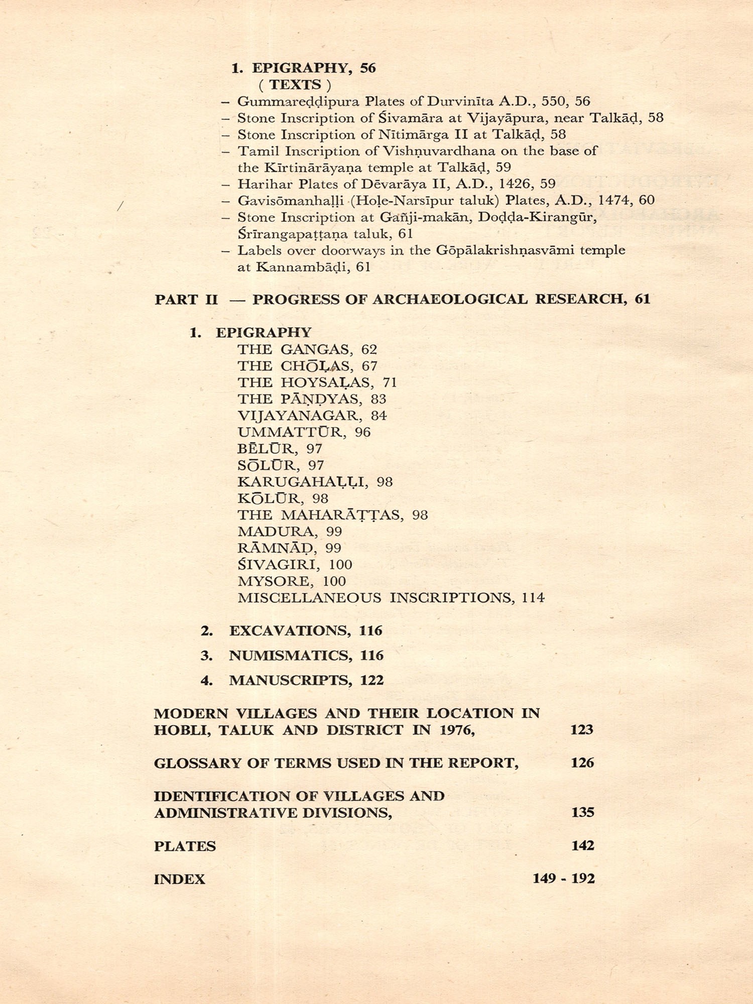 3. As with the diacritical marks, the original reporters followed no uniform method with regard to the italicisation of local and technical terms, as well as of titles of books, journals and manuscripts. For example, terms like dandanayaka, sukhanasi, mantapa are italicised on several pages; on several others, they are not. Similar disparities can be found in the spelling of literary works, (See, Karnataka Sabdanusasana). We have tried to bring about some uniformity in the use of these terms and names; however, in cases where the context is somewhat ambiguous (e.g., Janana-Manțap), we have retained the original, for we could not always be certain whether italicisation was desirable or not. We have been also forced to allow some words and names to appear in multiple ways. For example, matha, dannayaka etc., are italicised where they appear as independent terms, but not when they are part of names, e.g., Ankle-Matha, Amitaya-dannayaka, etc.