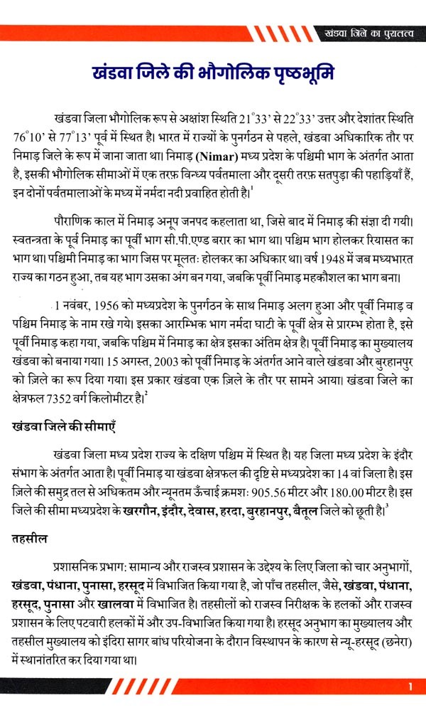 भारतीय इतिहस, संस्कृति एवं पुरातत्व के क्षेत्र में खंडवा जिले का स्थान महत्वपूर्ण रहा है। खंडवा जिले की ऐतिहासिक पृष्ठभूमि में पाषाणकाल से लेकर आधुनिक काल तक की संस्कृति के अनवरत प्रमाण प्रकाश में आये है। महाभारत काल में यह भू-भाग विदर्भ का अंग था, सतपुड़ा पर्वत की श्रेणियों की तलहटी में विस्तृत खंडवा जिला नर्मदा ताप्ती नदी का सिंचित क्षेत्र है। नन्द व मौर्य काल में यह भू-भाग अन्य क्षेत्रों की तरह मगध साम्राज्य का अंग था। गुंगकाल में पुष्यमित्र शुंग के ज्येष्ठ पुत्र विदिशा के प्रान्तपाल अग्निमित्र ने विदर्भ को पराजित कर विदर्भ का विभाजन करा दिया था। कालिदास कृत मालविकाग्निमित्रम् में अग्निमित्र के विदर्भ युद्ध का विवरण दिया गया है। ईसा पूर्व की प्रथम शताब्दी में सातवाहनों का अभ्युदय हुआ। कुषाणों एवं शक क्षत्रपों से निरंतर सघर्ष रहने के बाद भी सातवाहनों का इस भूभाग पर अधिपत्य बना रहा। इसके पश्चात् वाकाटक, राष्ट्रकूट, परमार, मांडव सुल्तानों का शासन रहा। इस अंतराल में बड़े पैमाने पर निर्माण कार्य हुए। इनमें खंडवा जिले के दूरस्थ अंचलों में हुये निर्माण कार्यों के अवशेषों को चिन्हित करने के लिये संचालनालय पुरातत्व, अभिलेखागार एवं संग्रहालय म.प्र. भोपाल द्वारा ग्राम से ग्राम सर्वेक्षण कार्य कराया गया। सर्वेक्षण कार्य में प्राचीन मंदिर, मूतिया, किले, गढ़ी, महल, छत्री, मस्जिद, मकबरे, बावड़ी आदि का चिन्हांकन कर विस्तृत प्रतिवेदन तैयार कराया गया। इन्हीं प्रतिवेदनों के विवरण को इस पुस्तक का रूप प्रदान किया गया।