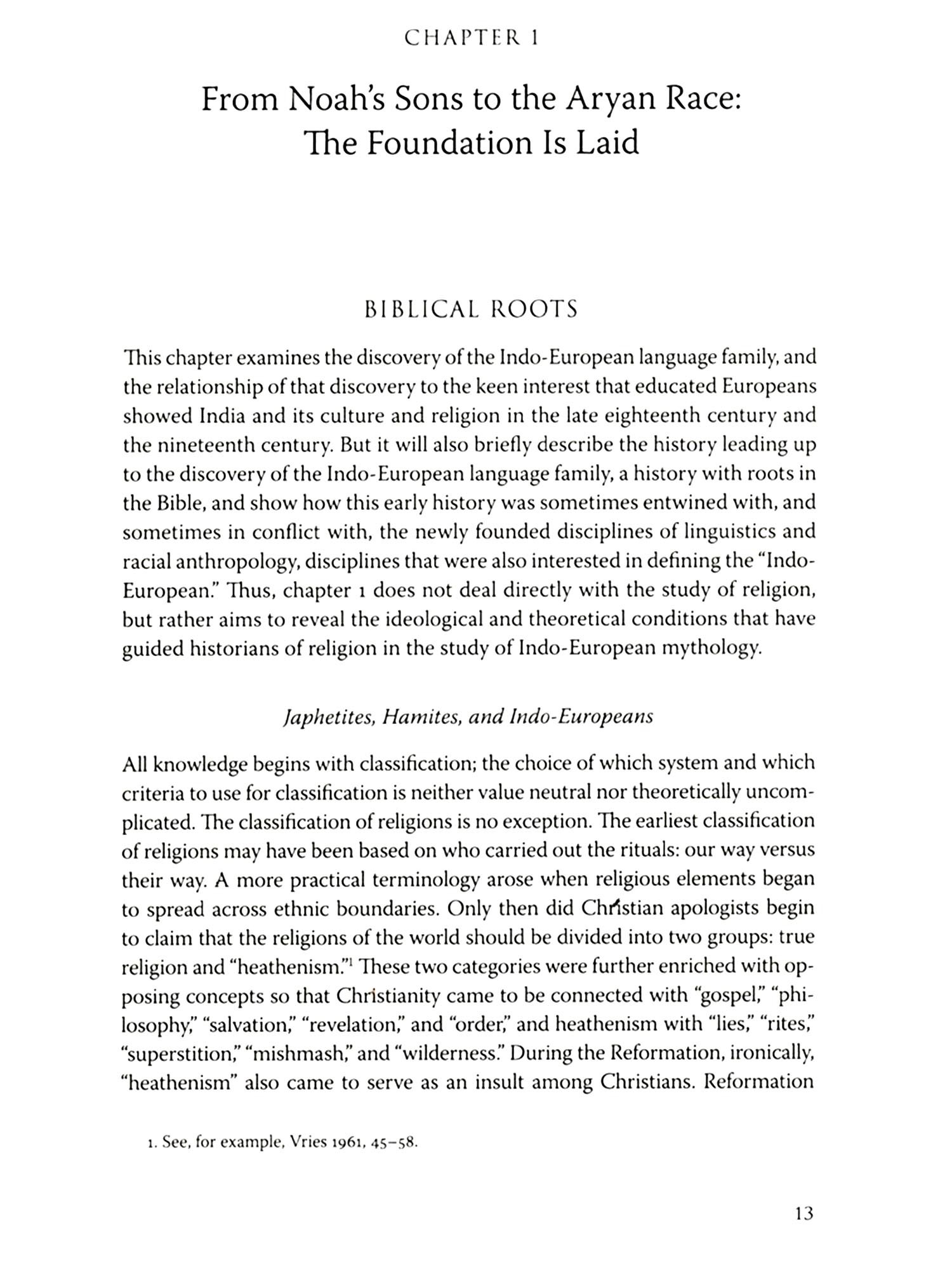For over two hundred years, a series of historians, linguists, folklorists, and archaeologists have tried to re-create a lost culture. Using ancient texts, medieval records, philological observations, and archaeological remains, they have described a world, a religion, and a people older than the Sumerians, with whom all history is said to have begun. Those who maintained this culture have been called "Indo-Europeans" and "Proto-Indo-Europeans," "Aryans" and "Ancient Aryans," "Japhetites," and "wiros," among many other terms. These people have not left behind any texts, no objects can definitely be tied to them, nor do we know any "Indo-European" by name. In spite of that, scholars have stubbornly tried to reach back to the ancient "Indo-Europeans," with the help of bold historical, linguistic, and archaeological reconstructions, in the hopes of finding the foundation of their own culture and religion there.