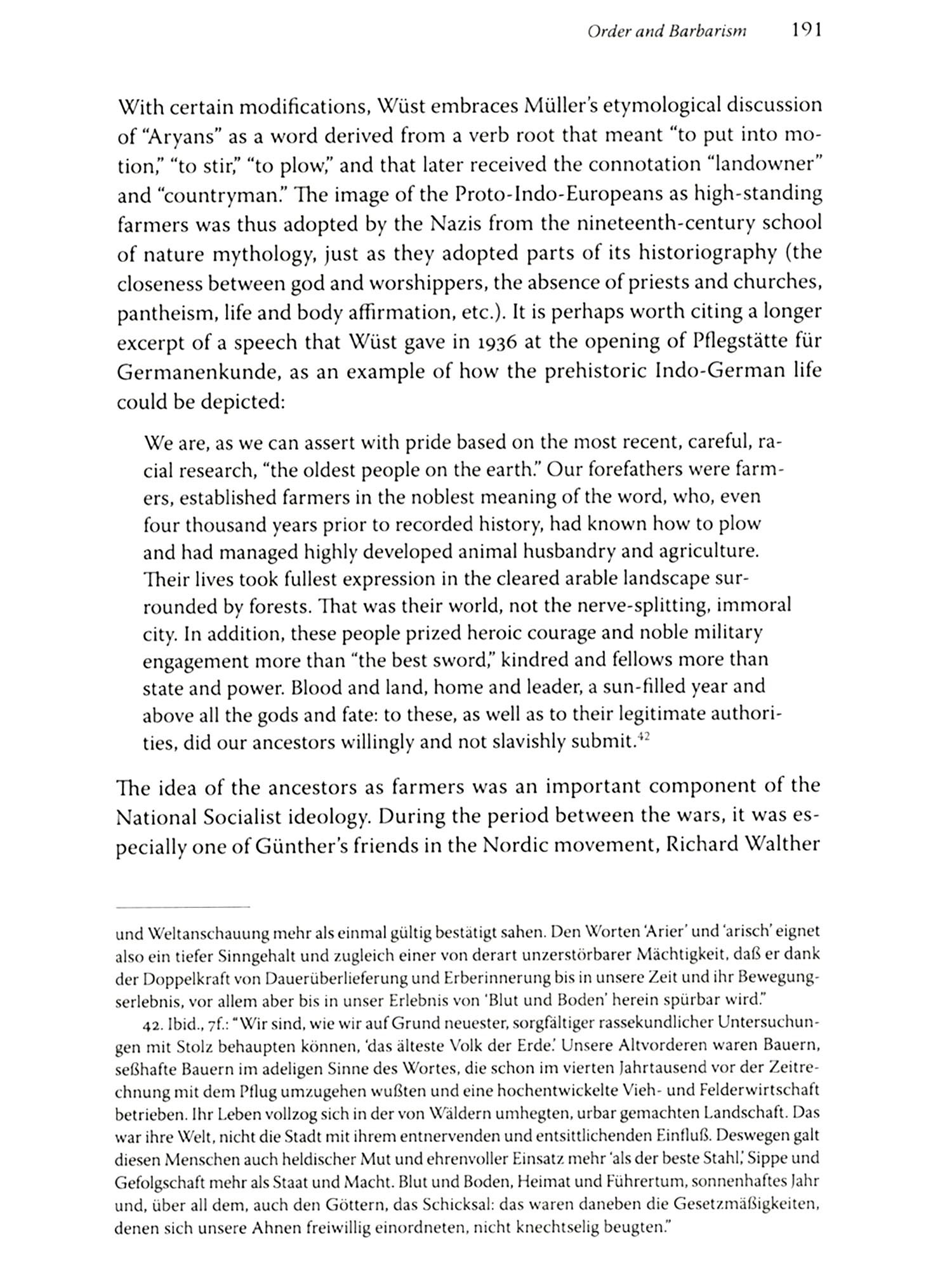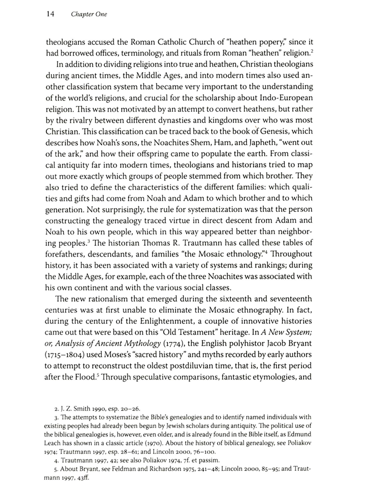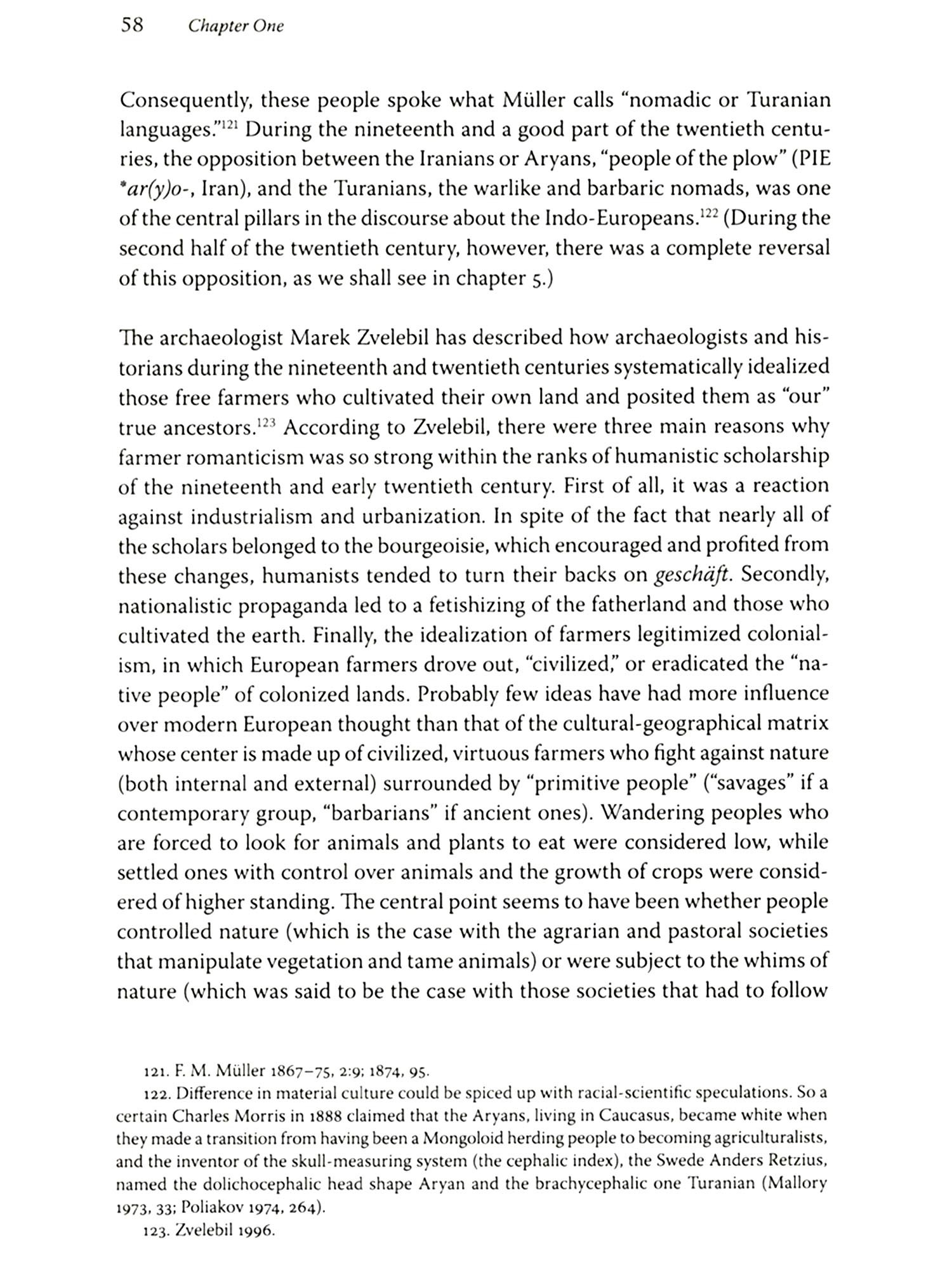 The fundamental thesis of this study is that these prehistoric peoples have preoccupied people in modern times primarily because they were, to use the words of Claude Lévi-Strauss, "good to think with," rather than because they were meaningful historical actors. The interest in the "Indo-Europeans," "Aryans," and their "others" (who have varied through history from Jews to savages, Orientals, aristocrats, priests, matriarchal peasants, warlike nomads, French liberals, and German nationalists), stemmed-and still stems-from a will to create alternatives to those identities that have been provided by tradition. The scholarship about the Indo-Europeans, their culture, and their religion has been an attempt to create new categories of thought, new identities, and thereby a future different from the one that seemed to be prescribed.