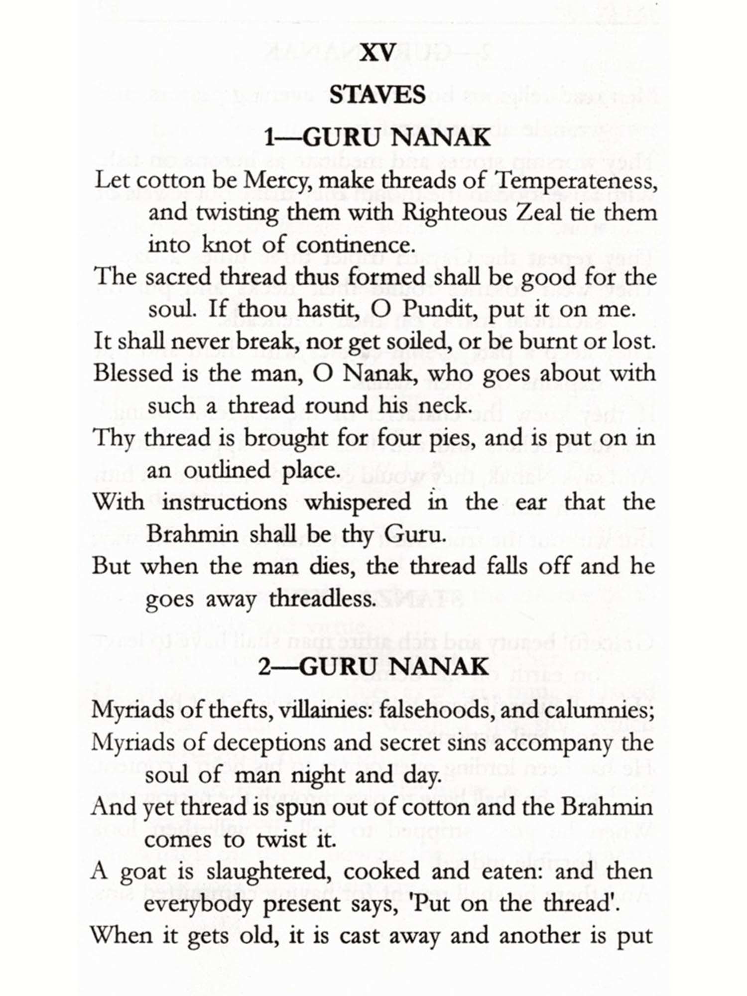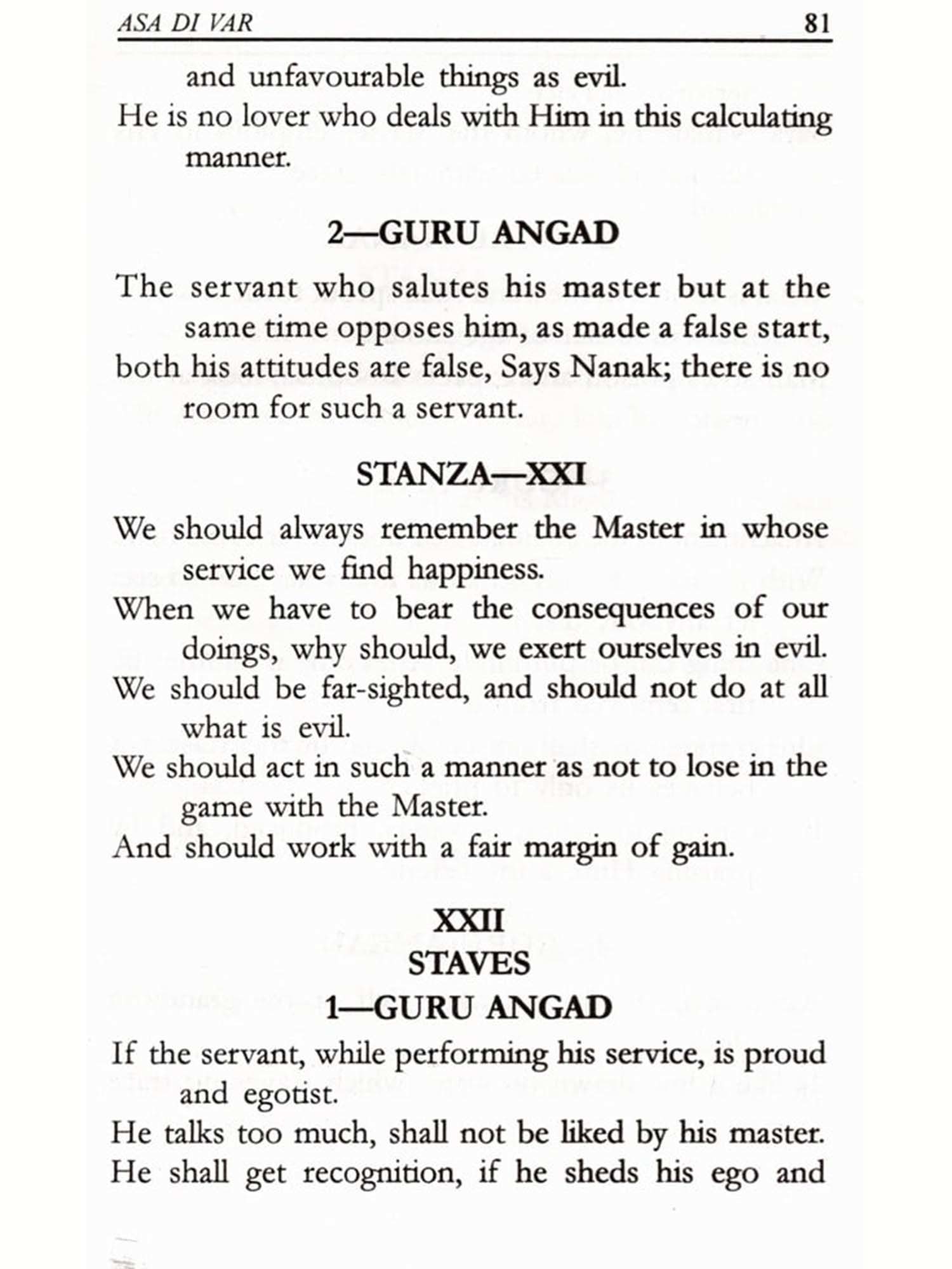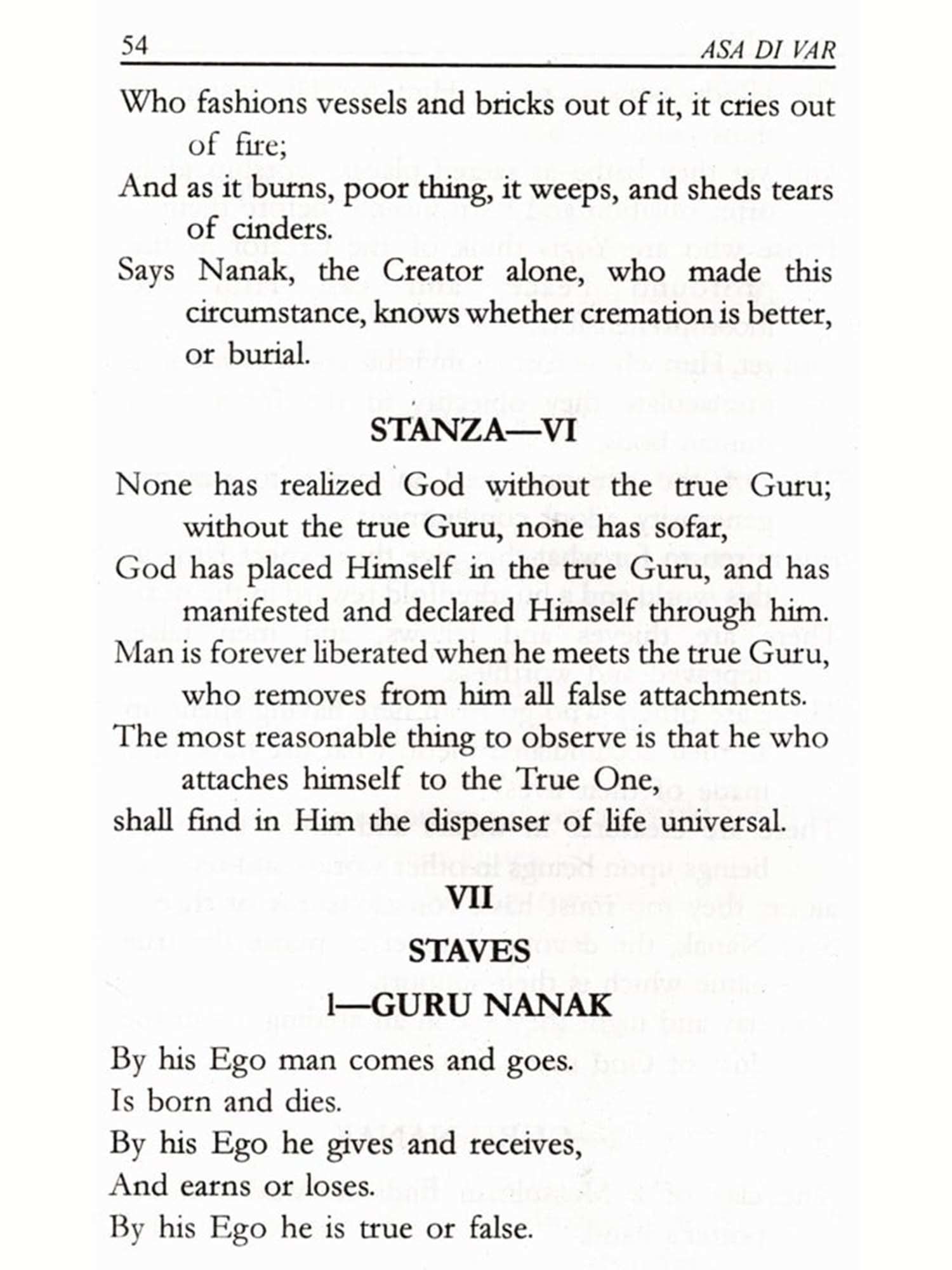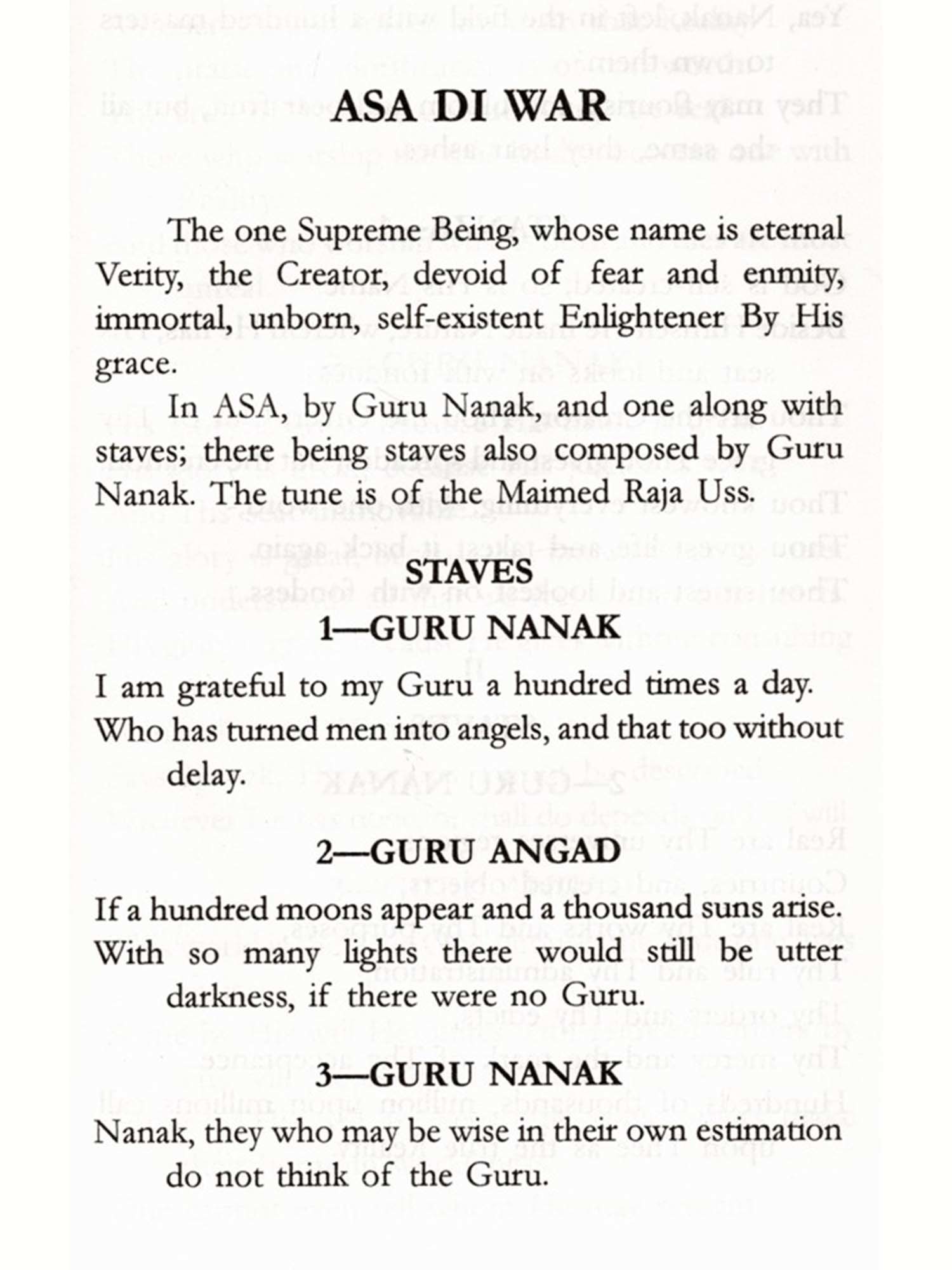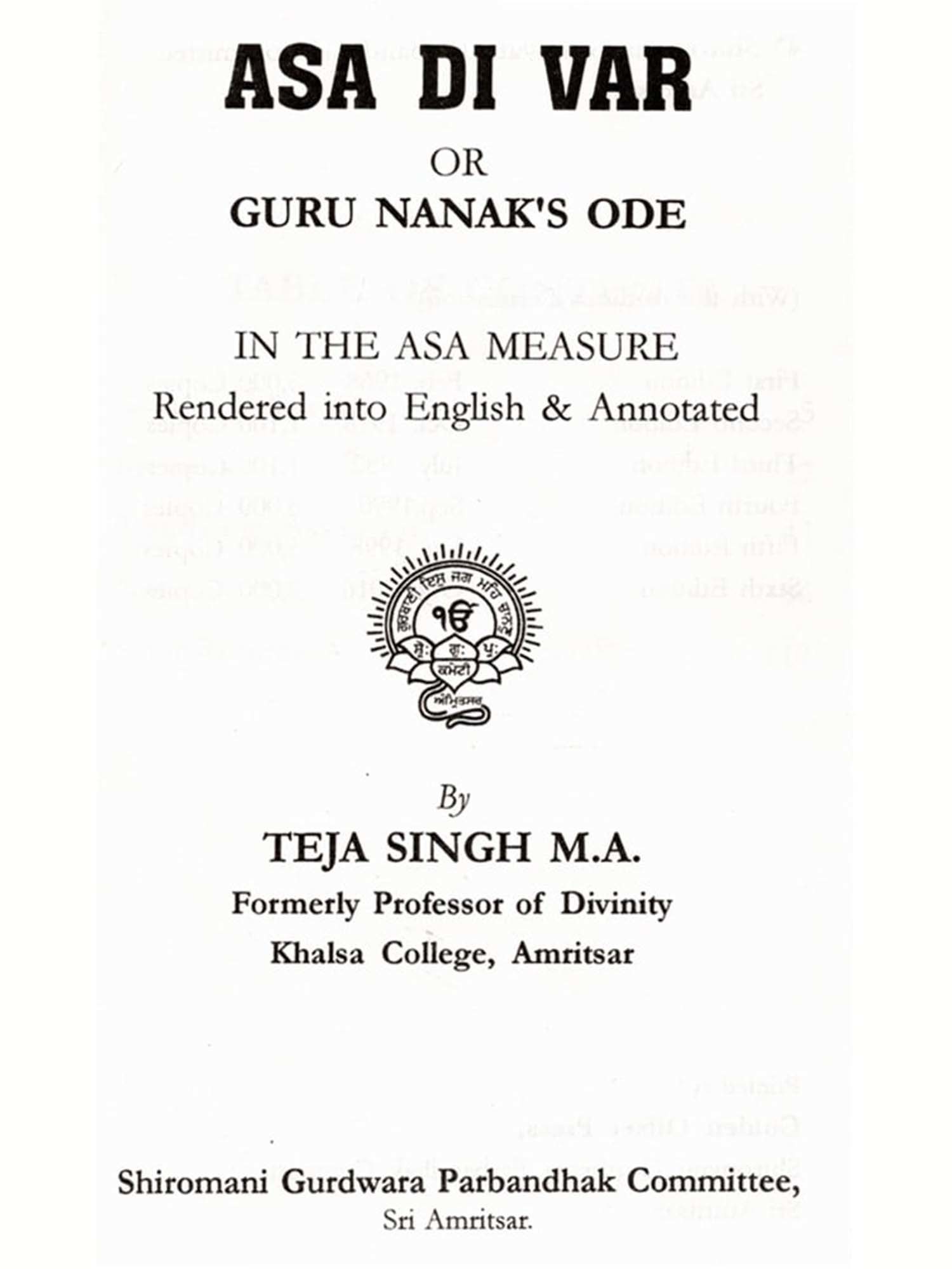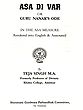 Asa di Var, or the Ode in the Asa measure is one of the three Punjabi odes of Guru Nanak, found in the Holy Granth, it forms the daily morning service of the Sikh congregations, and being in Asa, is sung before the early dawn. It consists of pauris and shlokas. Which I have chosen to call stanzas and staves. The stanzaic part is the essential part of the Ode, the staves being added to explain and introduce the stanzas. In Guru Nanak's time it consisted of twenty-four stanzas and forty-six staves, stanzas all of Guru Nanak. Then in the time of Guru Angad, or after, fourteen more staves were added from the compositions of Guru Angad. In spite of the passage being complete in themselves and some of them selected from other places, the whole is very artistically arranged, and in the method sequence, and coherence of thought, it is as perfect as the Japji. The stanzas express the ideas in general terms, while the staves illustrate them in descriptive terms, adducing examples from the particular customs and views prevailing at the time. To give a point to the main idea in stanza. The last line is short and epigrammatic.