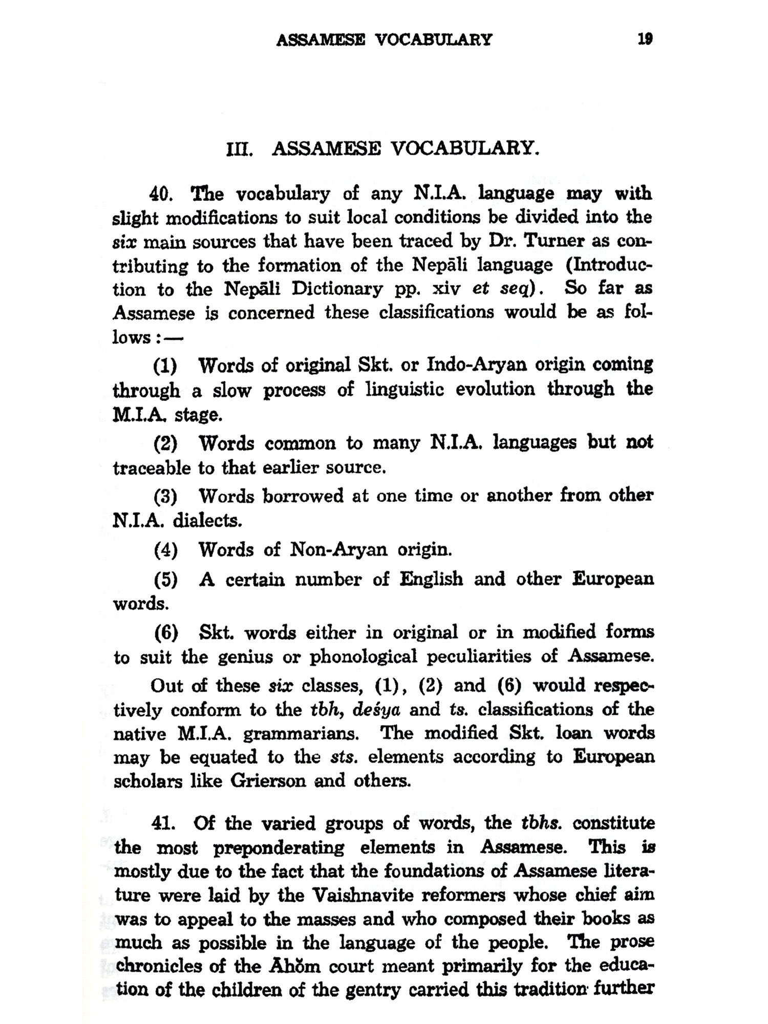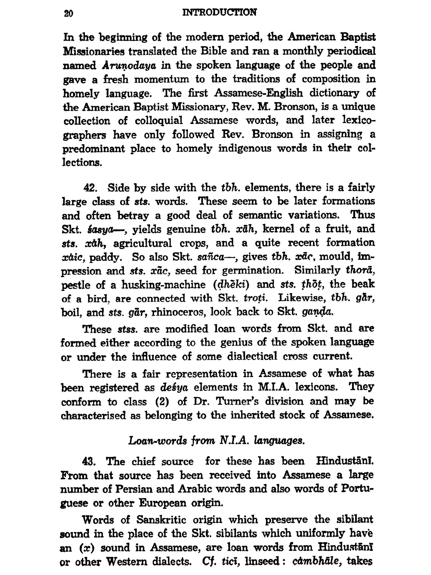 Even by itself Assamese has been very insufficiently examined. The first grammatical notice of Assamese was taken by Rev. N. Brown, in his Grammatical Notes on Assamese Language, 1848. These notes were primarily meant for the American Baptist Missionaries, and were accordingly short. Prof. Nicholl summarised the main features of spoken Assam-ese in his work Manual of the Bengali language including Assamese Grammar, in 1894. Two native grammarians, Hem Chandra Barua and Satyanatha Bara, wrote two grammars in Assamese; but good as these vernacular grammars are in their own way, they are elementary and meant for school boys, and are scarcely of any use to advanced students of historical grammar. In 1936, as these pages were being made ready for the press, was published Mr. Kaliram Medhi's Asamiya Vya karaņa āru Bhāşätatva, written in Assamese. It is an ambitious work and is supposed to be written on historical principles. But though it contains a mass of early Assamese forms, the mode of approach to the subject is far from scientific and it does not place this publication under any obligation.