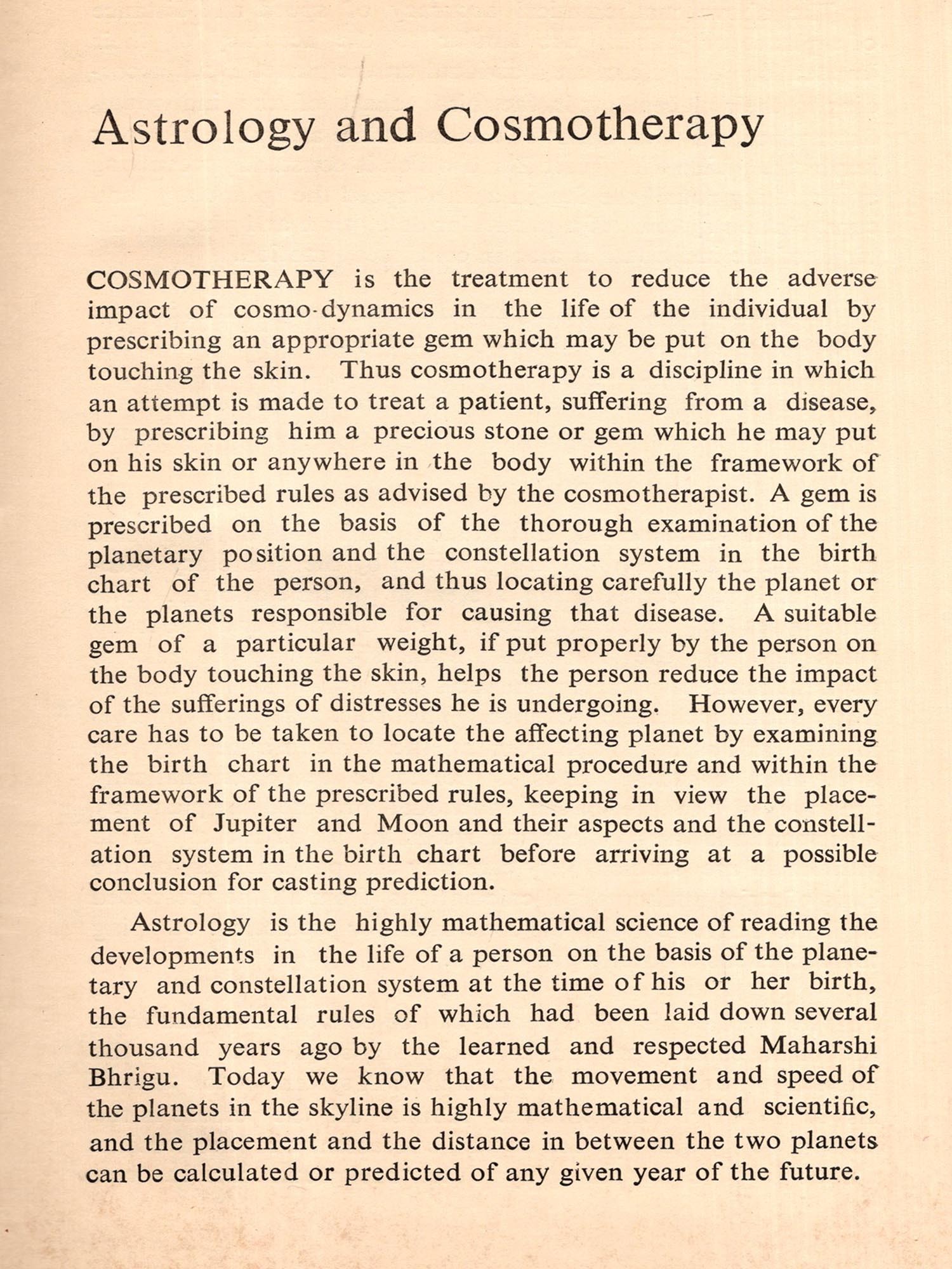 Thus Cosmotherapy is the treatment to reduce the adverse impact of cosmodynamics in the life of the individual by prescribing an appropriate gem which may be put on the body skin.