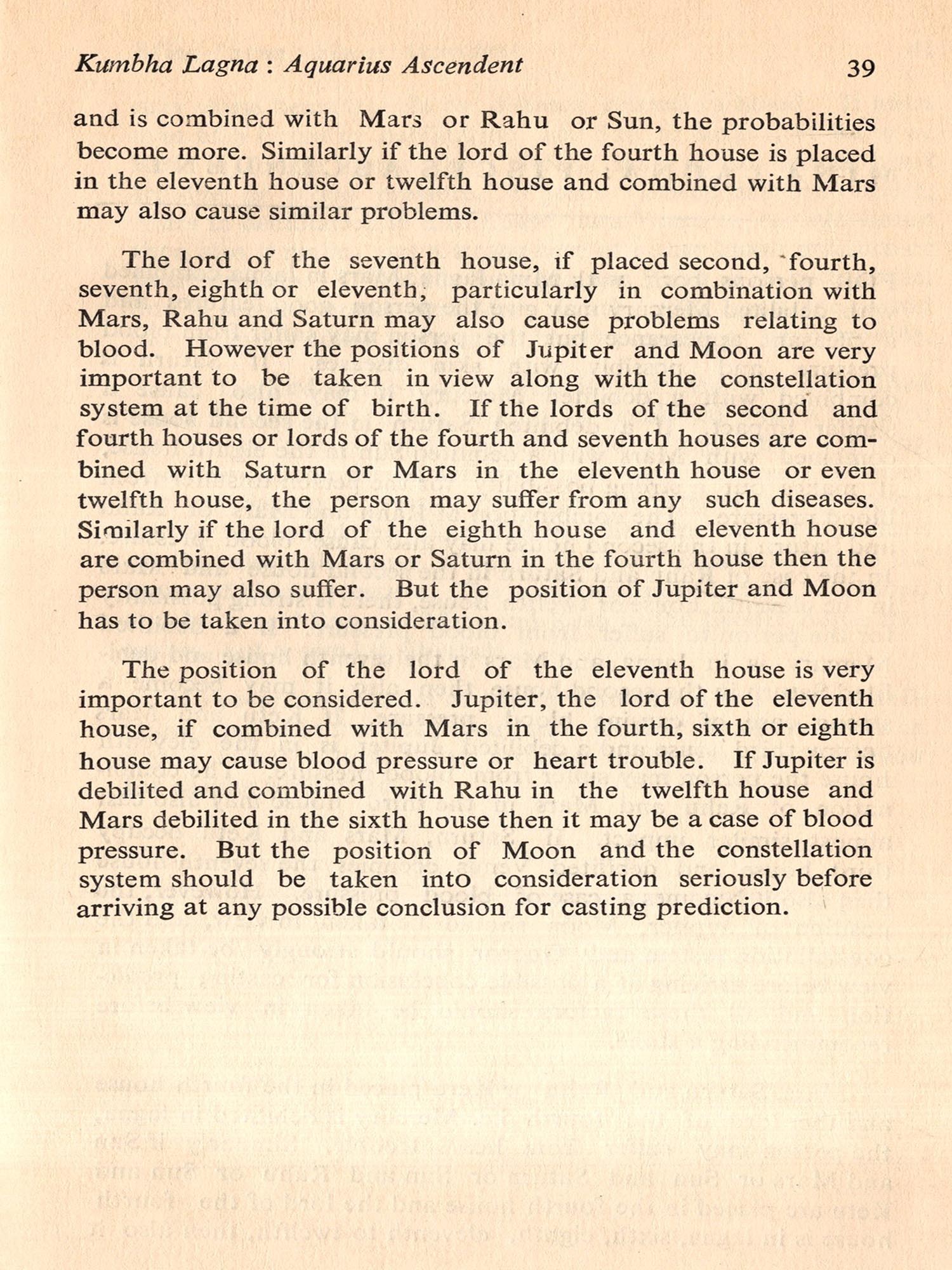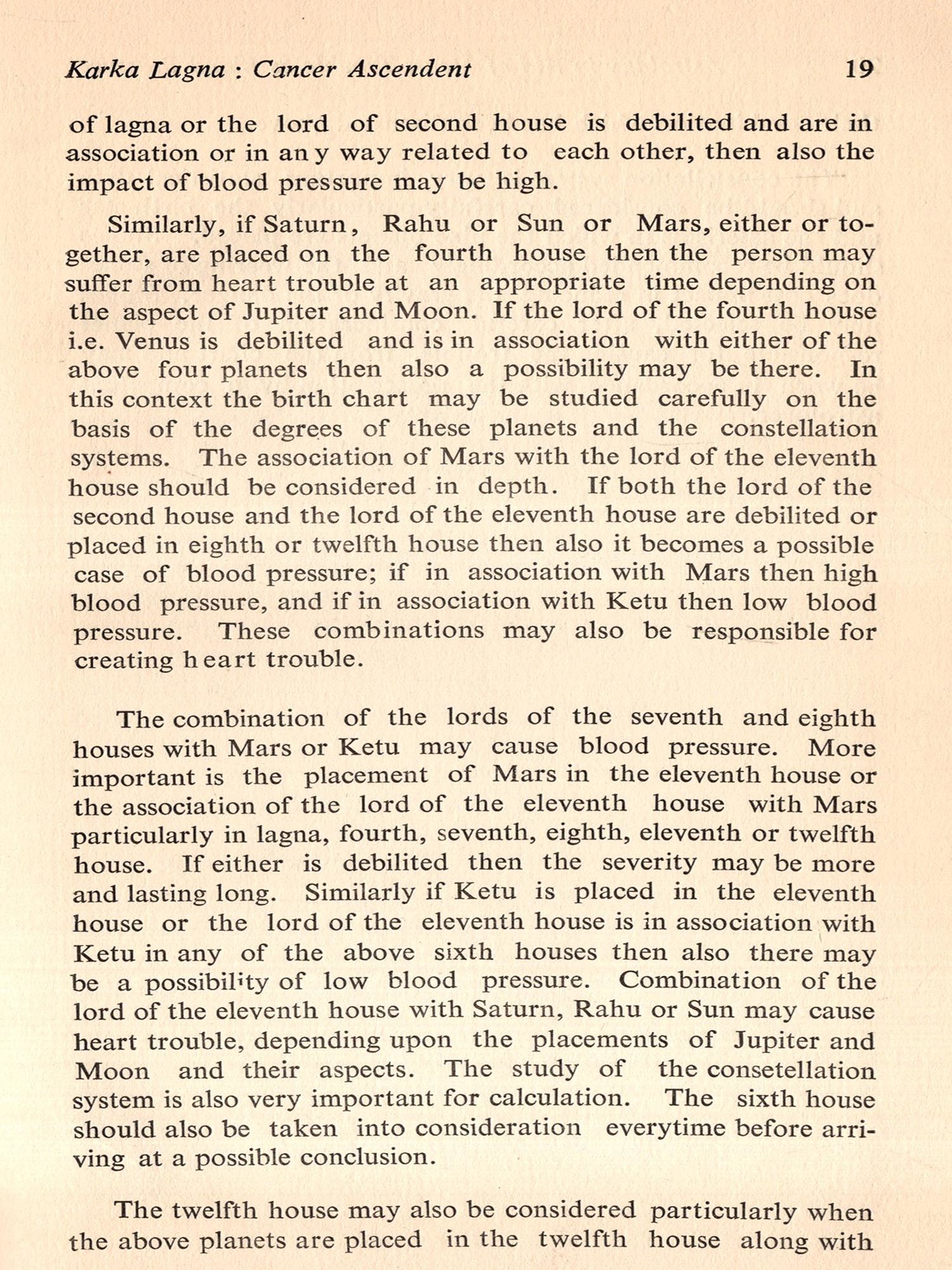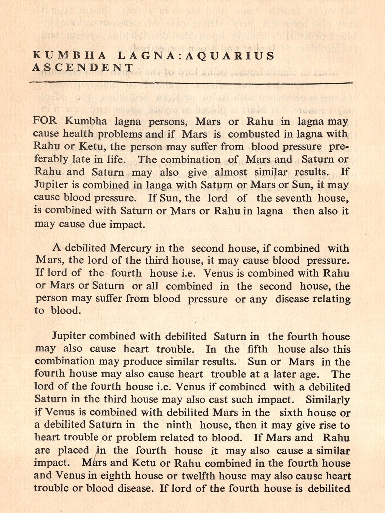 The author, while detailing 810 situations, explains the nature and extent of trouble particularly related to blood and heart diseases and holds the view that debilited or inimical Mars, Saturn, Sun, Rahu or Ketu either placed in or being lords of second, third. fourth, fifth, sixth, eighth and eleventh houses or adversely conjoin-ed, may be responsible for causing these diseases.