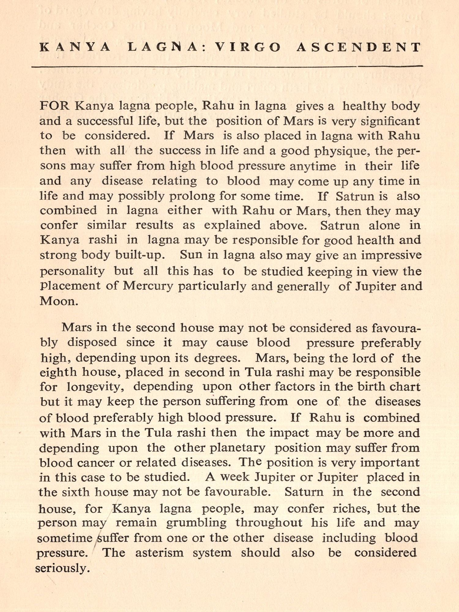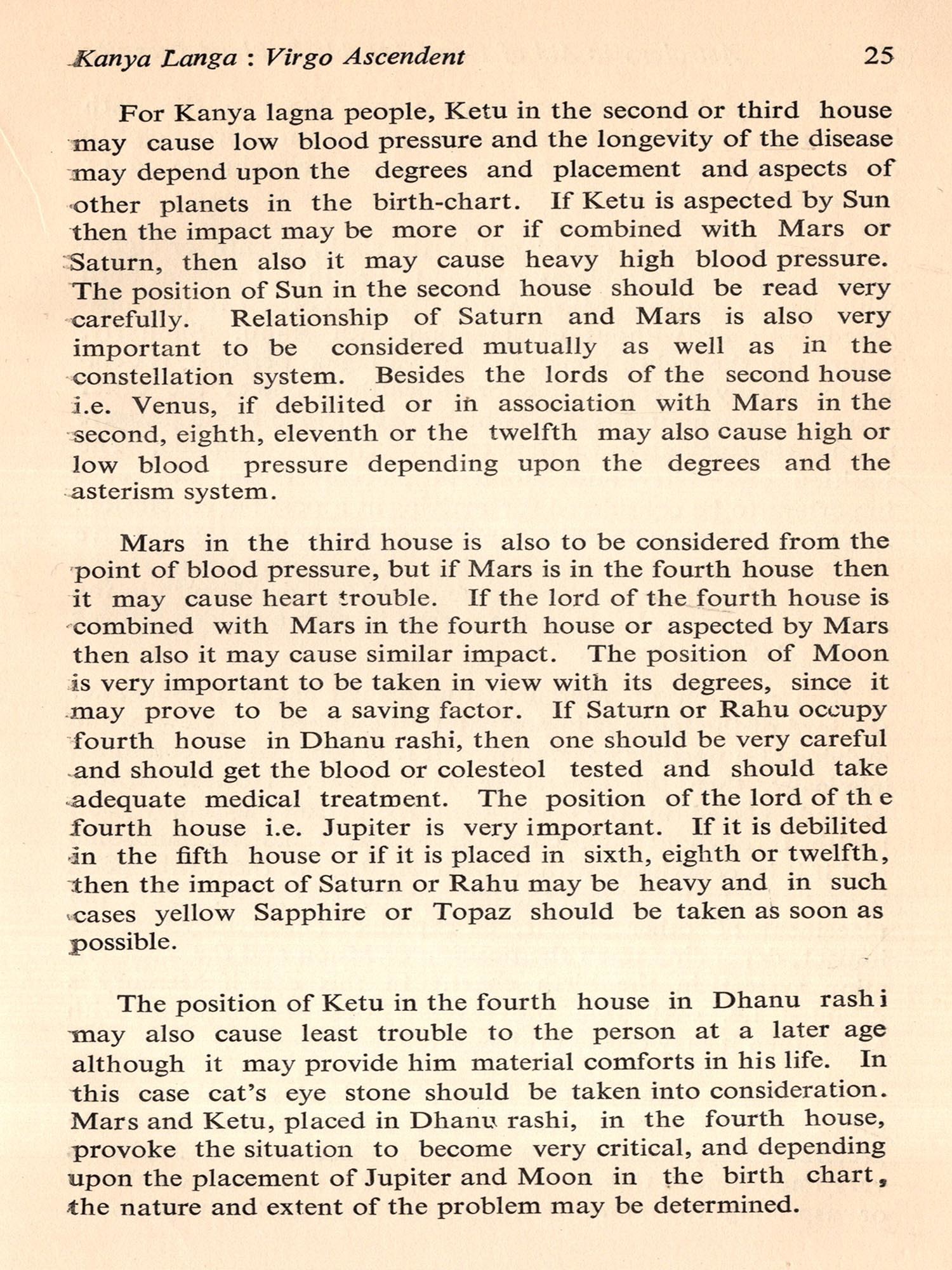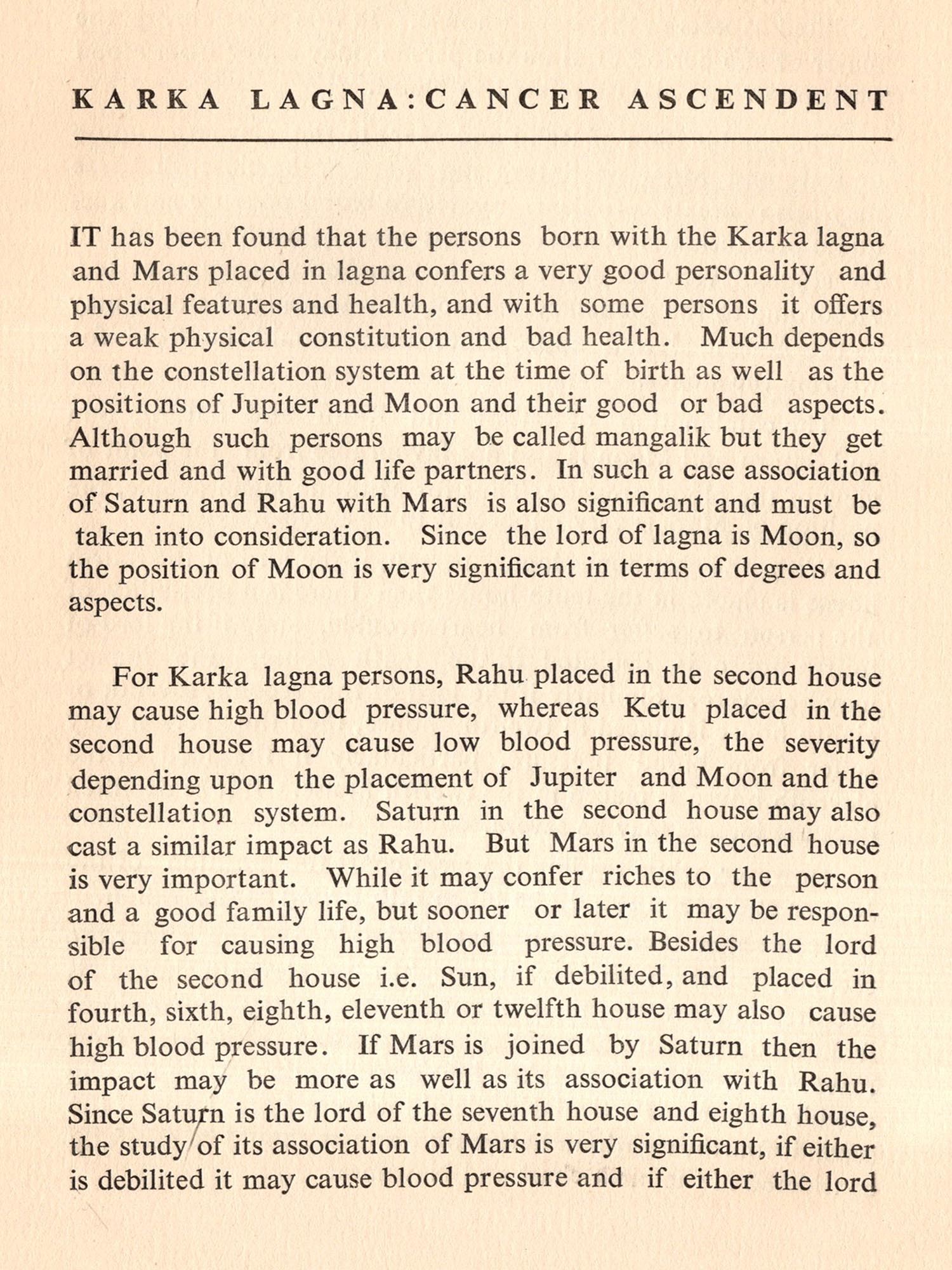 The author, while detailing 810 situations, explains the nature and extent of trouble particularly related to blood and heart diseases and holds the view that debilited or inimical Mars, Saturn, Sun, Rahu or Ketu either placed in or being lords of second, third. fourth, fifth, sixth, eighth and eleventh houses or adversely conjoin-ed, may be responsible for causing these diseases.