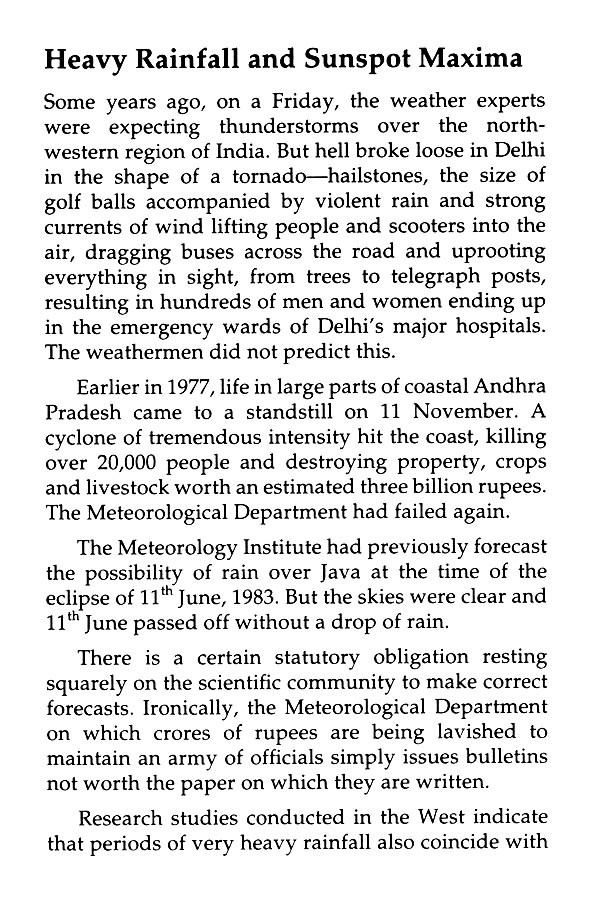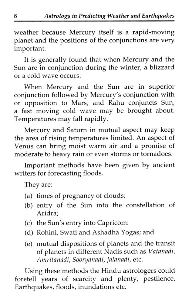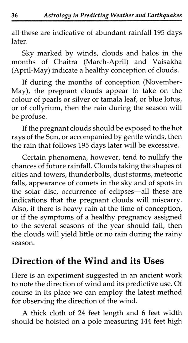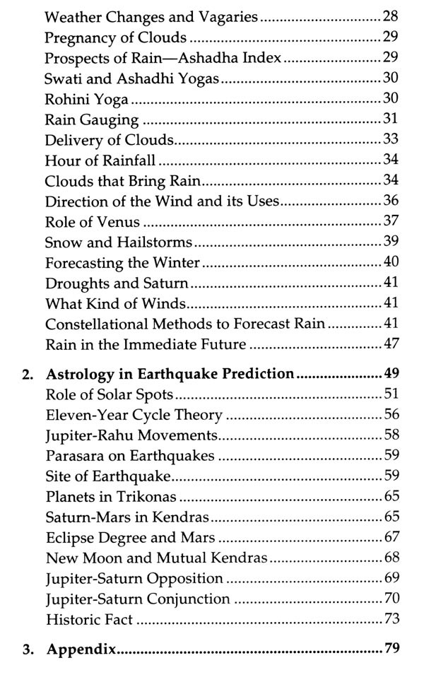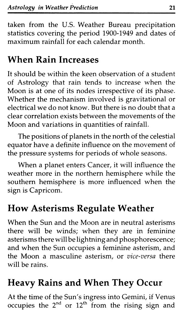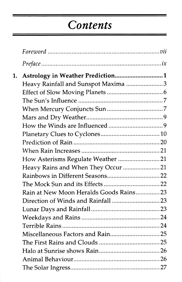 Astrology also provides much information on weather forecasting, especially of rainfall. Heavy, scanty and delayed rains can all be indicated fairly accurately. Long-range forecasting of weather has also been elaborately dealt with in classical works which has also been highlighted in this book. Short-term forecasts of a few hours, one day and even a week can be made accurately.