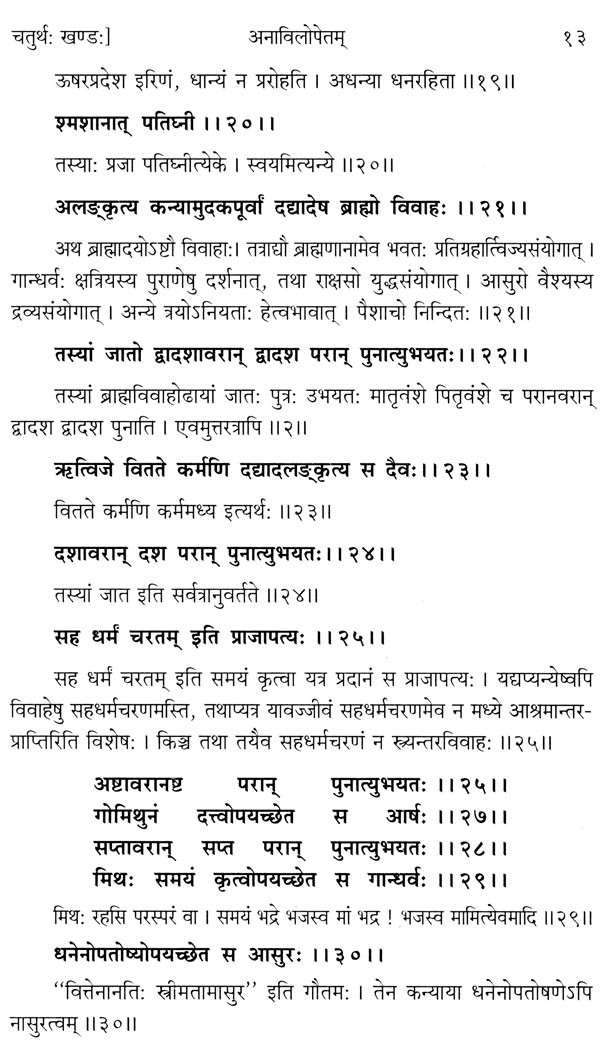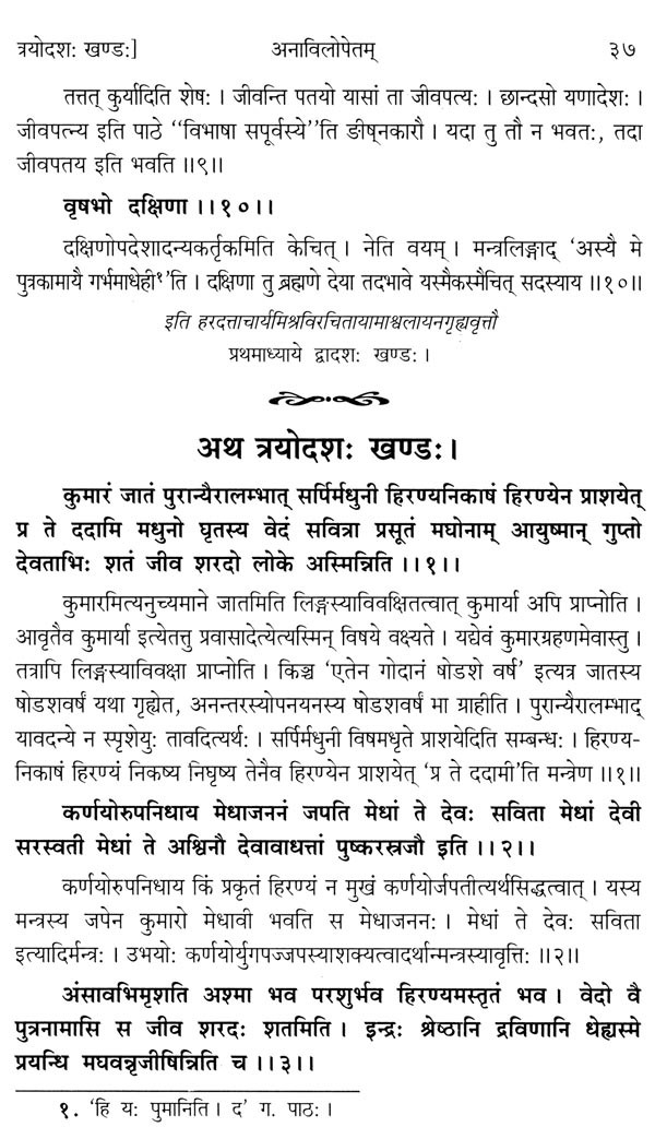 This Vrtti differs in many places from that of Gargya Narayana published in the Bibliotheca Indica many years ago, in respect of the reading of the Sutras, the division of the Sutras and Khandas as well as the interpretation. From the simple and dignified nature of elucidation, the present Vrtti looks almost like a Bhasya; and Gargya Narayana who has not followed this Vrtti or made any mention of it in his commentary appears not to have seen it at all. The terse and beautiful style characteristic of Haradatta as found in his works viz., Padamanjari a commentary on the Kasika Vrtti, Mitaksara a Vrtti on the Gautama Dharma Sutra, and Srutisuktimala, is also observable throughout the Anavila; and from this it seems likely that Haradatta, the author of the Anavila, is no other person than the Author of the Padamanjari and other works.