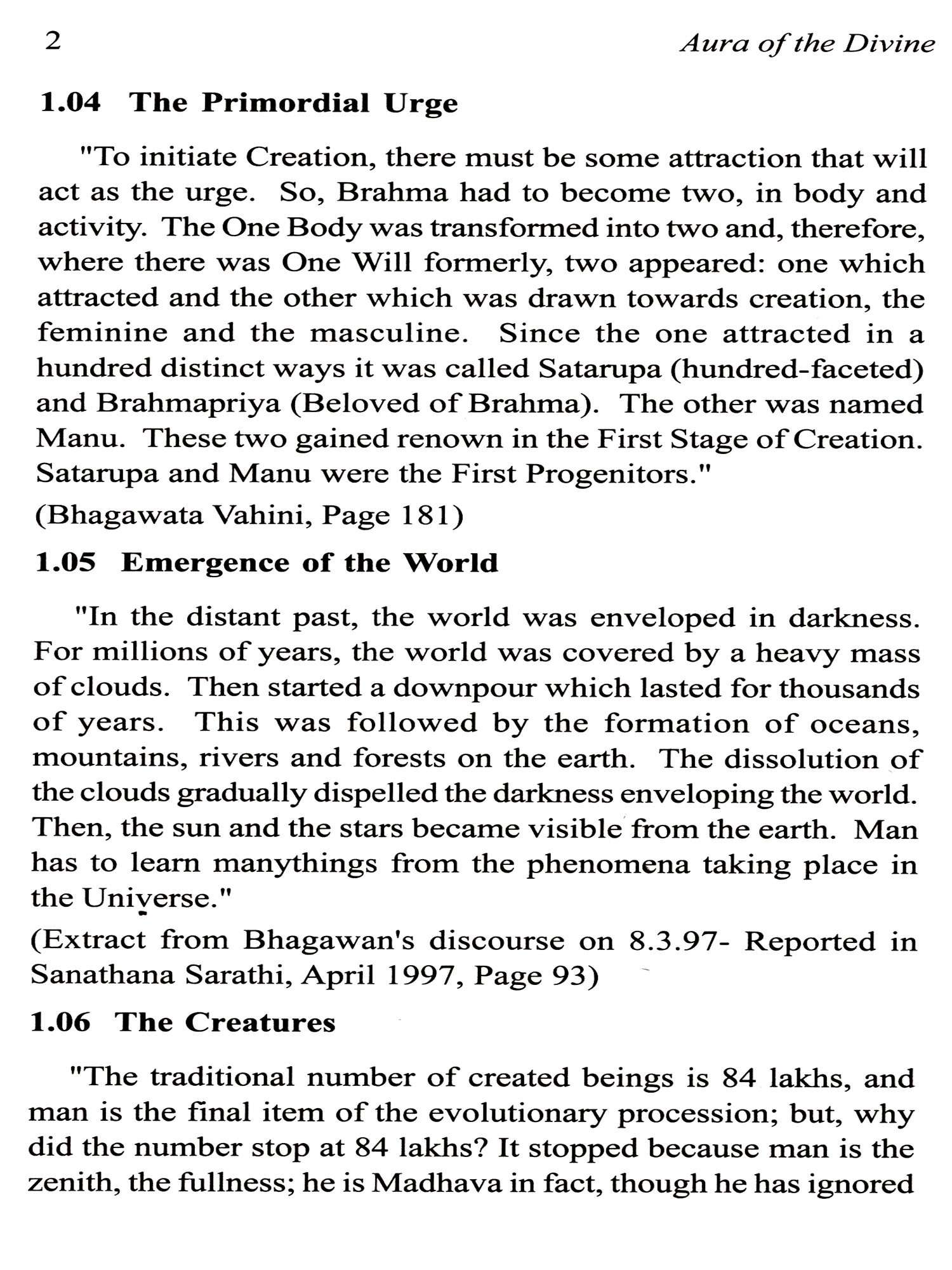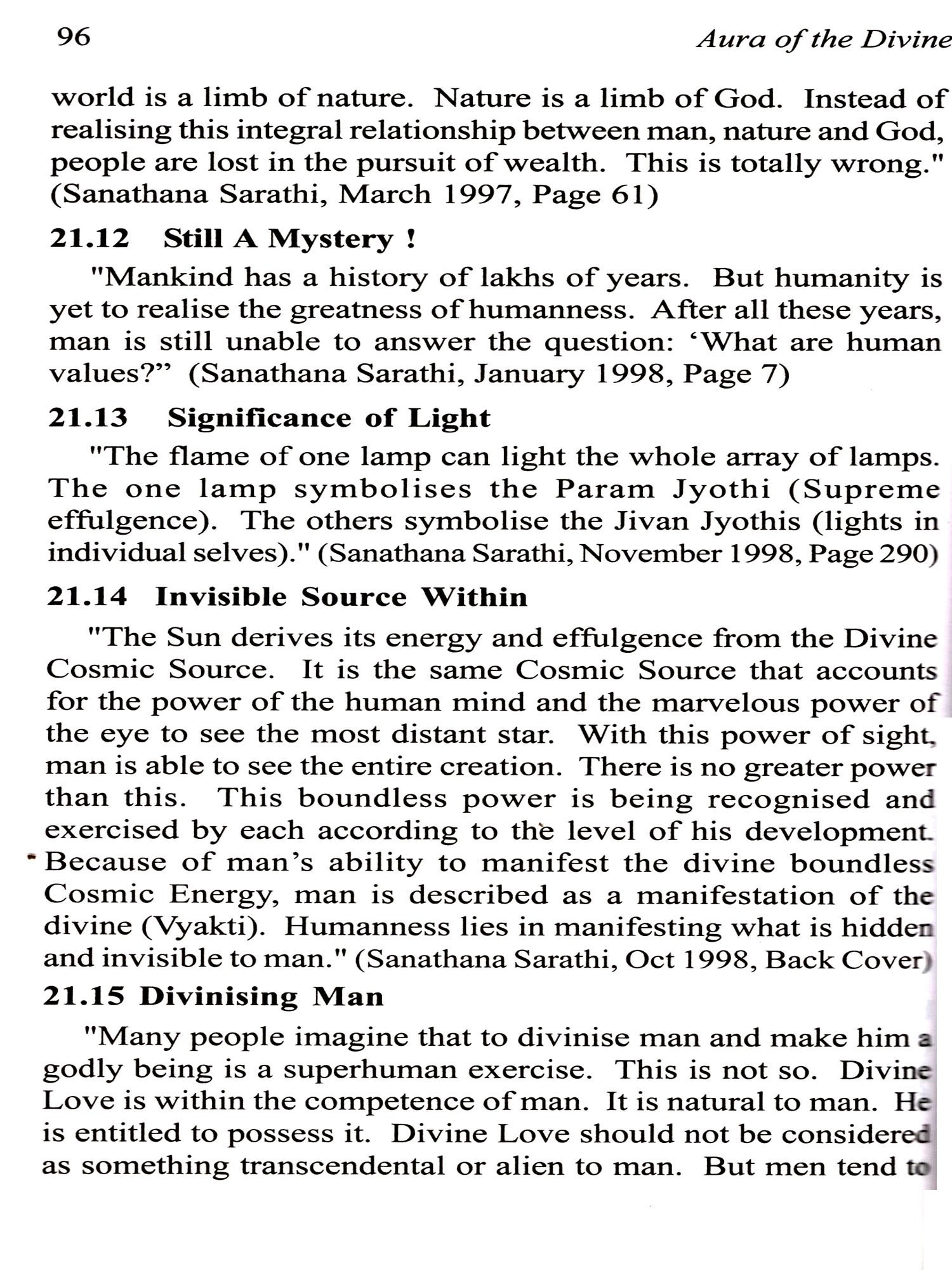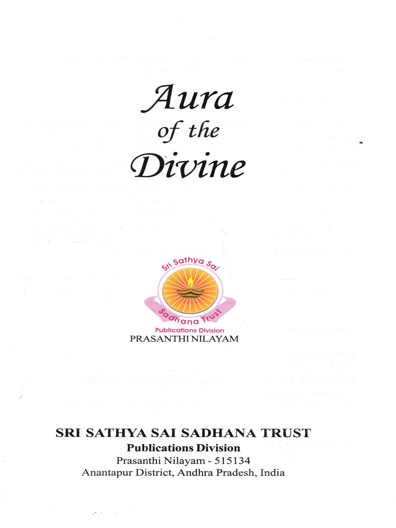 This book is a notable compilation of spiritual and philosophical topics well grouped under separate headings. This will help the reader to find the content of his/her choice. Aura of the Divine can be called a mini digest of Bhagawan's literature given its wide array of topics and subtopics dealt here from Sanathana Sarathi, Sathya Sai Speaks, Vahini series, Summer Showers series and books written on Swami like Easwaramma - The Chosen Mother.
