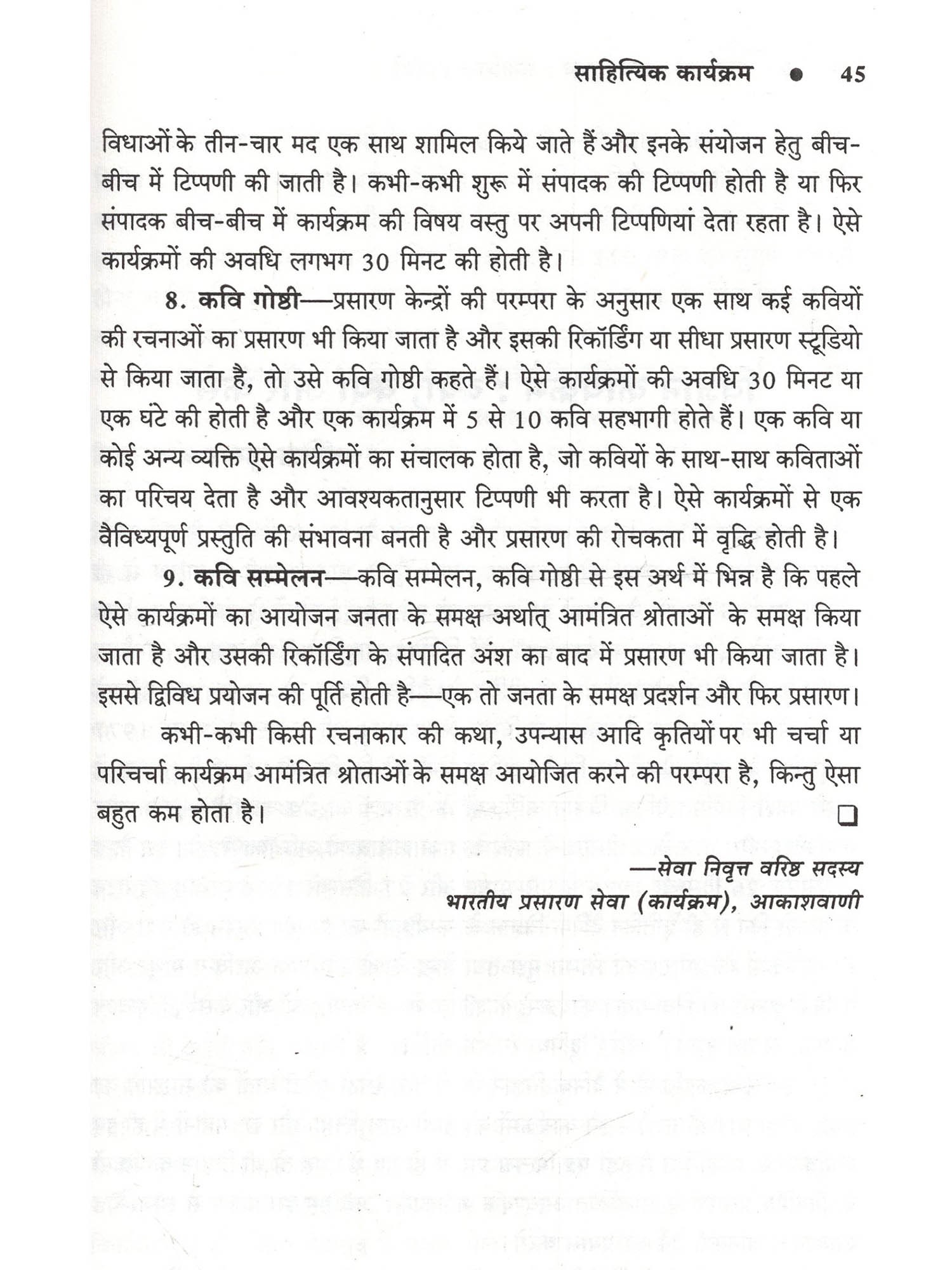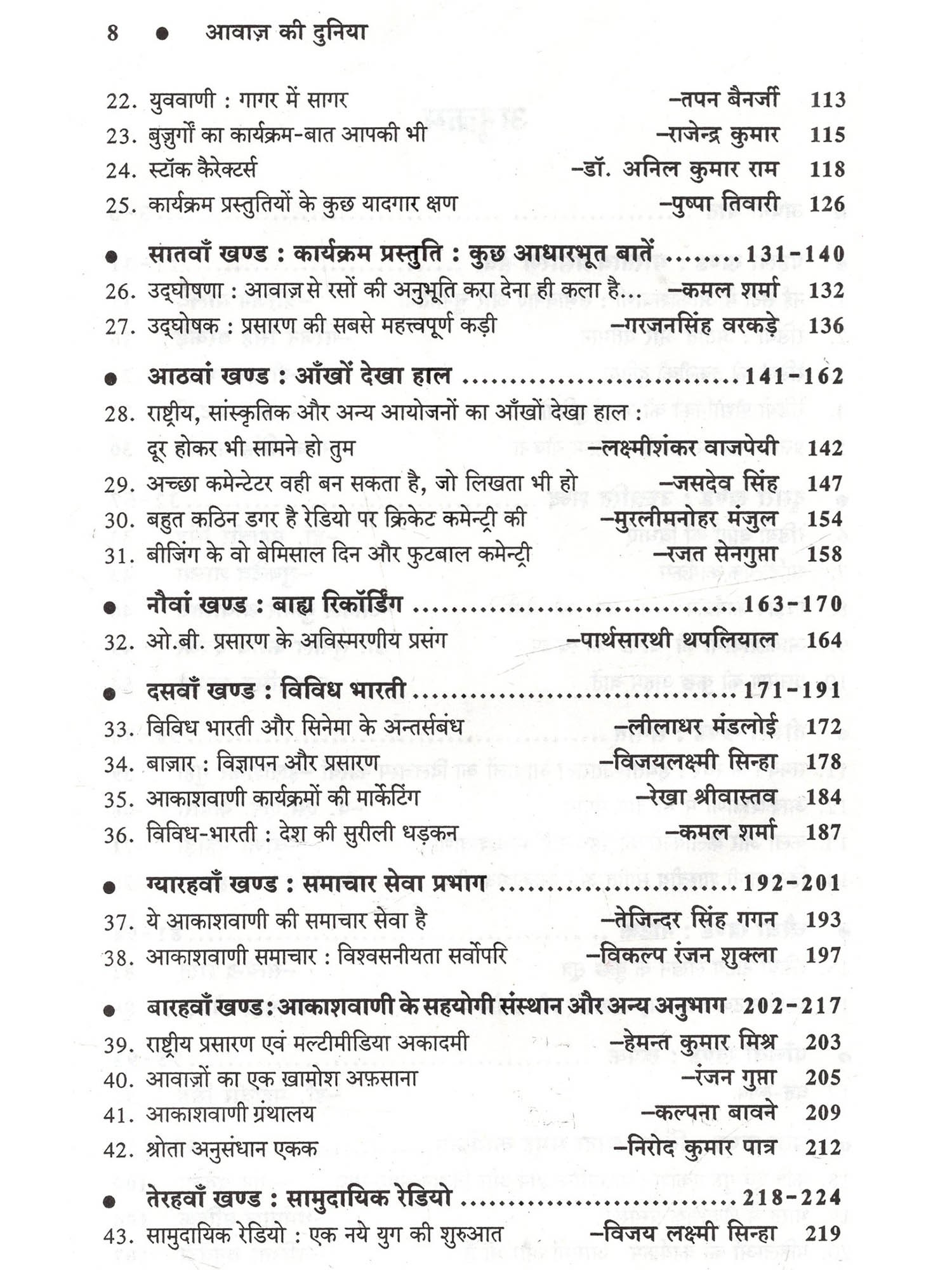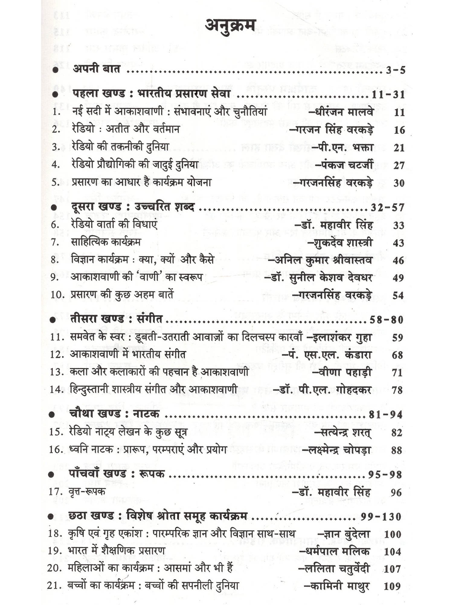 हमारे जीवन में प्रसारण का बड़ा महत्त्व है। सूचना, शिक्षा और मनोरंजन की दृष्टि से सुनने वालों को आकाशवाणी ने गहरे तक प्रभावित किया है और ये सिलसिला कहीं थमा नहीं है, बल्कि निरन्तर जारी है। इसके मुख्य कारण हैं आकाशवाणी के कार्यक्रमों की विश्वसनीयता, आम बोलचाल की संयत भाषा और उच्चारण की शुद्धता। आकाशवाणी के प्रसारणों में हर स्तर पर अनुशासन है, चाहे वो आवाज़ का हो, बोलने की शैली का या फिर भाषा के प्रयोग का हो। मौलिकता तो अनिवार्य शर्त है ही। इन अनुशासनों का पालन किए बिना आकाशवाणी के कार्यक्रमों में प्रतिभागिता संभव नहीं है। आकाशवाणी की इन्हीं विशेषताओं के कारण वार्ताकार और कलाकार कार्यक्रमों में प्रतिभागिता के लिए आतुर रहते हैं। इस पुस्तक में प्रसारण की प्रमुख विधाओं पर जिन प्रसारण विशेषज्ञों और प्रस्तुतकर्त्ताओं के विचार सम्मिलित किए गए हैं, वे शोधपरक हैं। अधिकांश प्रसारण विशेषज्ञ प्रतिष्ठित लेखक भी हैं उनकी रचनाओं के लिए अनेक बार उन्हें पास भी प्राप्त हुए हैं। आकाशवाणी के प्रसारणों नियमित सुनने वालों के लिए ये नाम अपरिचित भी नहीं हैं, क्योंकि अभी भी उनके द्वारा लिखे या प्रस्तुत किये गये नाटक या रूपक विभिन्न केन्द्रों से बराबर प्रसारित होते रहते हैं। साथ ही ऐसे विद्वान प्रसारकों के आलेख भी हैं, जो आकाशवाणी के कर्मचारी प्रशिक्षण संस्थान में प्रशिक्षण गतिविधियों का संचालन करते रहे हैं, ताकि प्रसारण कर्मी प्रशिक्षण के बाद गुणवत्तापूर्ण श्रेष्ठ कार्यक्रम प्रस्तुत कर सकें।