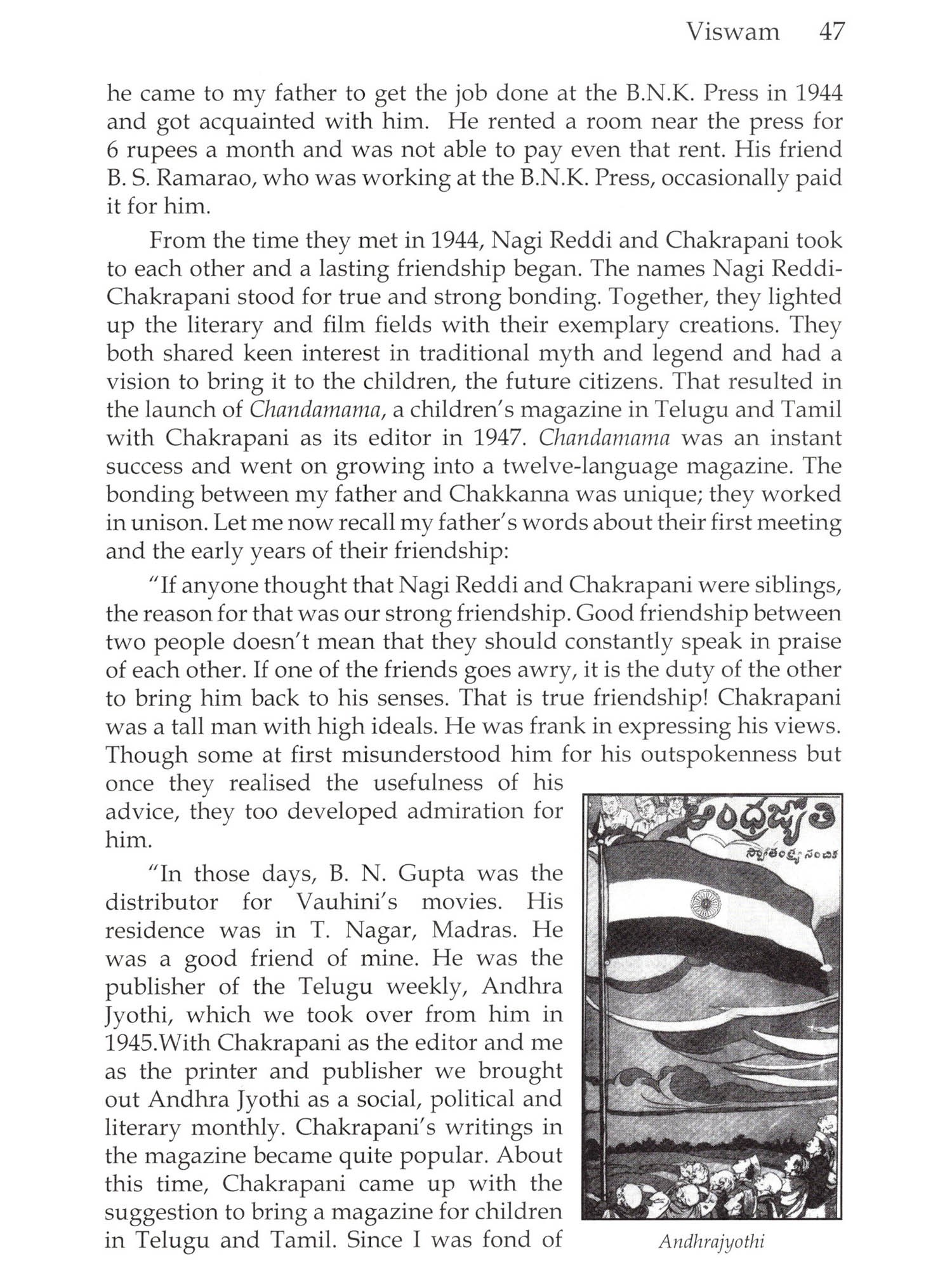 B. Viswanatha Reddi Popularly Known as Viswam is the third son of the legendary phenomenon Sri B.Nagi Reddi. Between 1963 and till his retirement in 2005, he was the publisher of the reputed children's magazine - Chandamama'. During his tenure, the 9 languages magazine grew into 15 languages including in Santhali, Sanskrit and Sinhala, along with 4 languages in Braille. Simultaneously he was also editing film and women's monthly magazines in Telugu, Tamil and Kannada languages, besides "The Heritage" and 'Junior Chandamama' in English among other journals. During his tenure as the District Governor of Rotary International District 3230 he made remarkable contribution for the eradication of Polio through Polio Plus Programme and he was actively associated with the Madras Chapter of War Widows Association, The Down's Research Society (India) and the Bharatiya Vidya Bhavan, Chennai Kendra. He served as the Under Sheriff of Madras for two terms in 1986 and 1987. Prominent among the honours and awards bestowed on him were 'Satdharma Bhodhaka Tilakam' title conferred on him by H. H. Sri Sankaracharya of Kanchi Kamakoti Peetham in 1984 and FICCI BAF Awards in 2007 for his contribution to the Indian Animation Industry. 'Samaya Samudaya Nanmani' title conferred by Sri Guru Mahasannidanam of Thiruvaduthurai Adheenam in 2008.
