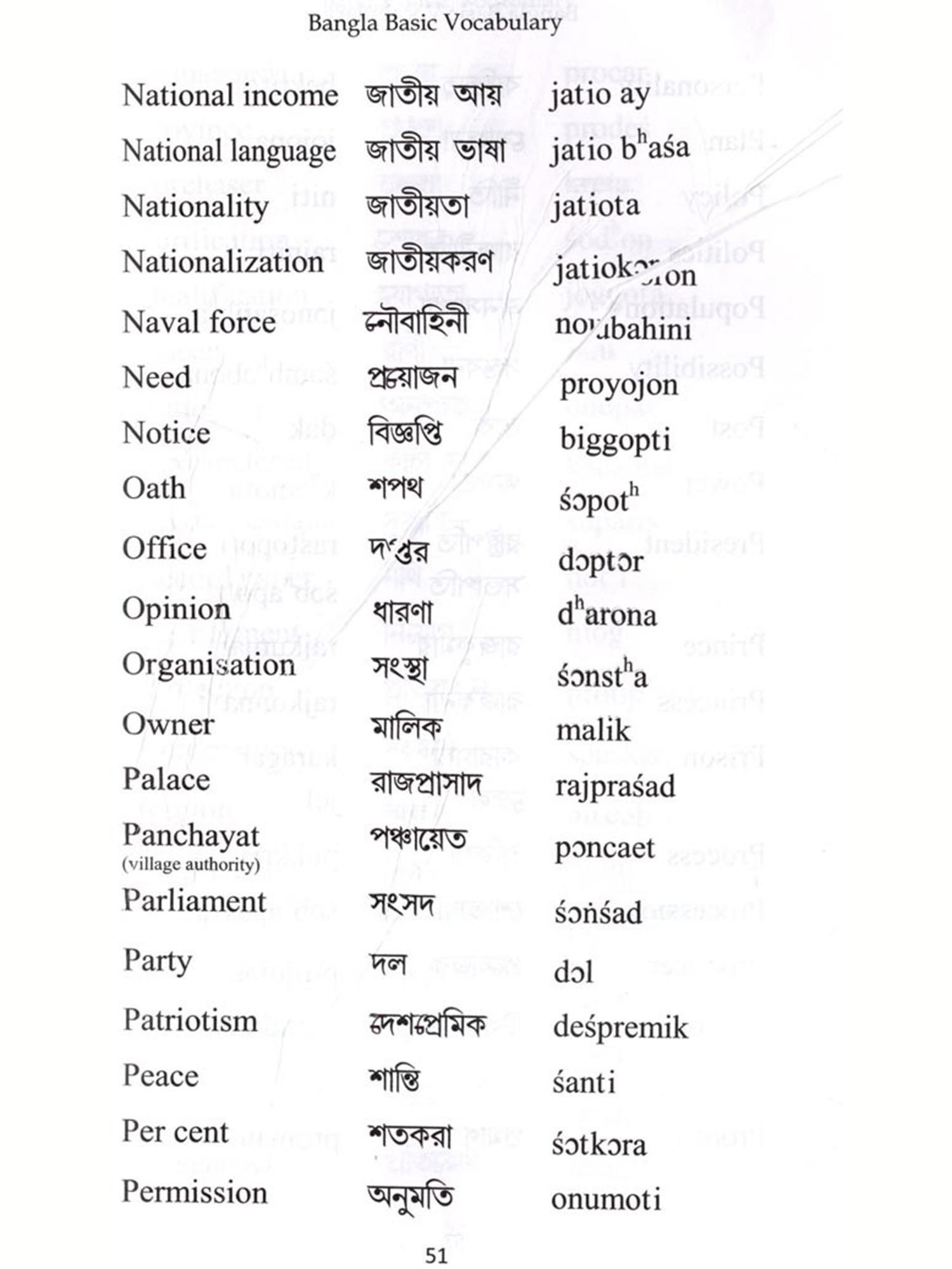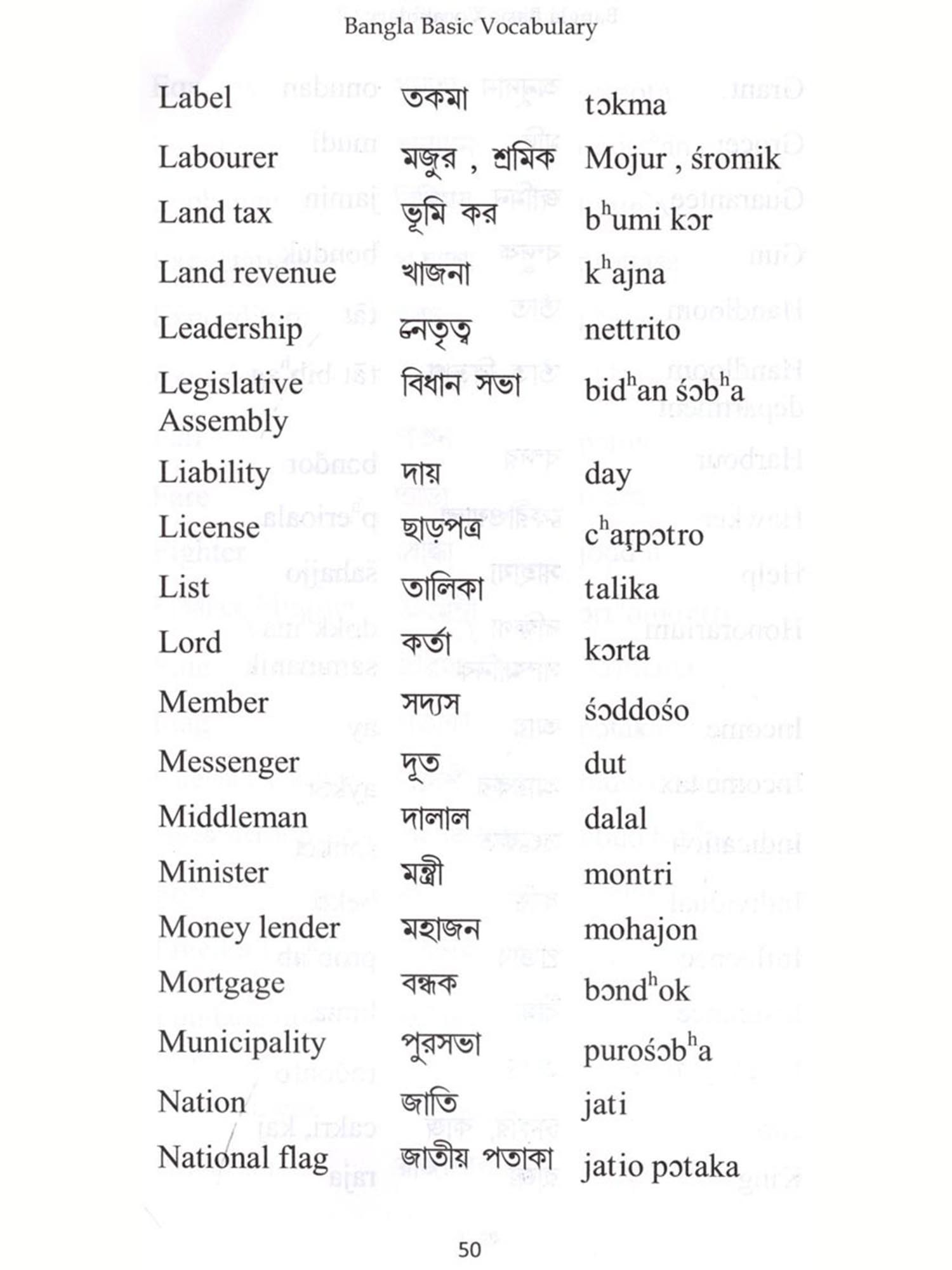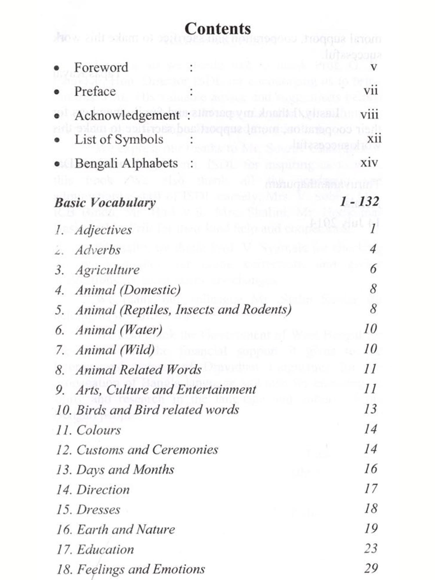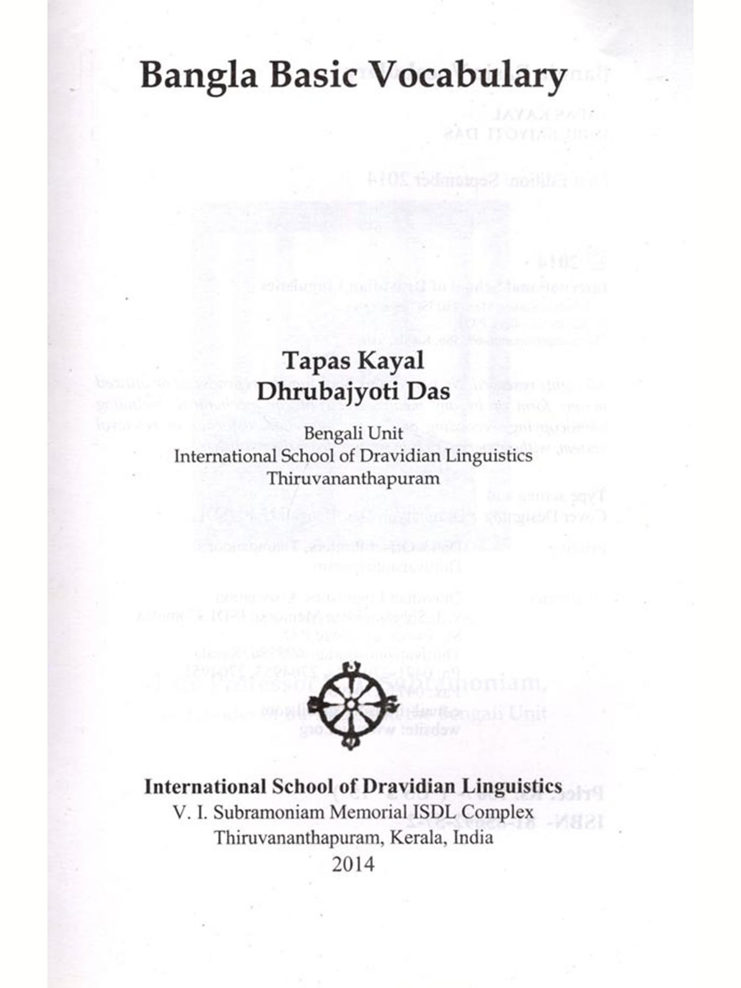 The work 'Bangla Basic Vocabulary by Shri Tapas Kayal and Shri Dhrubajyoti Das is a product of their experience in teaching Bengali to non-Bengalis. This book together with an earlier publication "Intensive course in Bengali" by Mahidas Bhattacharya will be a perfect package for learning Bangla for the non-Bangla mother tongue groups. The words which are needed for our day to day life are listed in this book. Since the target group is mainly the Dravidian language speaking adults the authors have given English words instead of Hindi and their Bangla correspondences. The subject wise cum alphabetic order will surely be of much help to the users. I hope this work will be received wholeheartedly by both teachers and students of Bangla language.