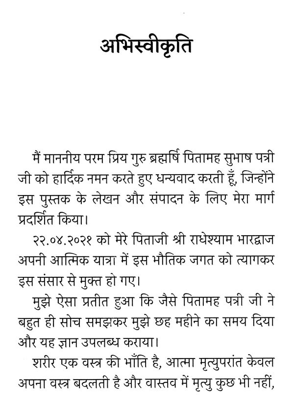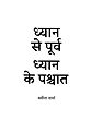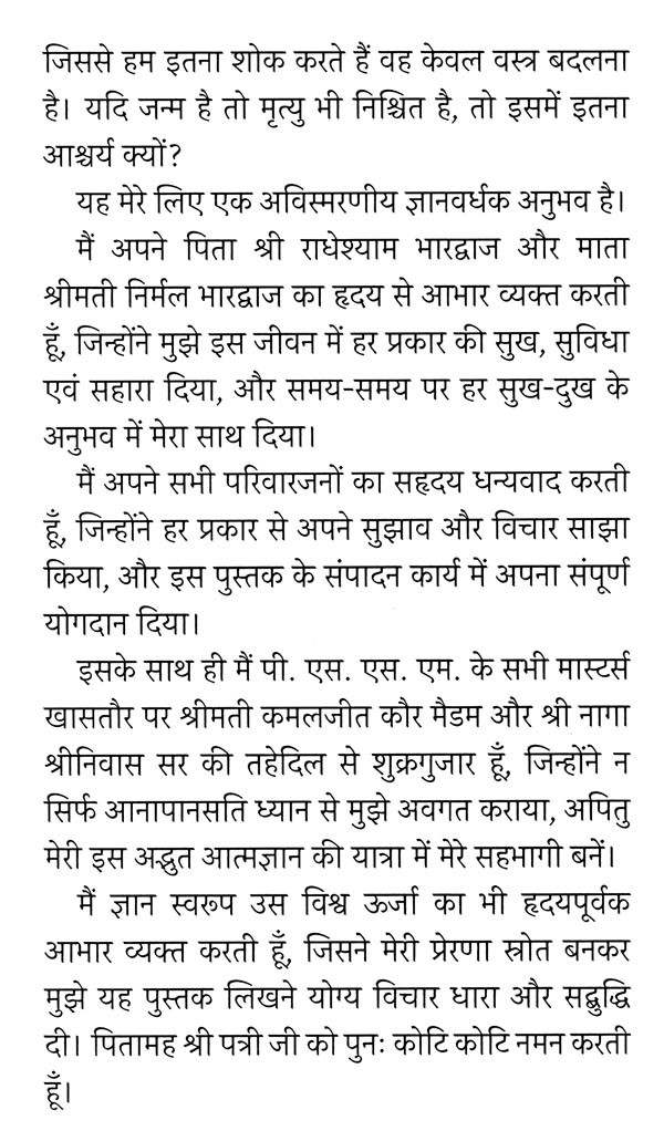 "ध्यान से पूर्व और ध्यान के पश्चात" पुस्तक मेरे जीवन का सार है। अब तक यदि मैं जन्म से लेकर अपने जीवन की तुलनात्मक उपलब्धियों के बारे में बात करूं, तो यह पुस्तक मेरे जीवन की सबसे बड़ी उपलब्धि है और यह तभी संभव हो पाया जब मैं ध्यान से जुड़ी, जब मैं पी.एस.एस.एम. से जुड़ी, जब मैं पत्री सर से जुड़ी। अपने वास्तविक स्वरूप को पहचानने में और अपने भीतर के स्वर्ण कमल को खिल जाने में मेरा मार्गदर्शन जिस प्रकार पत्री सर ने किया, मैं कृतज्ञ भाव से उनका आभार मानती हूँ। ब्रह्मर्षि पितामह पत्री जी ना केवल एक साक्षात गुरु की भांति हमारा मार्गदर्शन कर रहे हैं किंतु वे उस दिव्य स्वरुप में हमारे बीच विद्यमान हैं जिनके दर्शन मात्र से हम जन्म जन्मांतर के कर्म बंधन से मुक्त हो जाते हैं। मैं स्वयं को बहुत भाग्यशाली मानती हूँ कि इस पुस्तक को वर्तमान स्वरूप में आप सबके समक्ष प्रस्तुत करने के लिए उन्होंने मुझे अपने अनुभवों को संरक्षित करने का यह कार्य सौंपा और प्रेरणा दी। पत्री जी को मेरा कोटि-कोटि नमन।