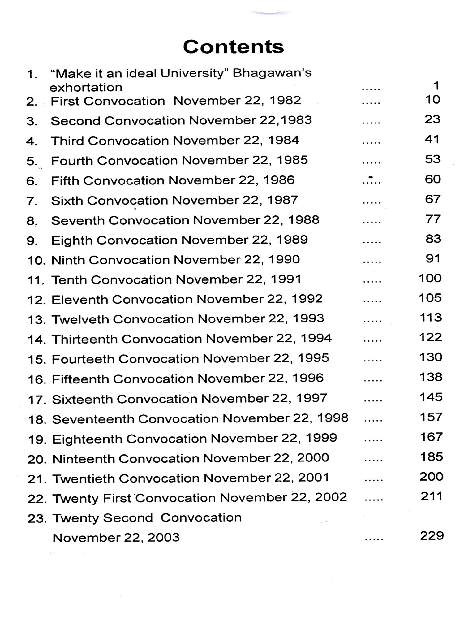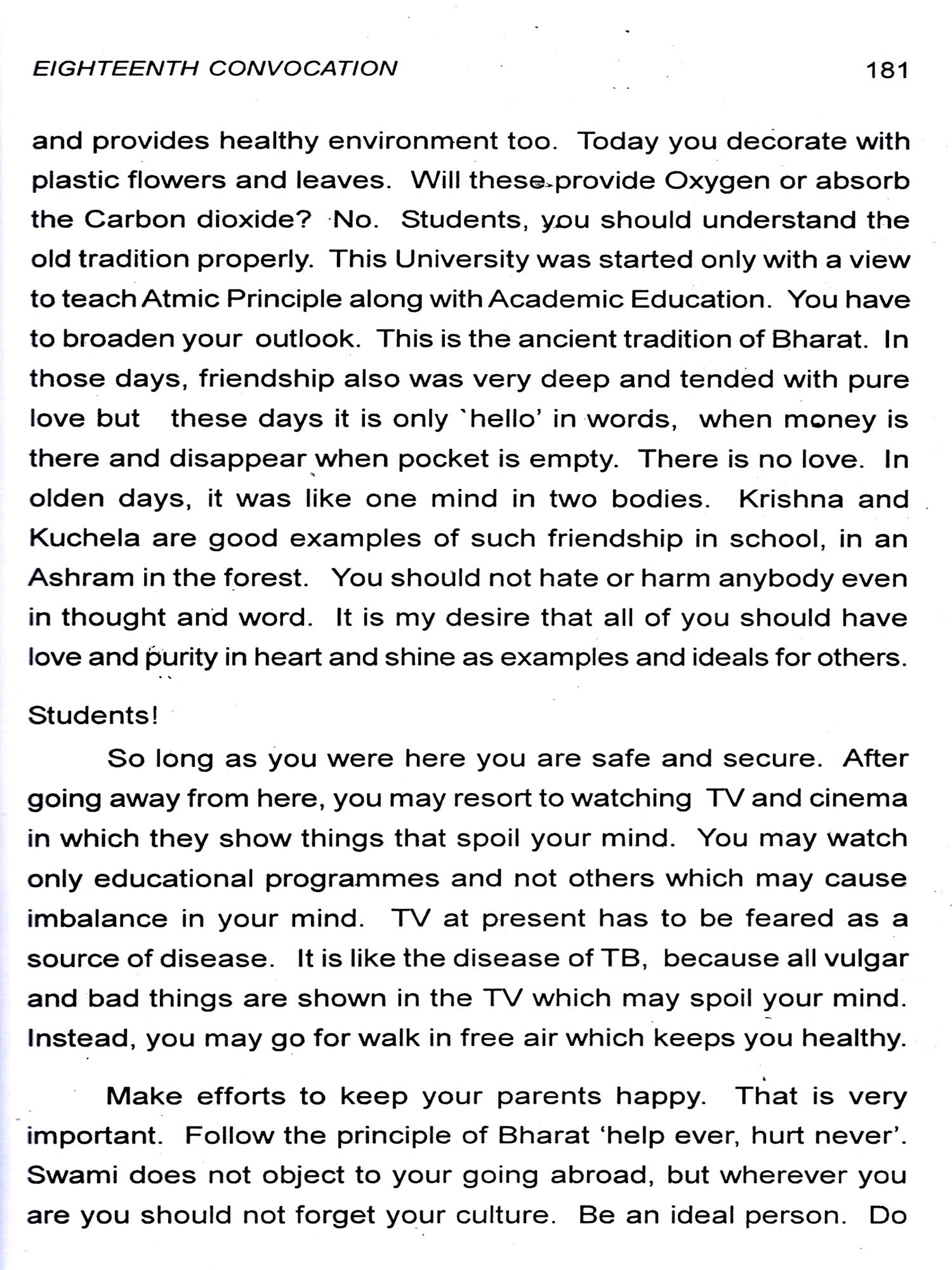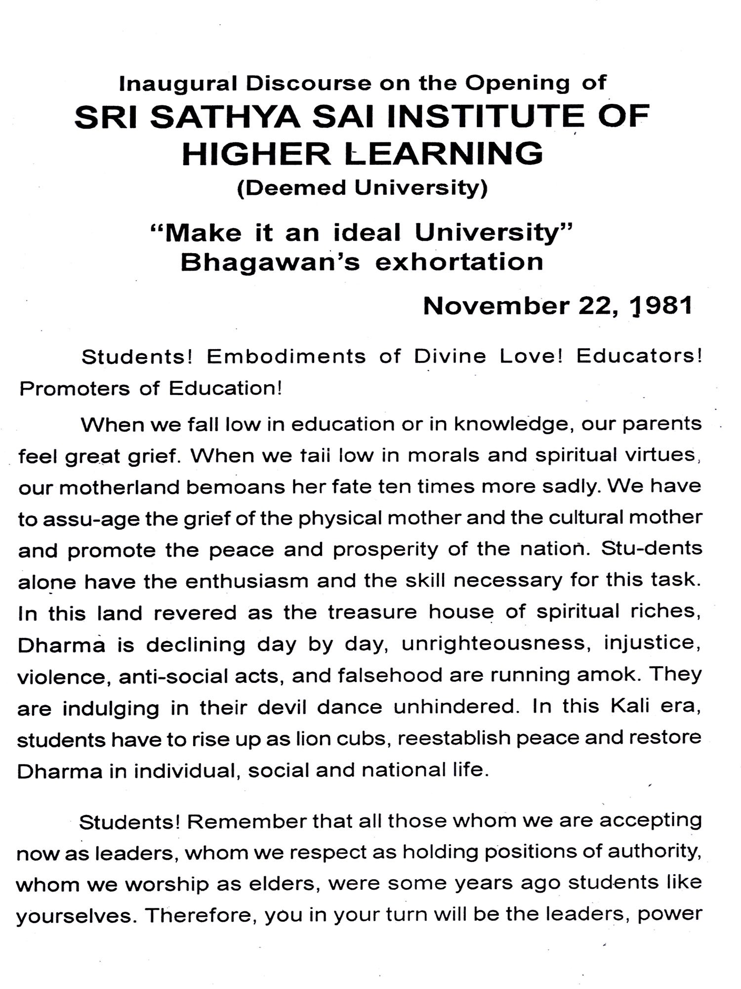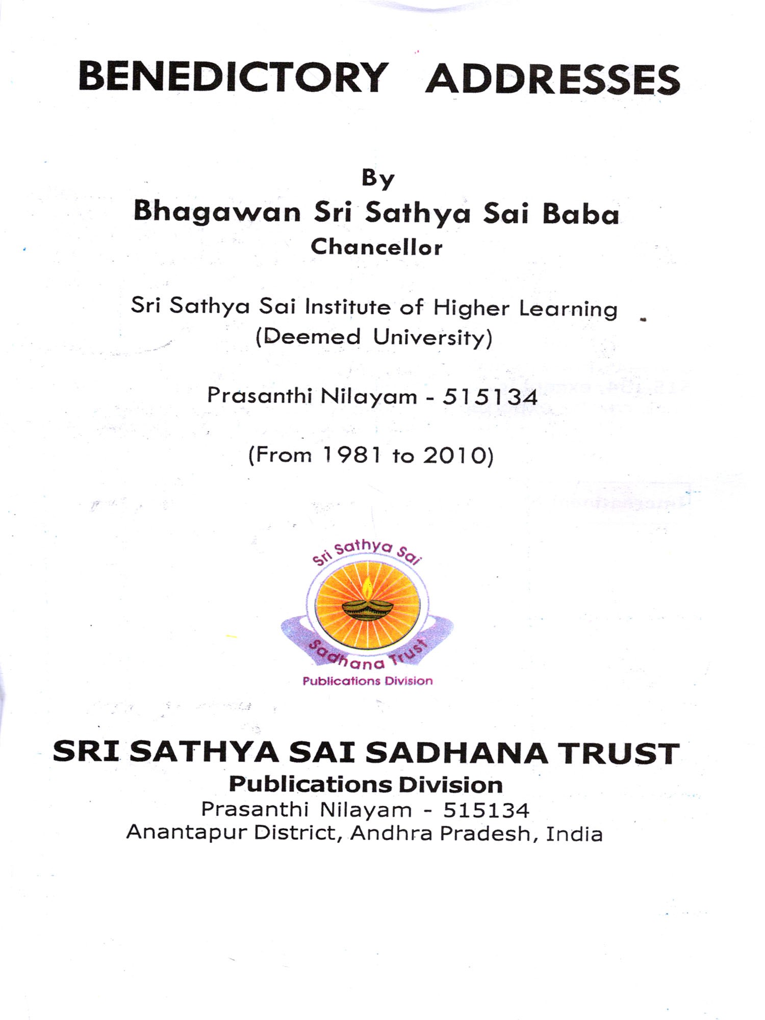 Bhagawan has emphatically declared that His entire property consists of His students. And naturally, therefore, the Revered Chancellor, in each of His Discourses, emphasises on the students the need to live a life based on purity of heart, love and compassion for the entire mankind. He wishes that when they go out of the portals of this esteemed institute, they should behave as responsible citizens of this land and also involve themselves in the service of society. At the Annual Convocation of the Institute held on November 22 each year, it is the unique privilege of the students to be blessed with Benedictory Address delivered by their Revered Chancellor. The present revised edition, with discourses up-to-date, gives the Benedictory Addresses from the year 1982 to 2010 including the Inaugural Discourse on November 22, 1981.