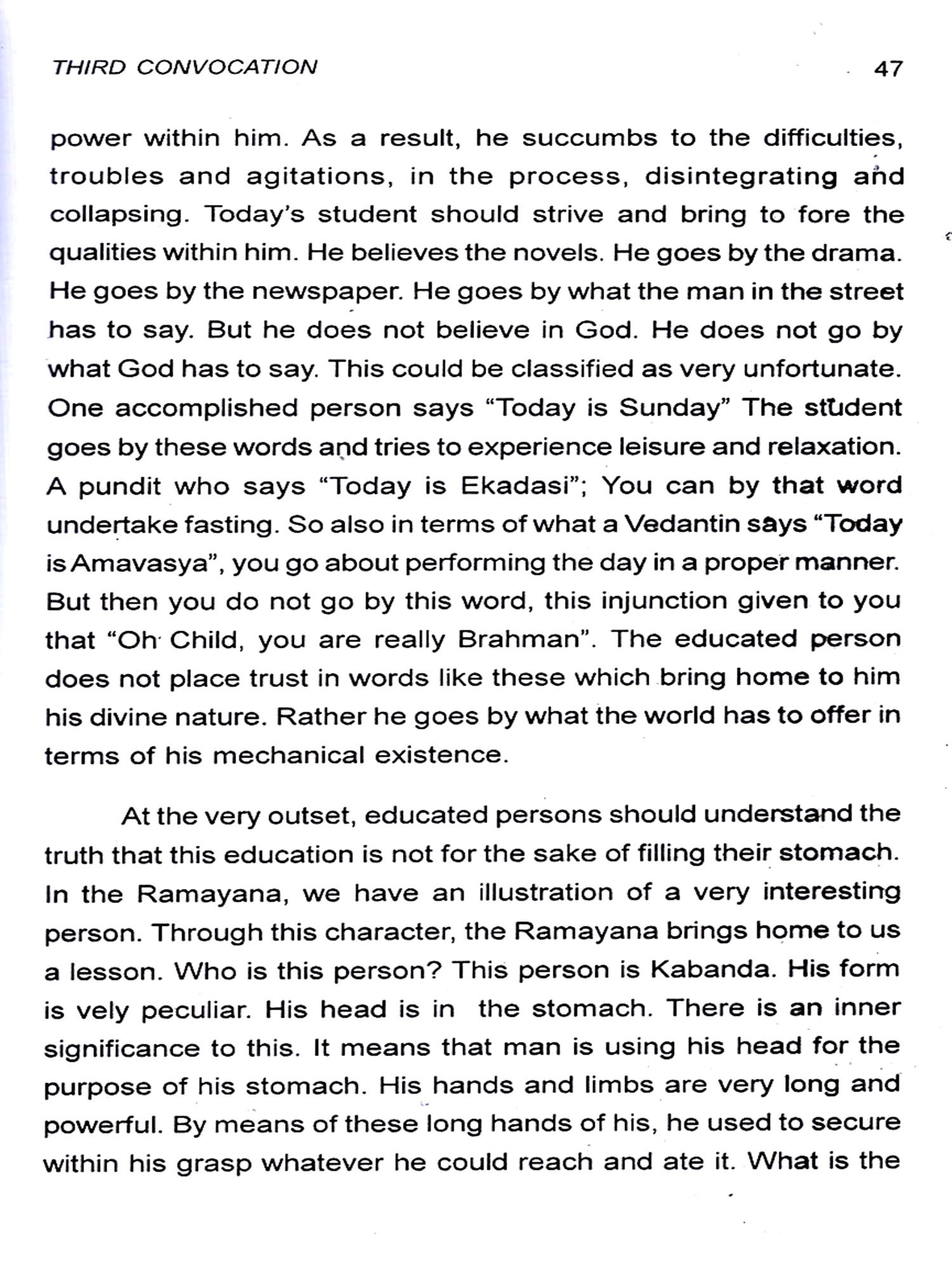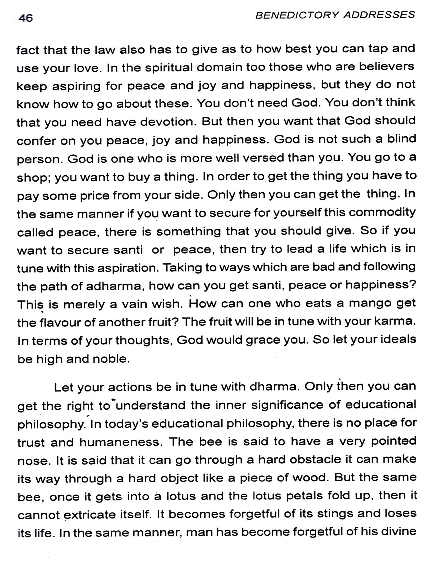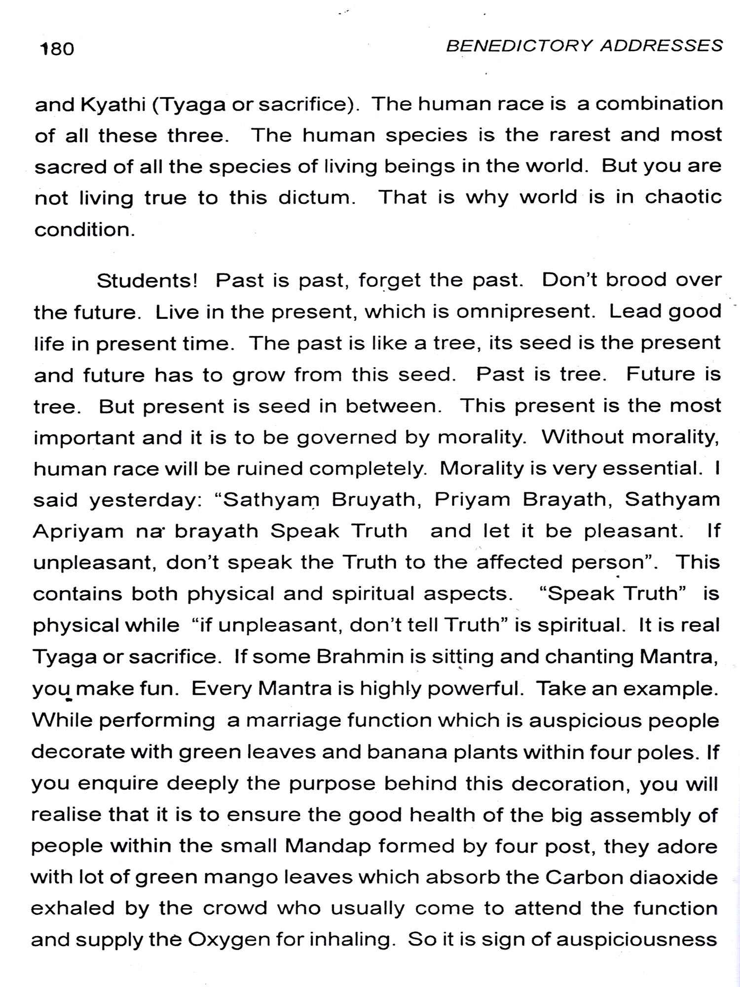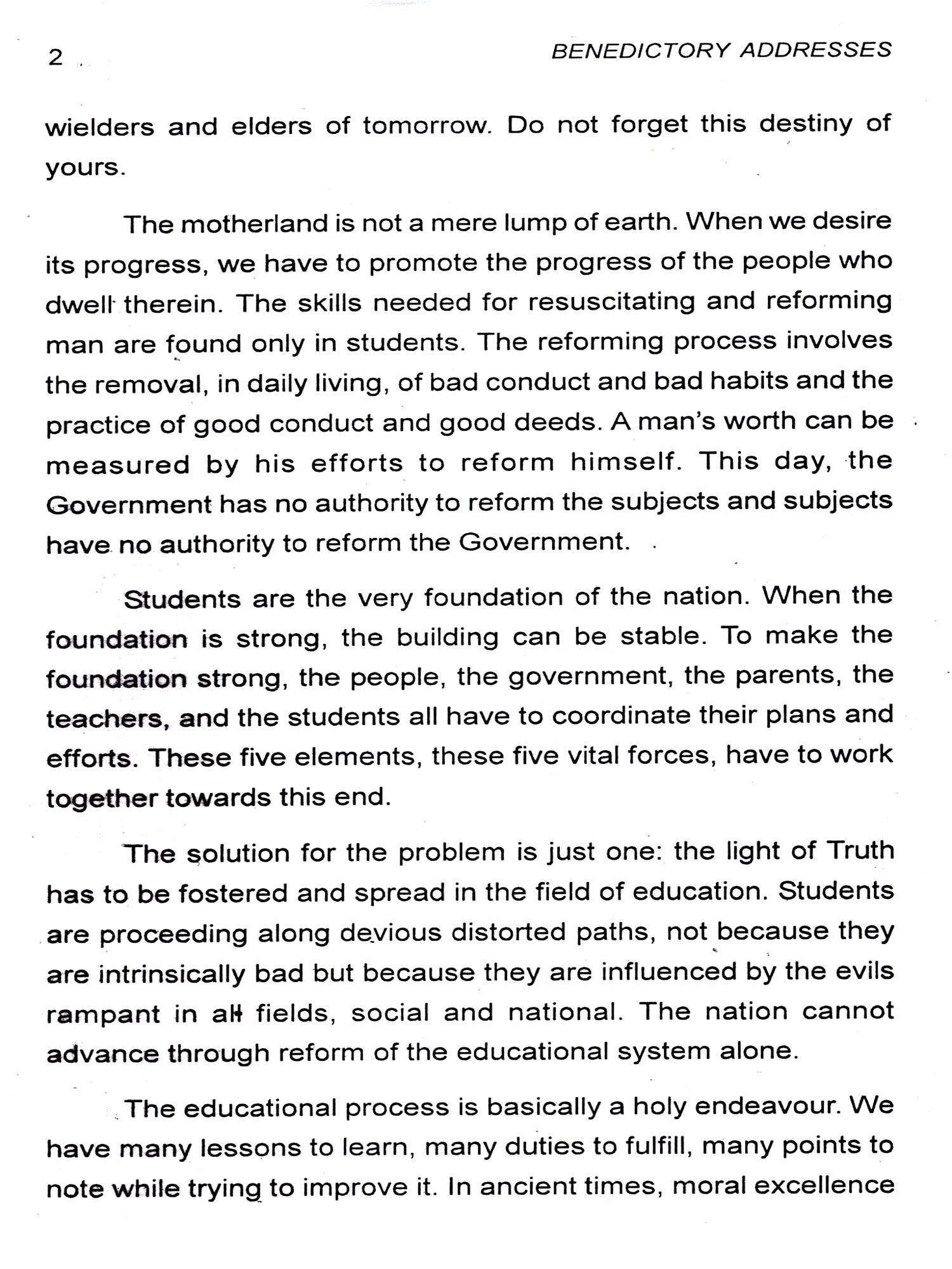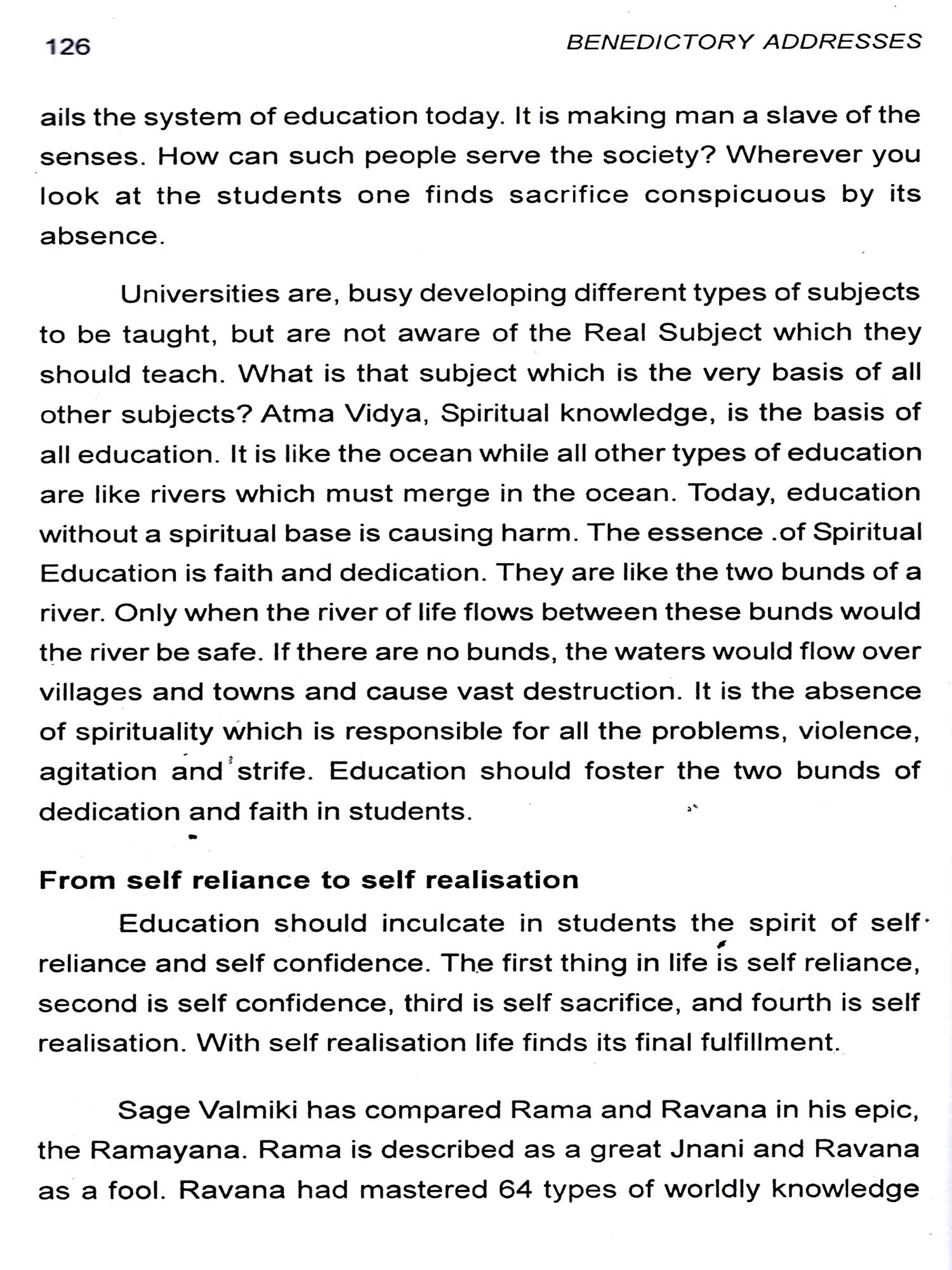 Bhagawan has emphatically declared that His entire property consists of His students. And naturally, therefore, the Revered Chancellor, in each of His Discourses, emphasises on the students the need to live a life based on purity of heart, love and compassion for the entire mankind. He wishes that when they go out of the portals of this esteemed institute, they should behave as responsible citizens of this land and also involve themselves in the service of society. At the Annual Convocation of the Institute held on November 22 each year, it is the unique privilege of the students to be blessed with Benedictory Address delivered by their Revered Chancellor. The present revised edition, with discourses up-to-date, gives the Benedictory Addresses from the year 1982 to 2010 including the Inaugural Discourse on November 22, 1981.