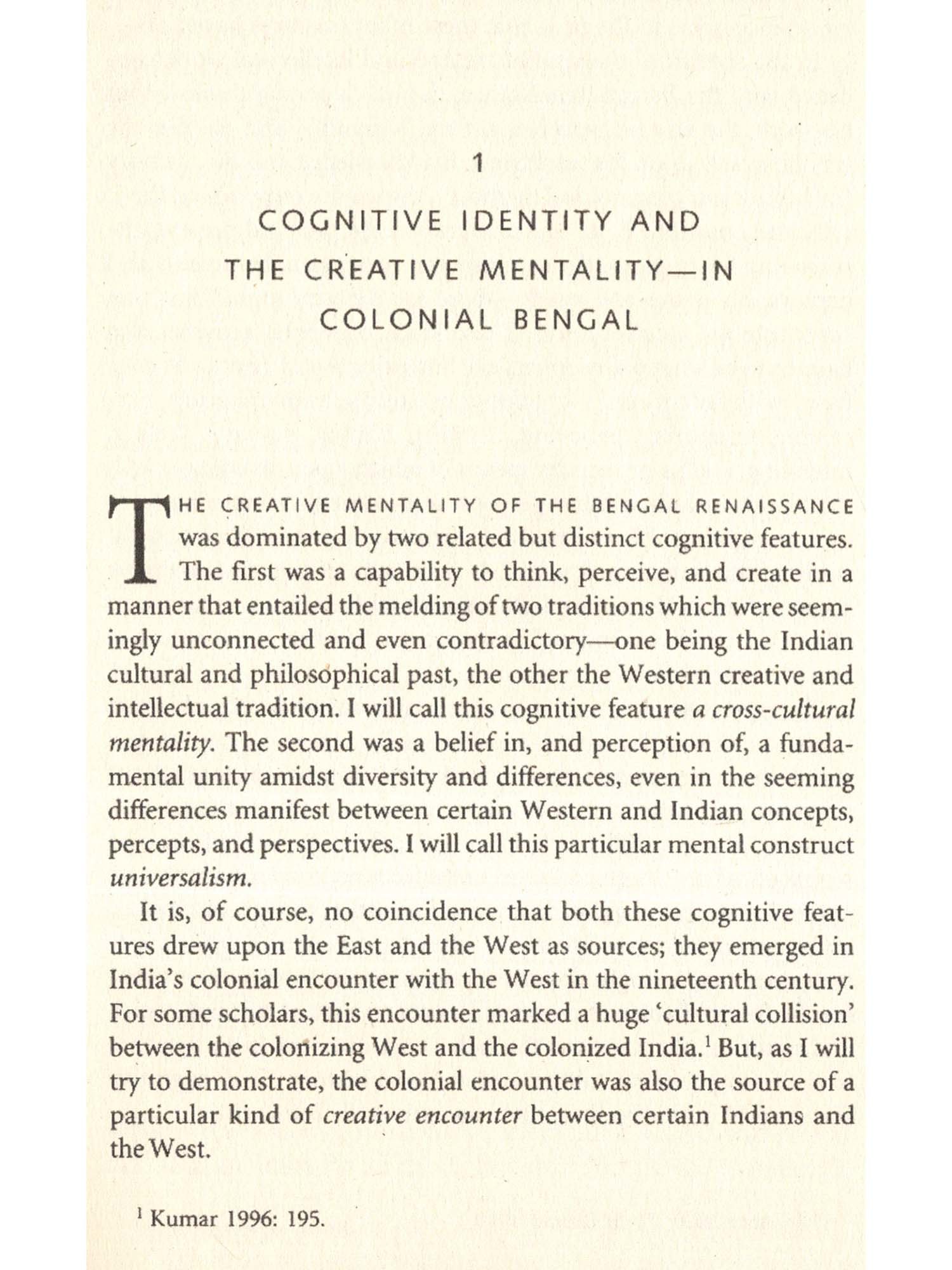 In the context of the kind of creative and intellectual work associated with Bengal Renaissance, the way he perceives nature, humanity, and culture, the way he draws upon his worldview, his knowledge and his memory (including autobiographical memory), the way he responds aesthetically and emotionally to related works of the past and present, the reasoning he employs, the symbols and metaphors he invents and deploys, his drives and needs—these are the very ingredients that constitute the creative mind. These kinds of mental activities also happen to the what philosophers call ‘intentional acts’ (not to be confused with intensions)—thinking, reasoning, remembering, perceiving, imagining, believing, uttering, hoping, desiring, feeling, intending, and so on: acts by means of which a person engages with the world, including other persons, and constructs meaning from such engagement. Broadly stated, cognitive science is the empirical study of the ‘intentional mind’. It is because of this that cognitive science gives us the appropriate conceptual framework in which to situate the creative mind, in particular, to explain the nature of creative mentalities.