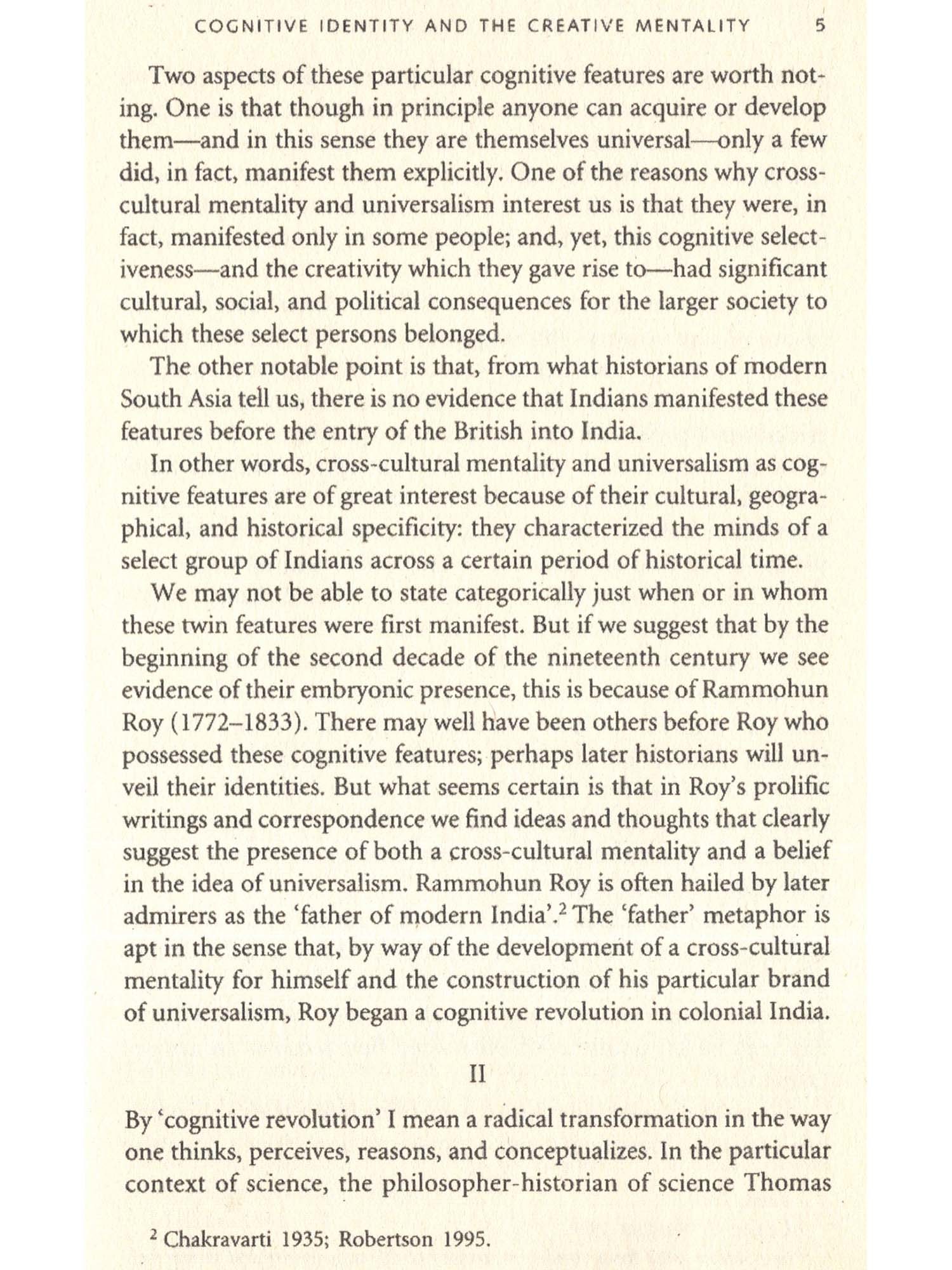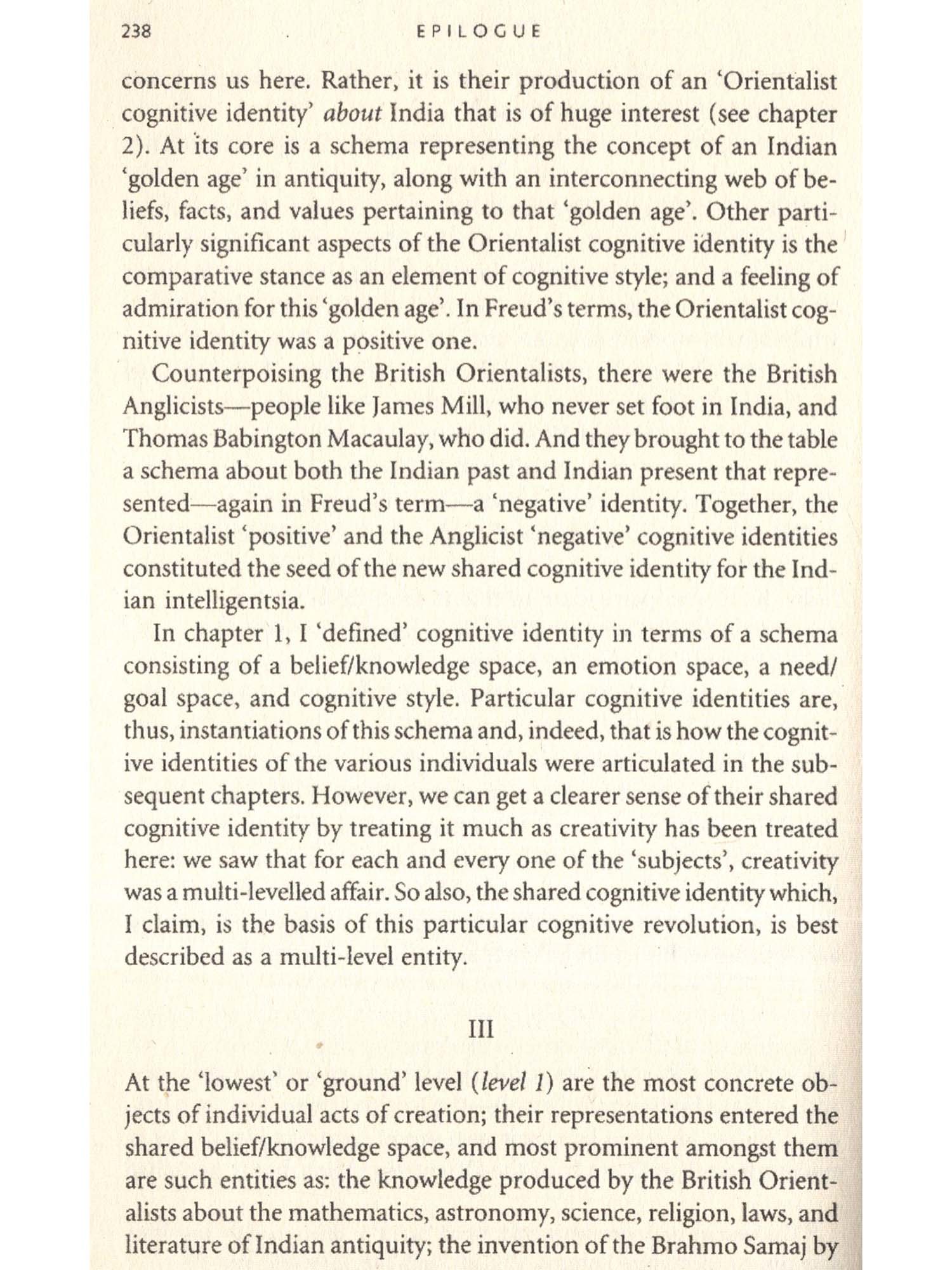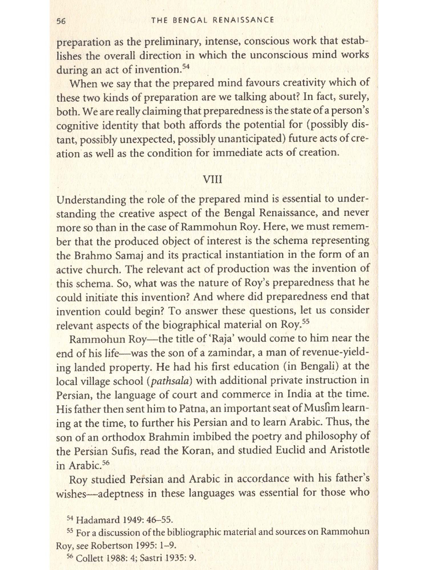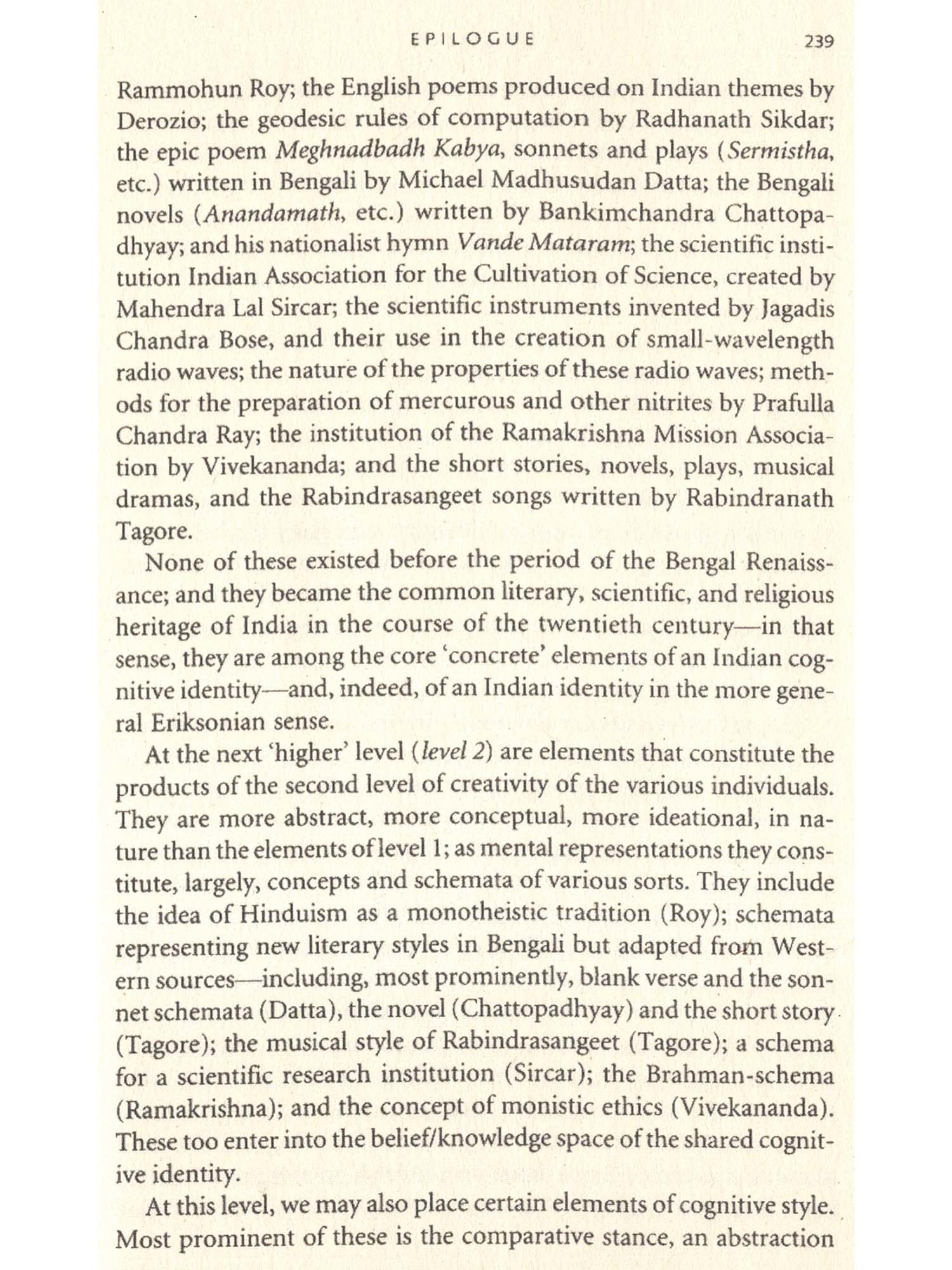 I will try to show that what historians and literary scholars have uneasily called the ‘Bengal Renaissance’ is characterized by a certain collective cognitive identity. This particular cognitive came into being amidst a small but remarkable community of individuals in Nineteenth-century Bengal as the outcome of their respective, individual acts of creation in a number of realms, in particular, ancient history, theology, literature, science, and practical religion. My main task in this book is to unveil the cognitive nature of the products of these diverse acts of creation, and the products of these individuals acts of creation and the resulting shared cognitive identity were both radically distinctive relative to the Indian past, and of profound consequence to the future; so much so that it behoves us to claim that this collective creativity and the resulting shared cognitive identify over the span of the nineteenth century represent a genuine cognitive revolution.
