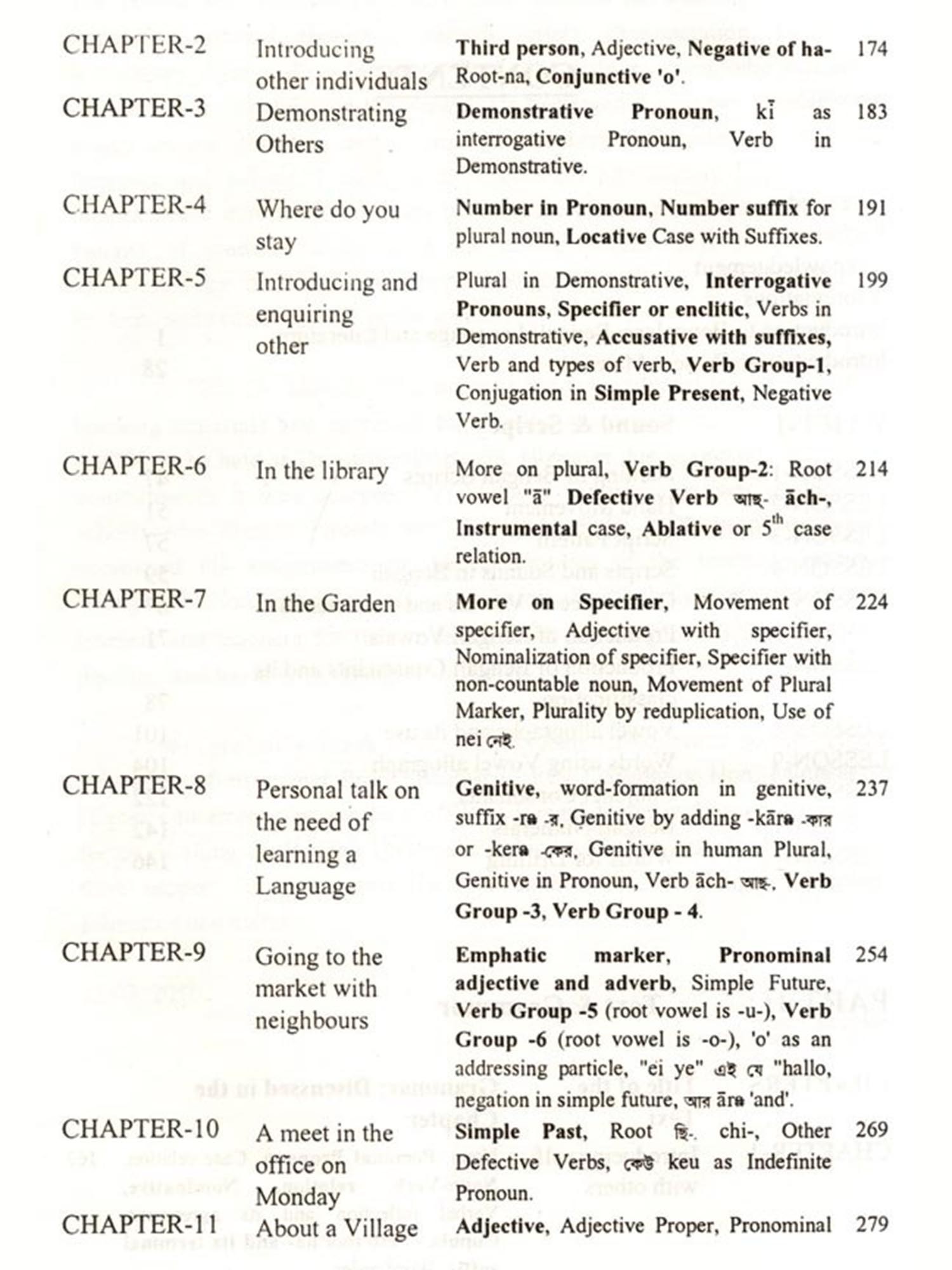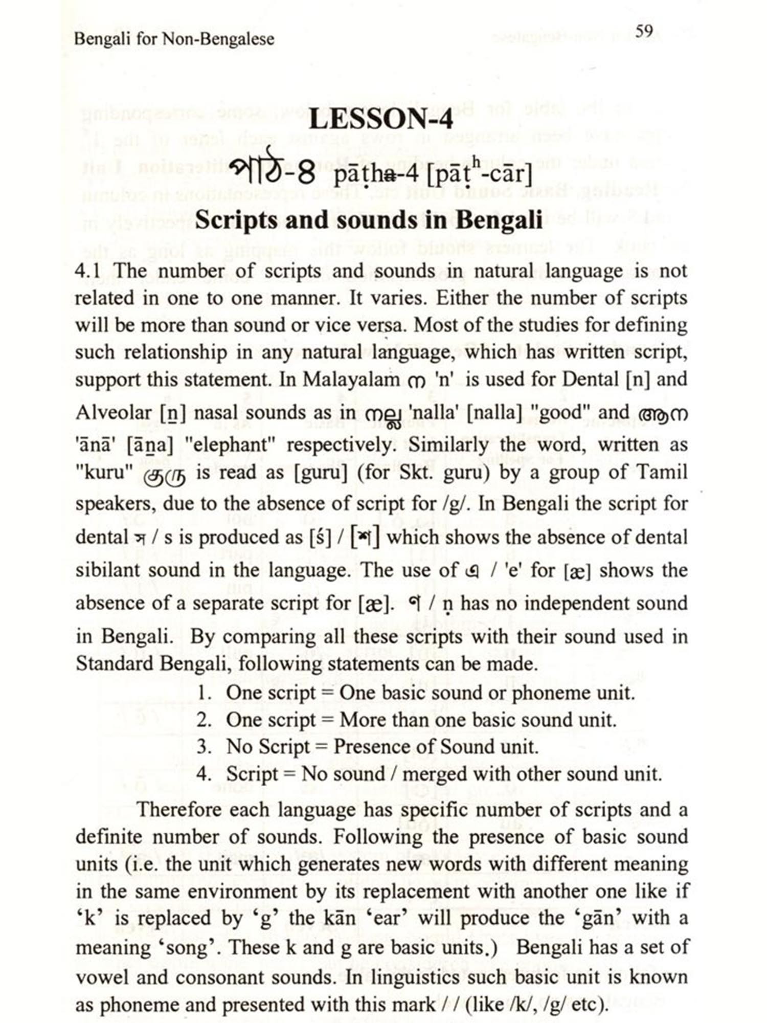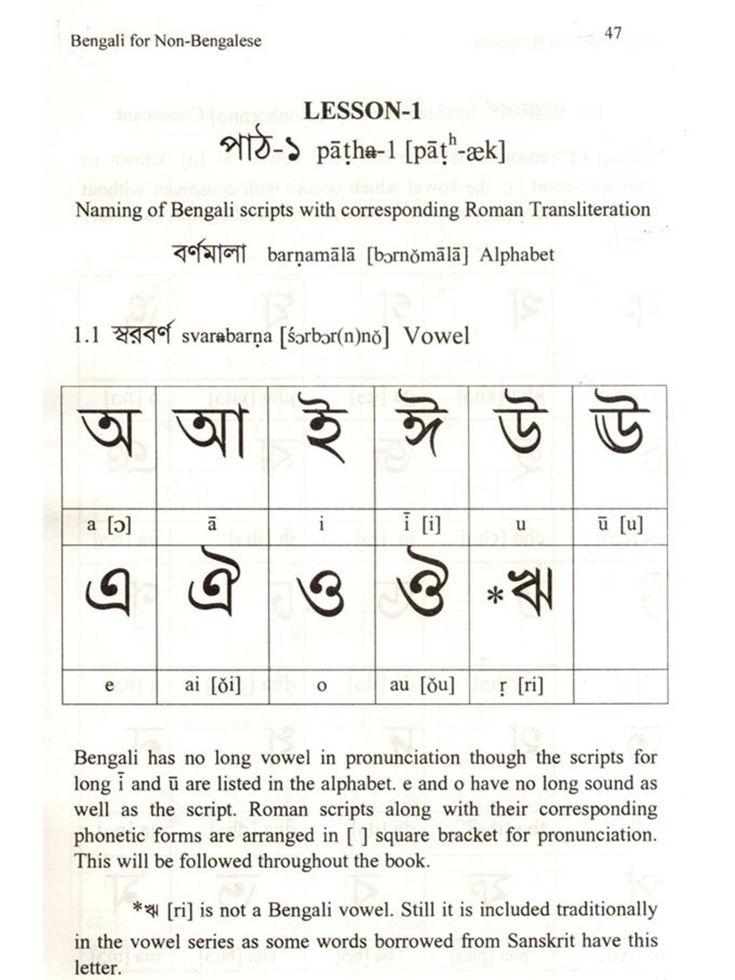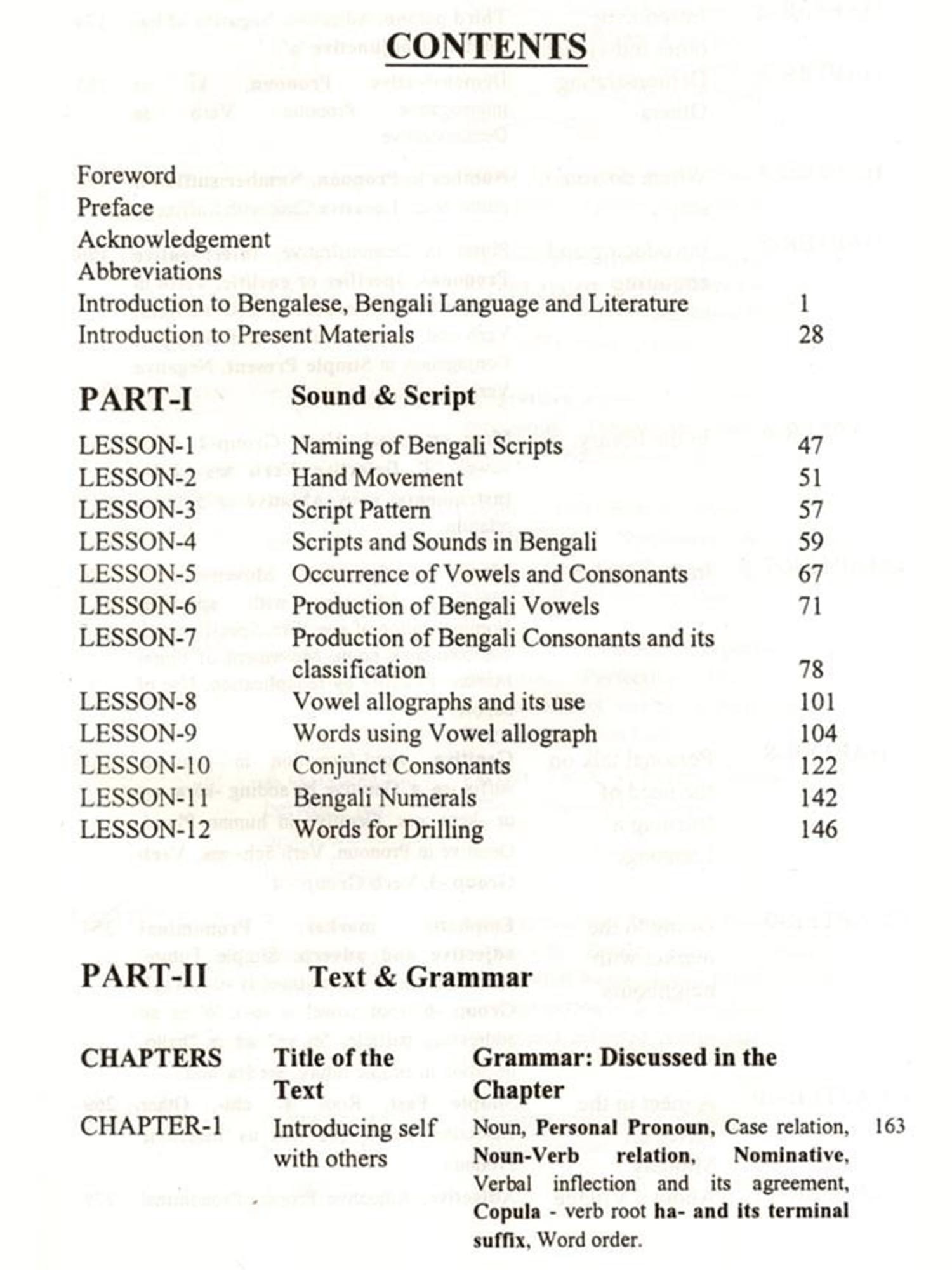 During the text preparation a serious contradiction was observed between the development of discourse of the texts and the need for grammatical sections relevant for the systematic learning of the language. Generally a text is a onetime representation whereas the learning of a grammar expects to follow an order of different sections in the temporal axis of learning within a certain period maintaining structural hierarchy. When a writer writes a text s/he does not bother the order of grammatical phenomena in learning but that is important during the course preparation. At the beginning chapters without introducing the simple script, one has to use the conjunct scripts like 'ক্ষ' 'ks' in a word like শিক্ষক 'Siksaka [sikkhok]' 'teacher' or without learning the formation of a compound verb like 'gaane kar-' 'to sing' the author needs to use such forms which is a violation of the order of learning a grammar. Such contradictions were faced frequently even in the classes. Students need the explanation for that. Similarly for the generation of the texuality in a text for the preliminary classes during the use of vocabulary one has to consider the order of learning, order of grammatical function, need for cohesion and coherence etc which are really a difficult task but has been tried to consider to some extent in this work. Finally throughout this book the Roman Transliteration has been used with some IPA symbols to avoid the burden of scripts. Students from any language group can go through the texts as a self-learner without facing any problem either in spelling or in pronunciation. If it helps the student as well as teachers in Bengali teaching and learning the effort will be fruitful.