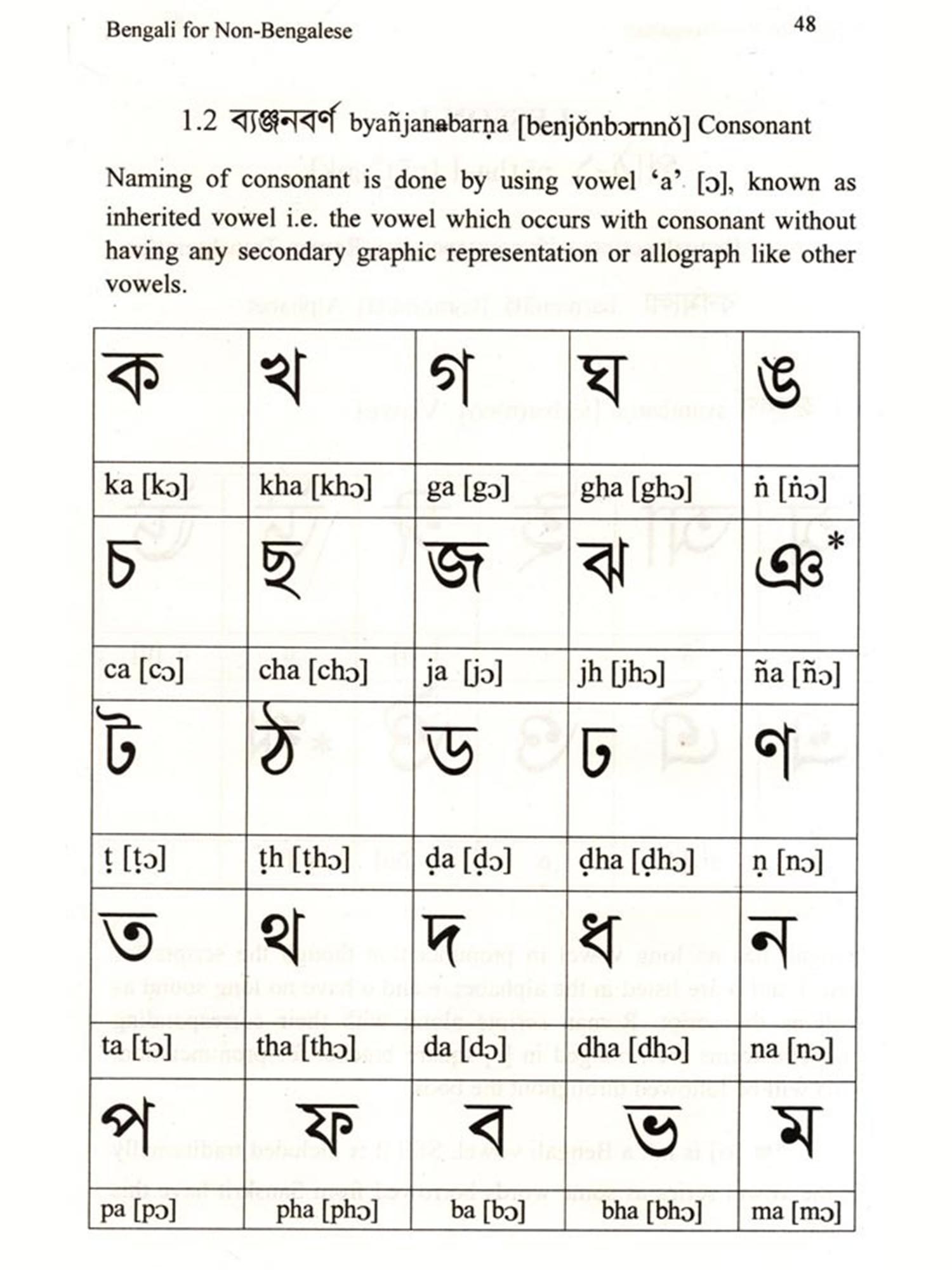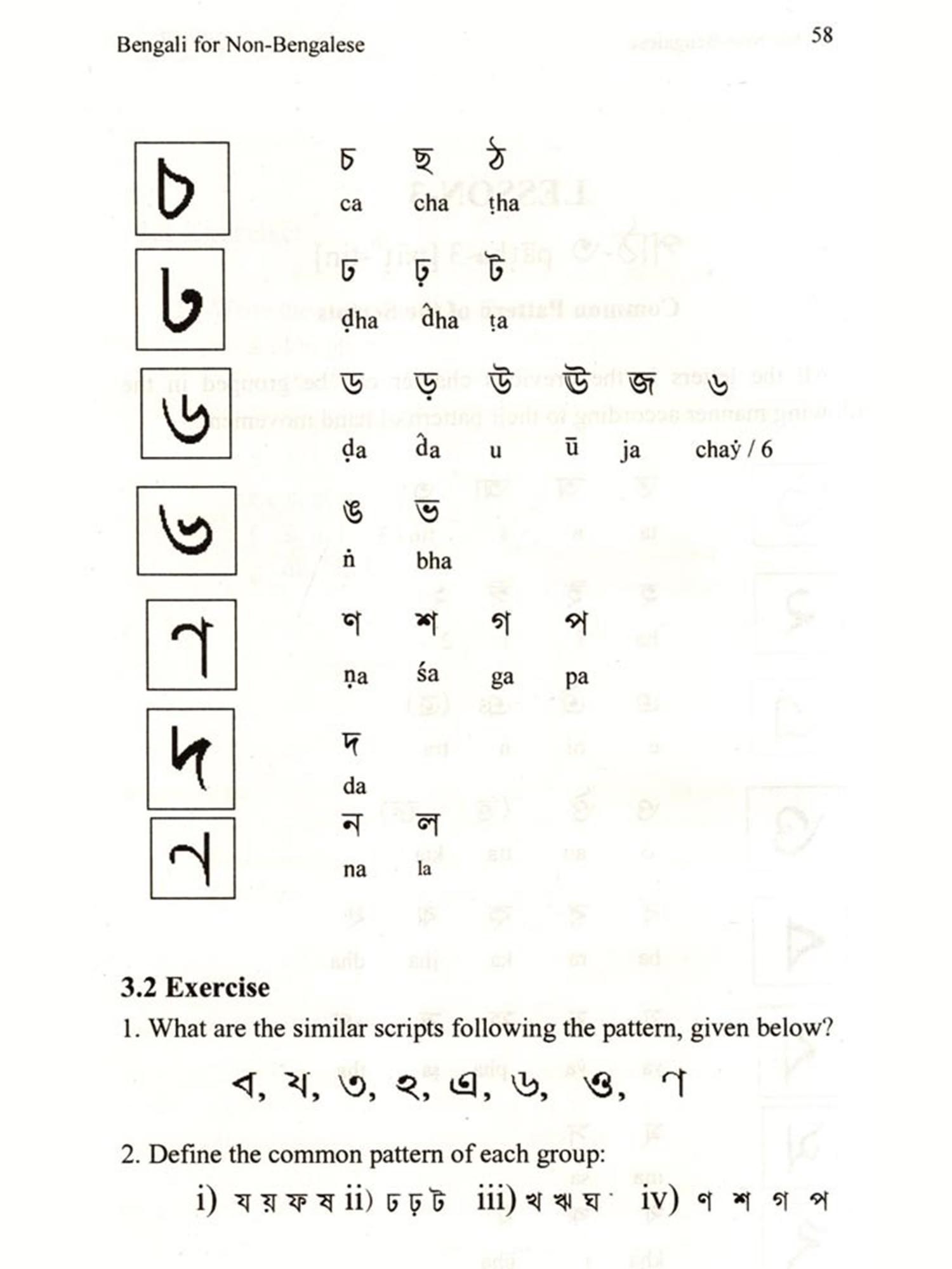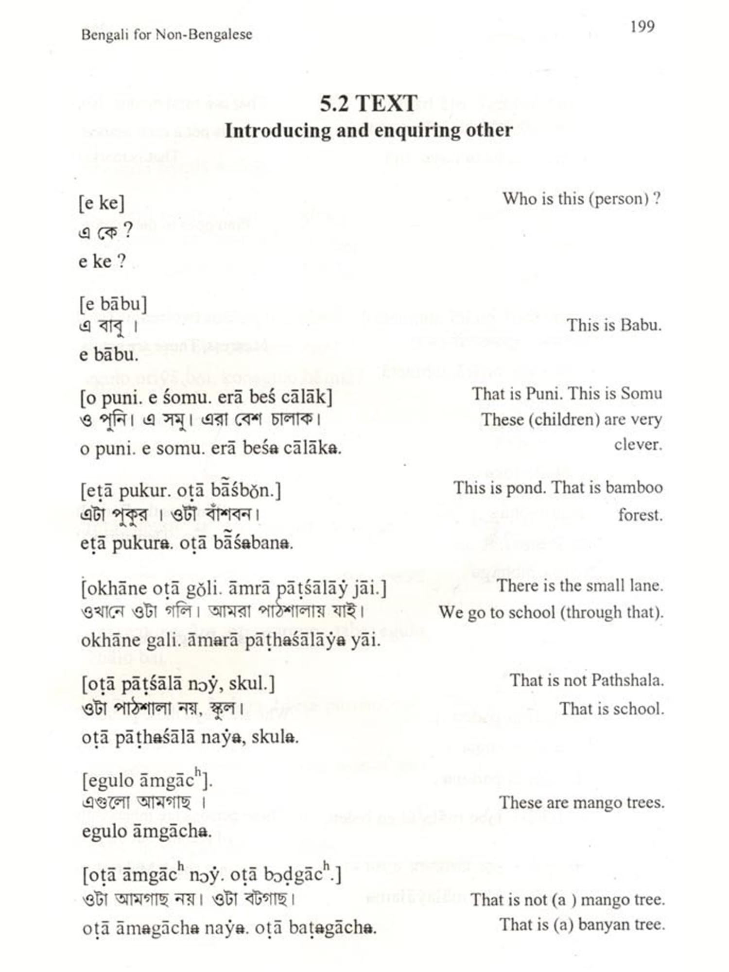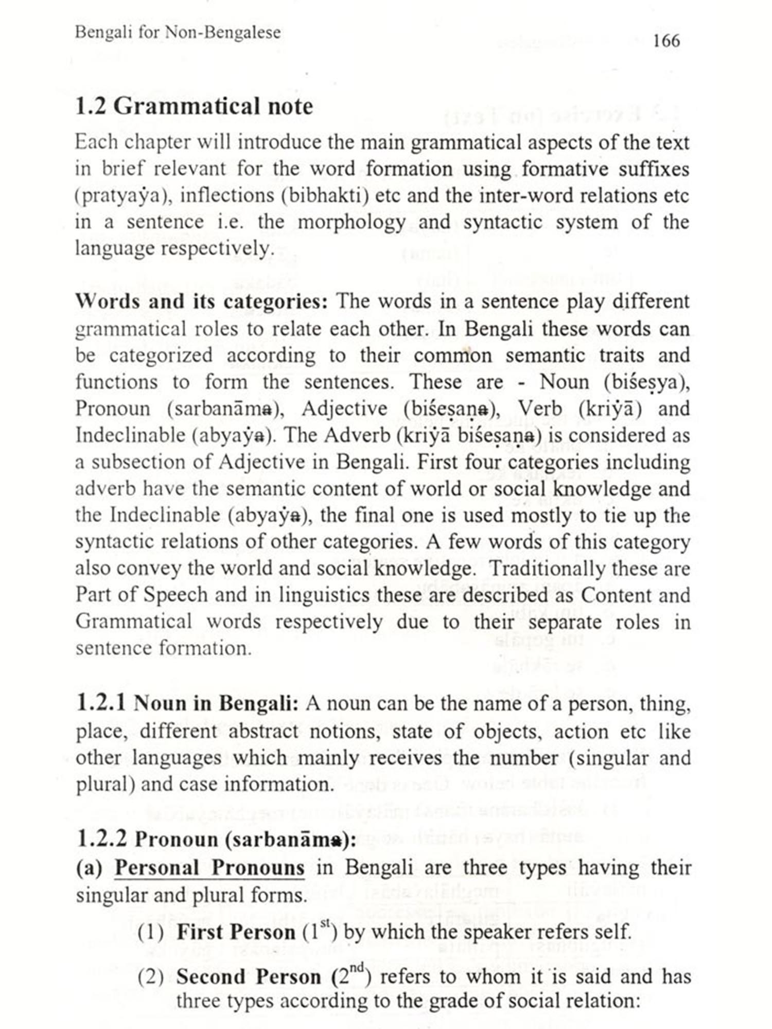 During the text preparation a serious contradiction was observed between the development of discourse of the texts and the need for grammatical sections relevant for the systematic learning of the language. Generally a text is a onetime representation whereas the learning of a grammar expects to follow an order of different sections in the temporal axis of learning within a certain period maintaining structural hierarchy. When a writer writes a text s/he does not bother the order of grammatical phenomena in learning but that is important during the course preparation. At the beginning chapters without introducing the simple script, one has to use the conjunct scripts like 'ক্ষ' 'ks' in a word like শিক্ষক 'Siksaka [sikkhok]' 'teacher' or without learning the formation of a compound verb like 'gaane kar-' 'to sing' the author needs to use such forms which is a violation of the order of learning a grammar. Such contradictions were faced frequently even in the classes. Students need the explanation for that. Similarly for the generation of the texuality in a text for the preliminary classes during the use of vocabulary one has to consider the order of learning, order of grammatical function, need for cohesion and coherence etc which are really a difficult task but has been tried to consider to some extent in this work. Finally throughout this book the Roman Transliteration has been used with some IPA symbols to avoid the burden of scripts. Students from any language group can go through the texts as a self-learner without facing any problem either in spelling or in pronunciation. If it helps the student as well as teachers in Bengali teaching and learning the effort will be fruitful.