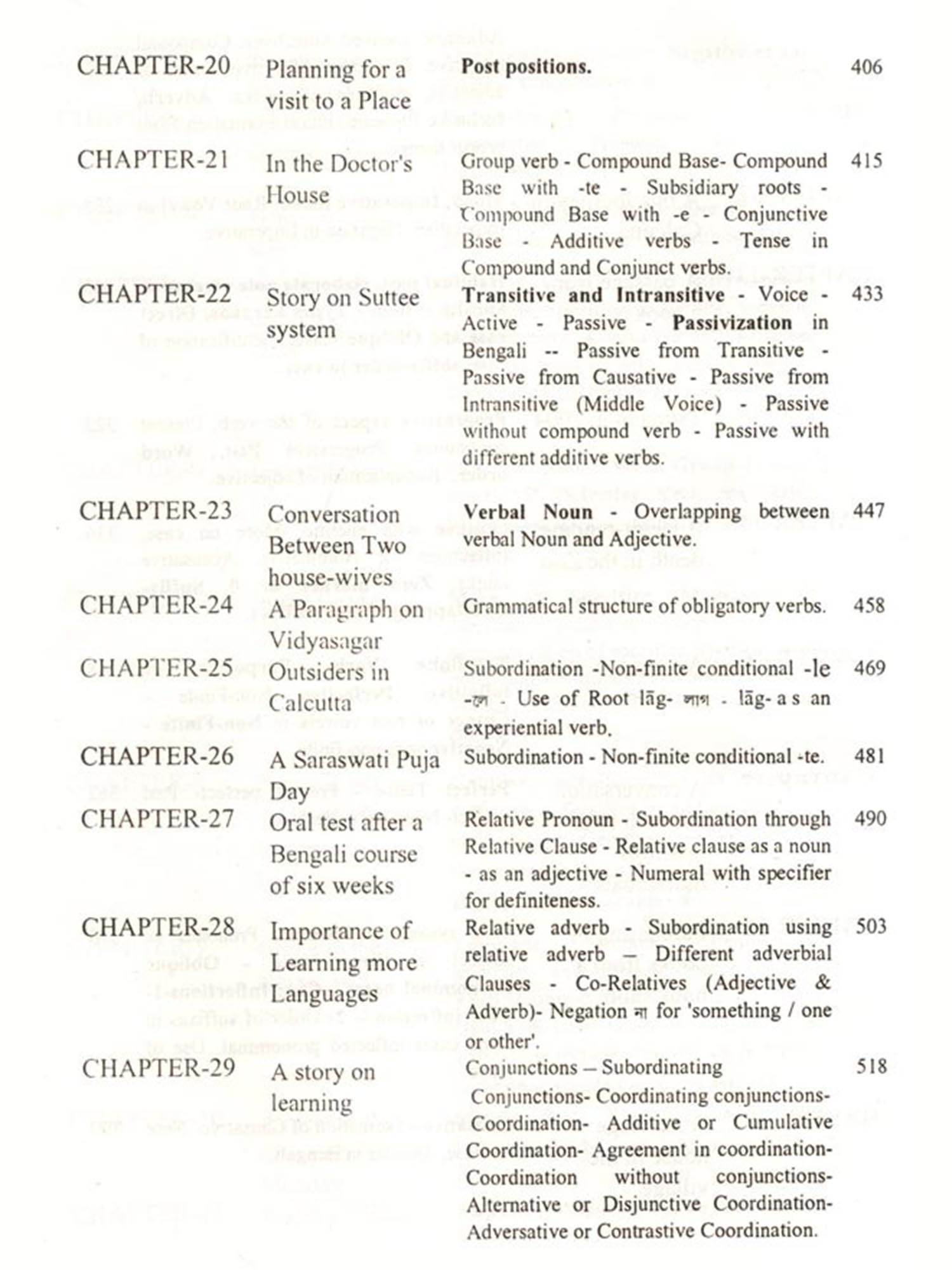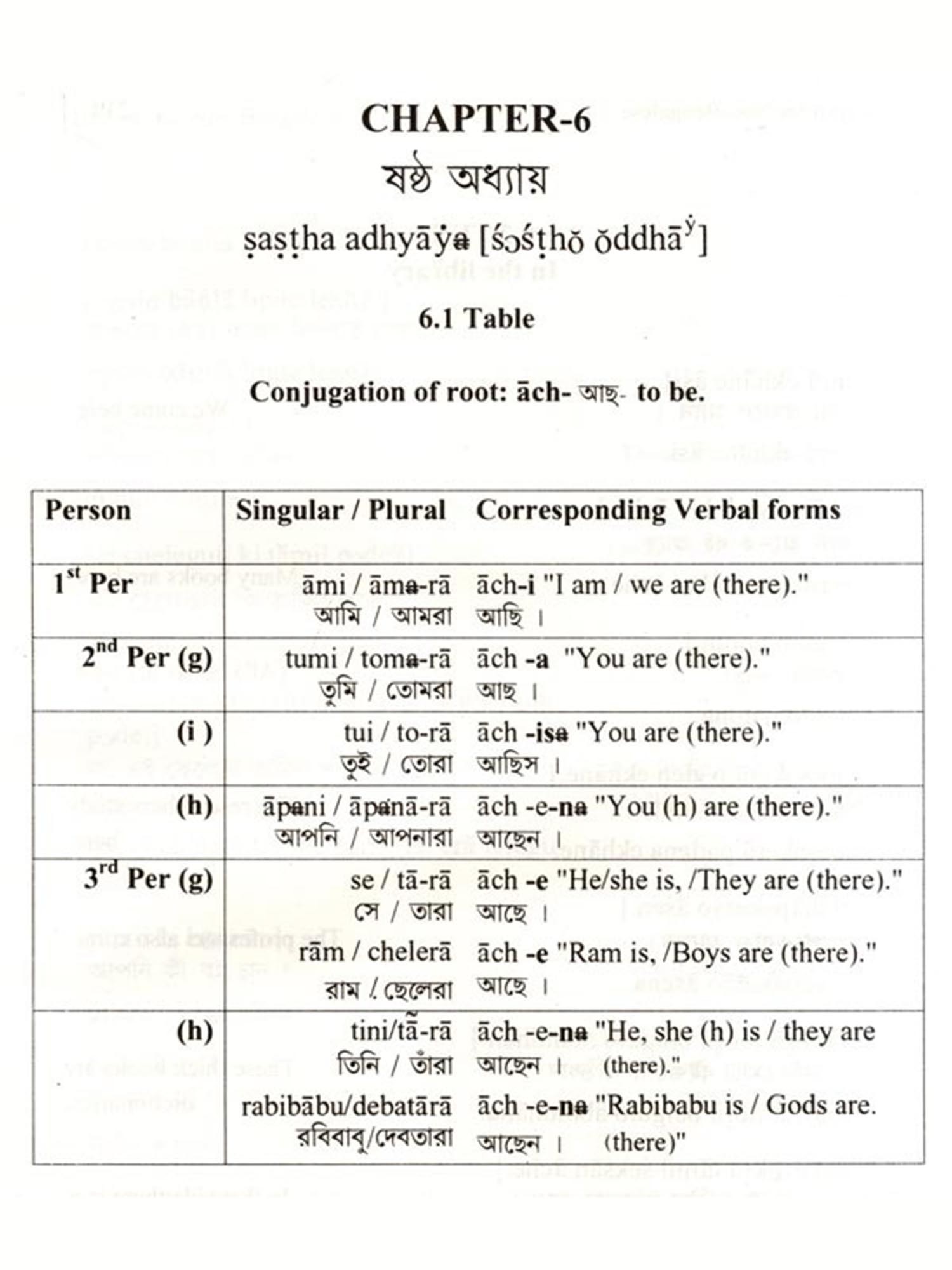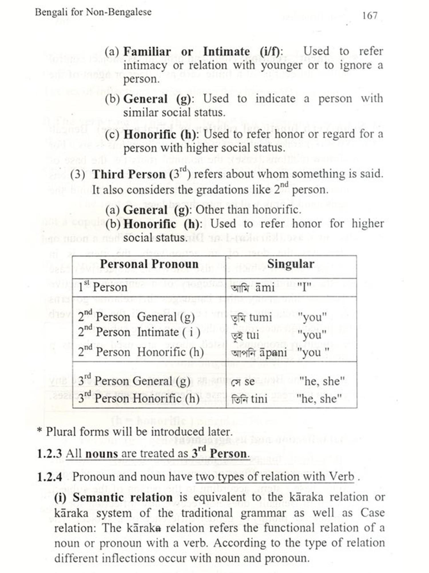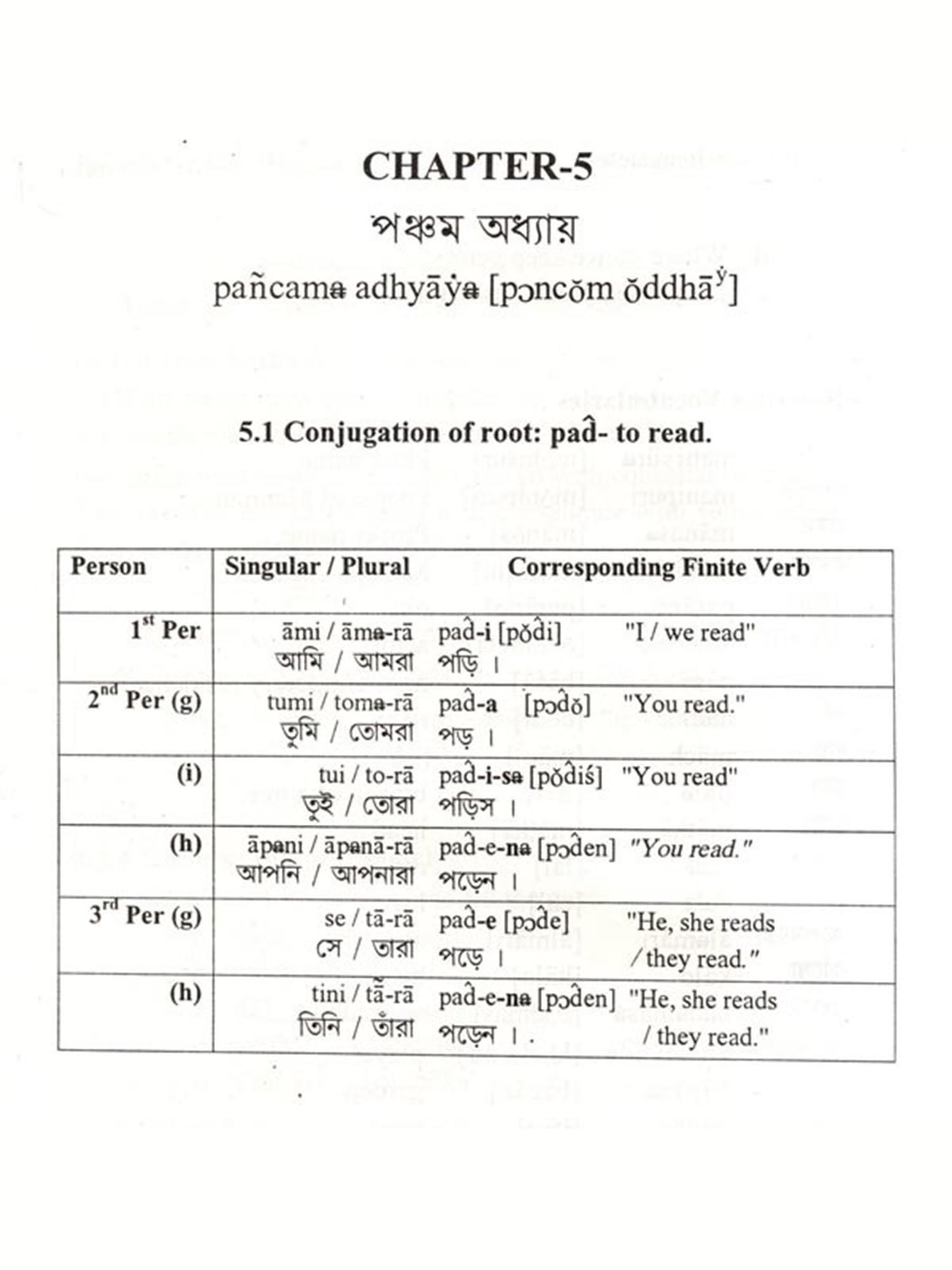 During the text preparation a serious contradiction was observed between the development of discourse of the texts and the need for grammatical sections relevant for the systematic learning of the language. Generally a text is a onetime representation whereas the learning of a grammar expects to follow an order of different sections in the temporal axis of learning within a certain period maintaining structural hierarchy. When a writer writes a text s/he does not bother the order of grammatical phenomena in learning but that is important during the course preparation. At the beginning chapters without introducing the simple script, one has to use the conjunct scripts like 'ক্ষ' 'ks' in a word like শিক্ষক 'Siksaka [sikkhok]' 'teacher' or without learning the formation of a compound verb like 'gaane kar-' 'to sing' the author needs to use such forms which is a violation of the order of learning a grammar. Such contradictions were faced frequently even in the classes. Students need the explanation for that. Similarly for the generation of the texuality in a text for the preliminary classes during the use of vocabulary one has to consider the order of learning, order of grammatical function, need for cohesion and coherence etc which are really a difficult task but has been tried to consider to some extent in this work. Finally throughout this book the Roman Transliteration has been used with some IPA symbols to avoid the burden of scripts. Students from any language group can go through the texts as a self-learner without facing any problem either in spelling or in pronunciation. If it helps the student as well as teachers in Bengali teaching and learning the effort will be fruitful.