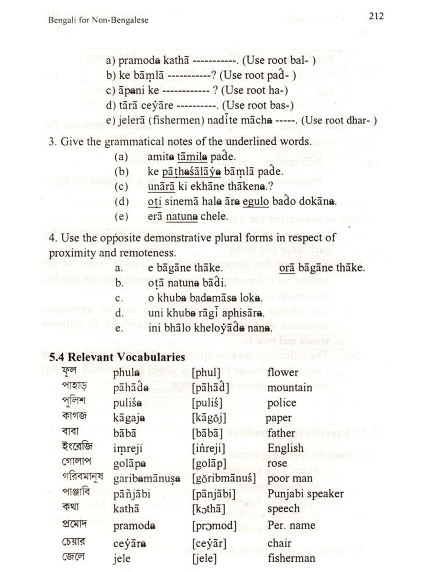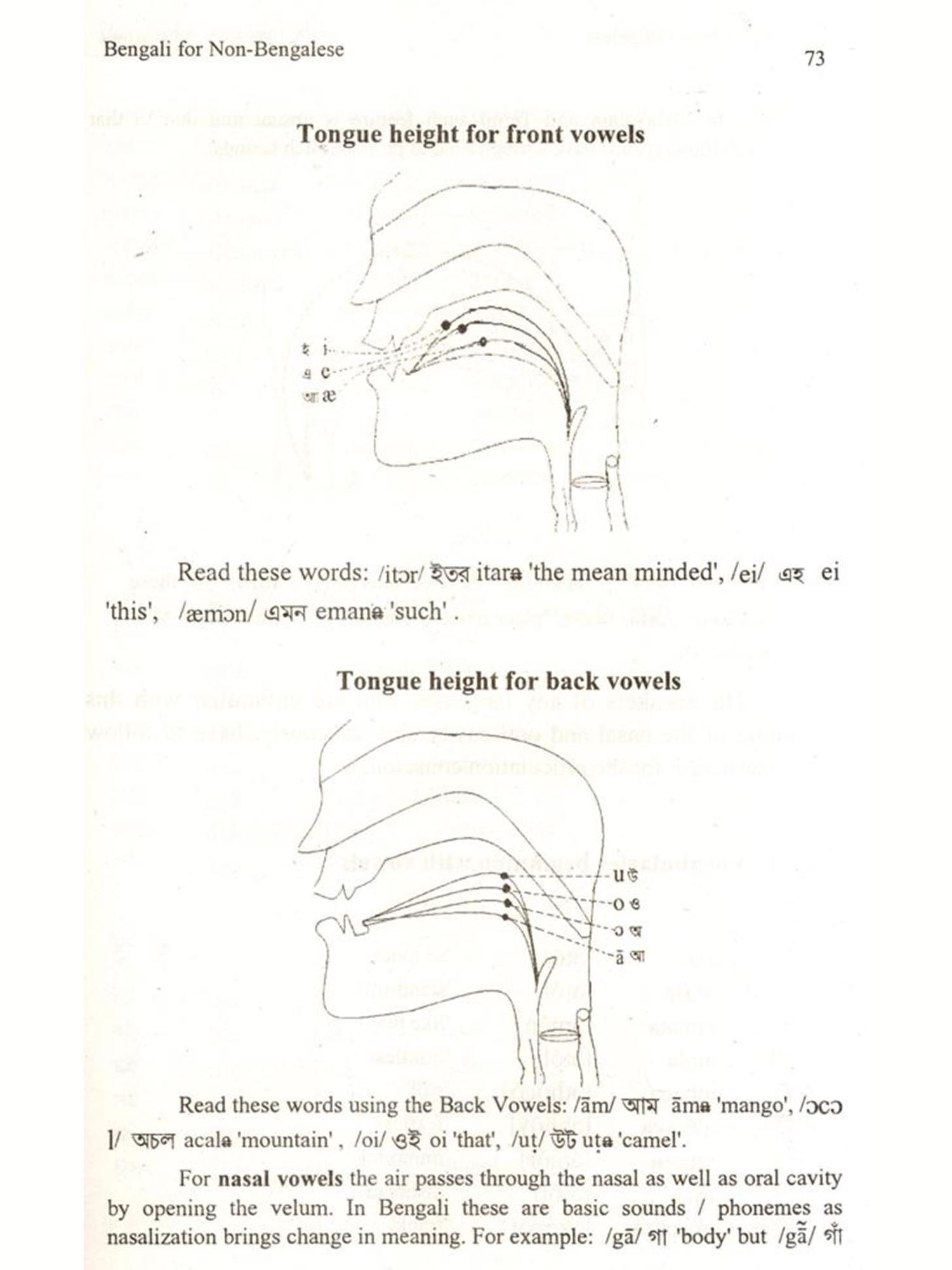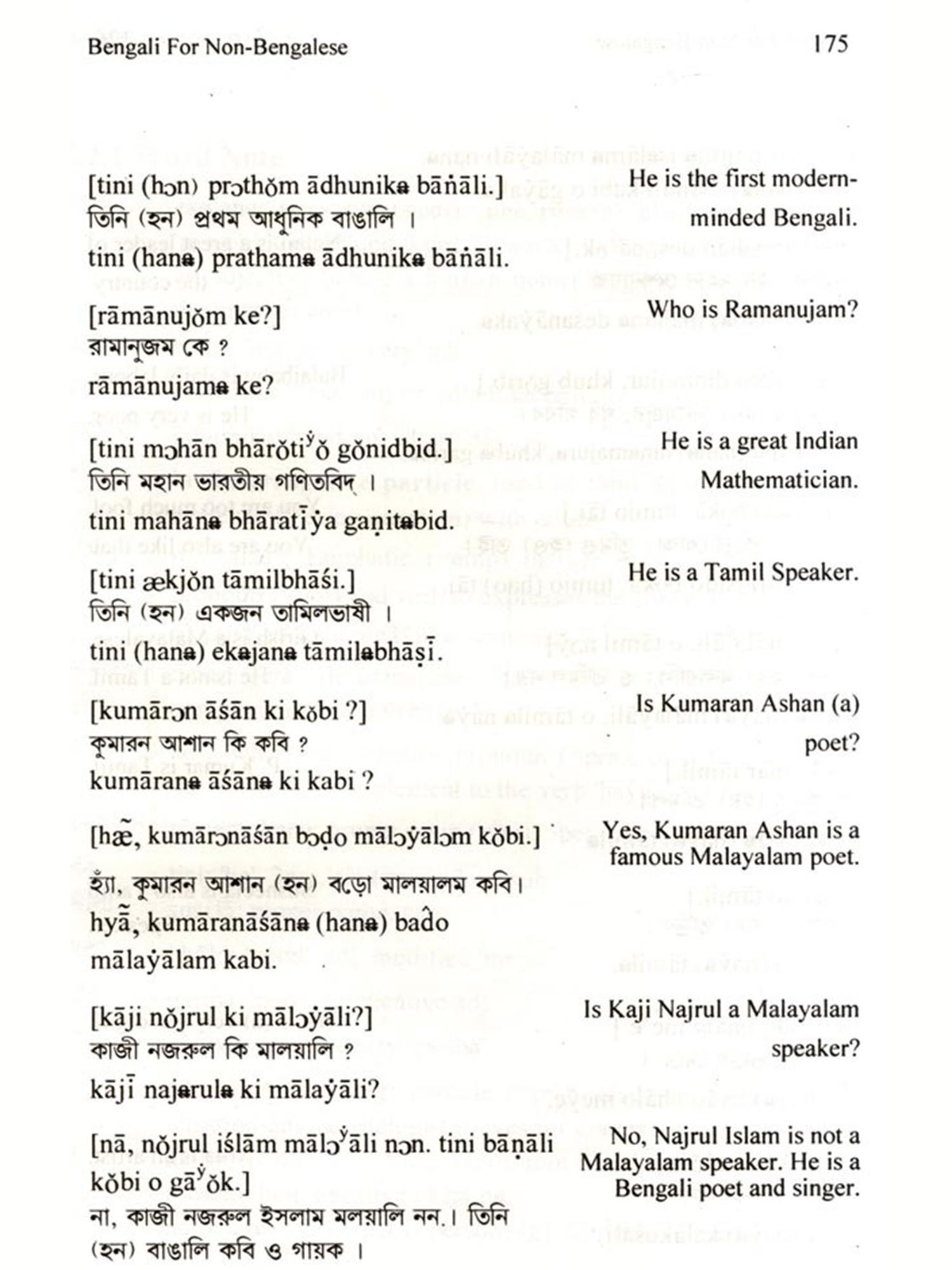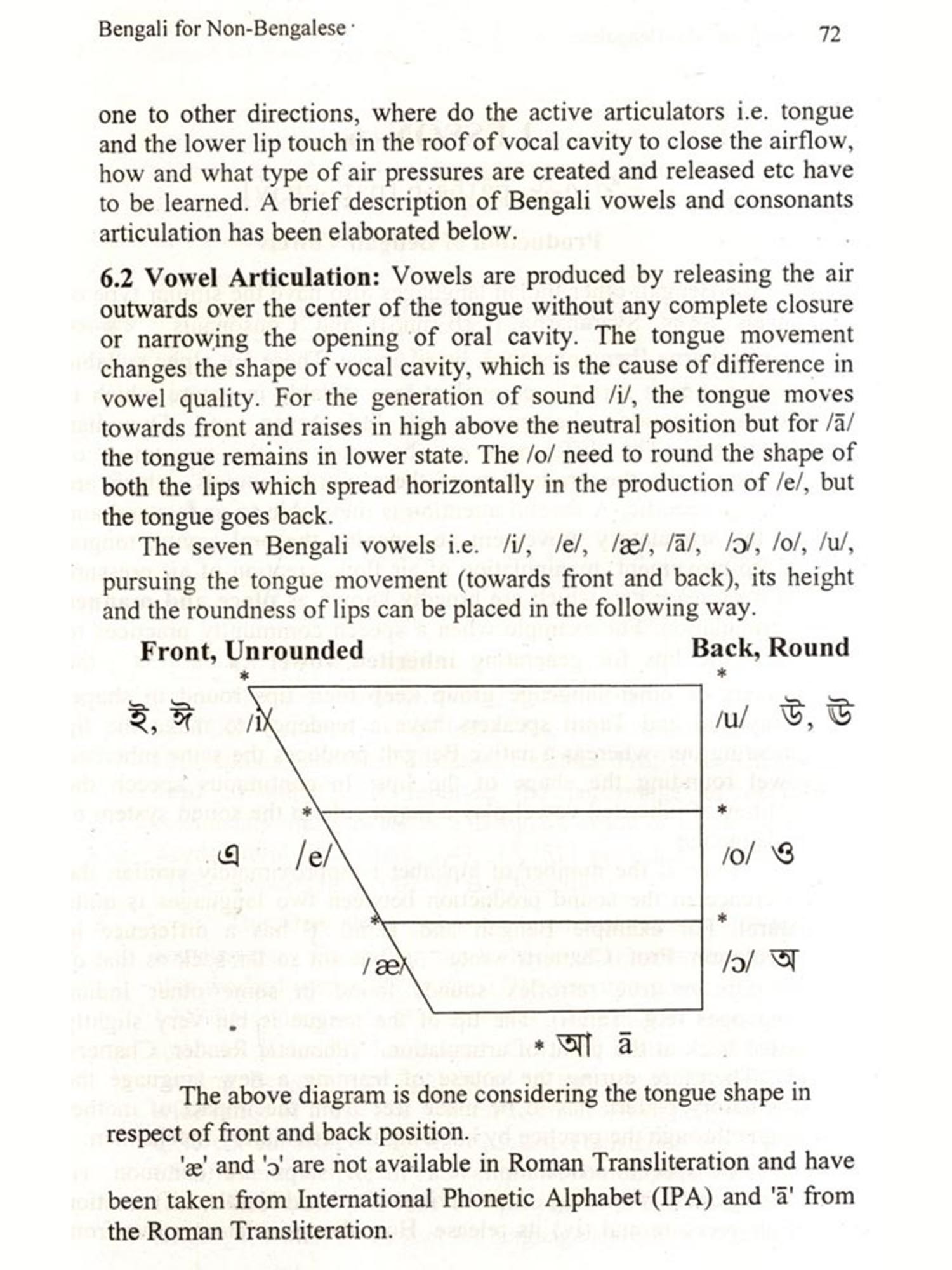 During the text preparation a serious contradiction was observed between the development of discourse of the texts and the need for grammatical sections relevant for the systematic learning of the language. Generally a text is a onetime representation whereas the learning of a grammar expects to follow an order of different sections in the temporal axis of learning within a certain period maintaining structural hierarchy. When a writer writes a text s/he does not bother the order of grammatical phenomena in learning but that is important during the course preparation. At the beginning chapters without introducing the simple script, one has to use the conjunct scripts like 'ক্ষ' 'ks' in a word like শিক্ষক 'Siksaka [sikkhok]' 'teacher' or without learning the formation of a compound verb like 'gaane kar-' 'to sing' the author needs to use such forms which is a violation of the order of learning a grammar. Such contradictions were faced frequently even in the classes. Students need the explanation for that. Similarly for the generation of the texuality in a text for the preliminary classes during the use of vocabulary one has to consider the order of learning, order of grammatical function, need for cohesion and coherence etc which are really a difficult task but has been tried to consider to some extent in this work. Finally throughout this book the Roman Transliteration has been used with some IPA symbols to avoid the burden of scripts. Students from any language group can go through the texts as a self-learner without facing any problem either in spelling or in pronunciation. If it helps the student as well as teachers in Bengali teaching and learning the effort will be fruitful.