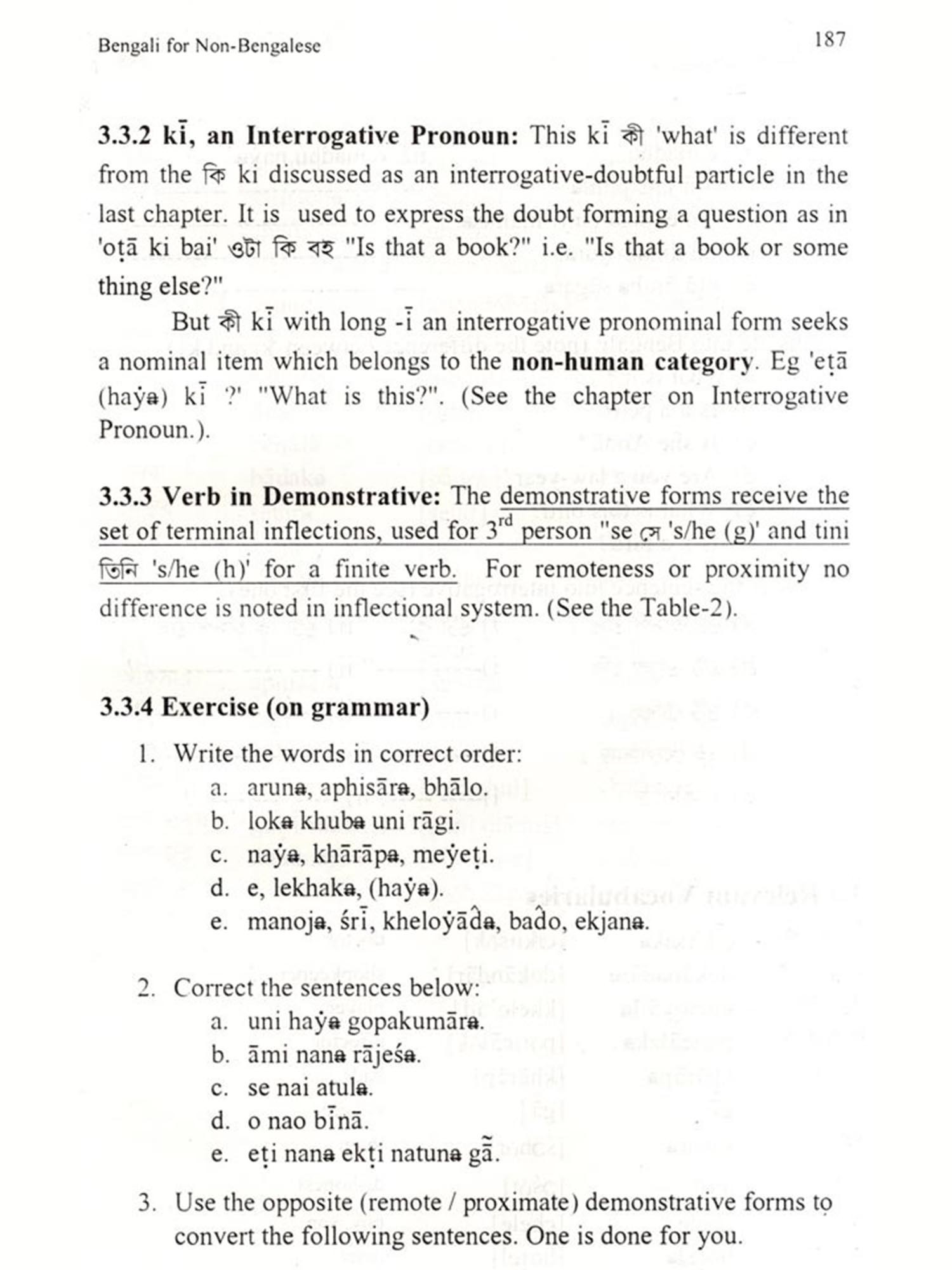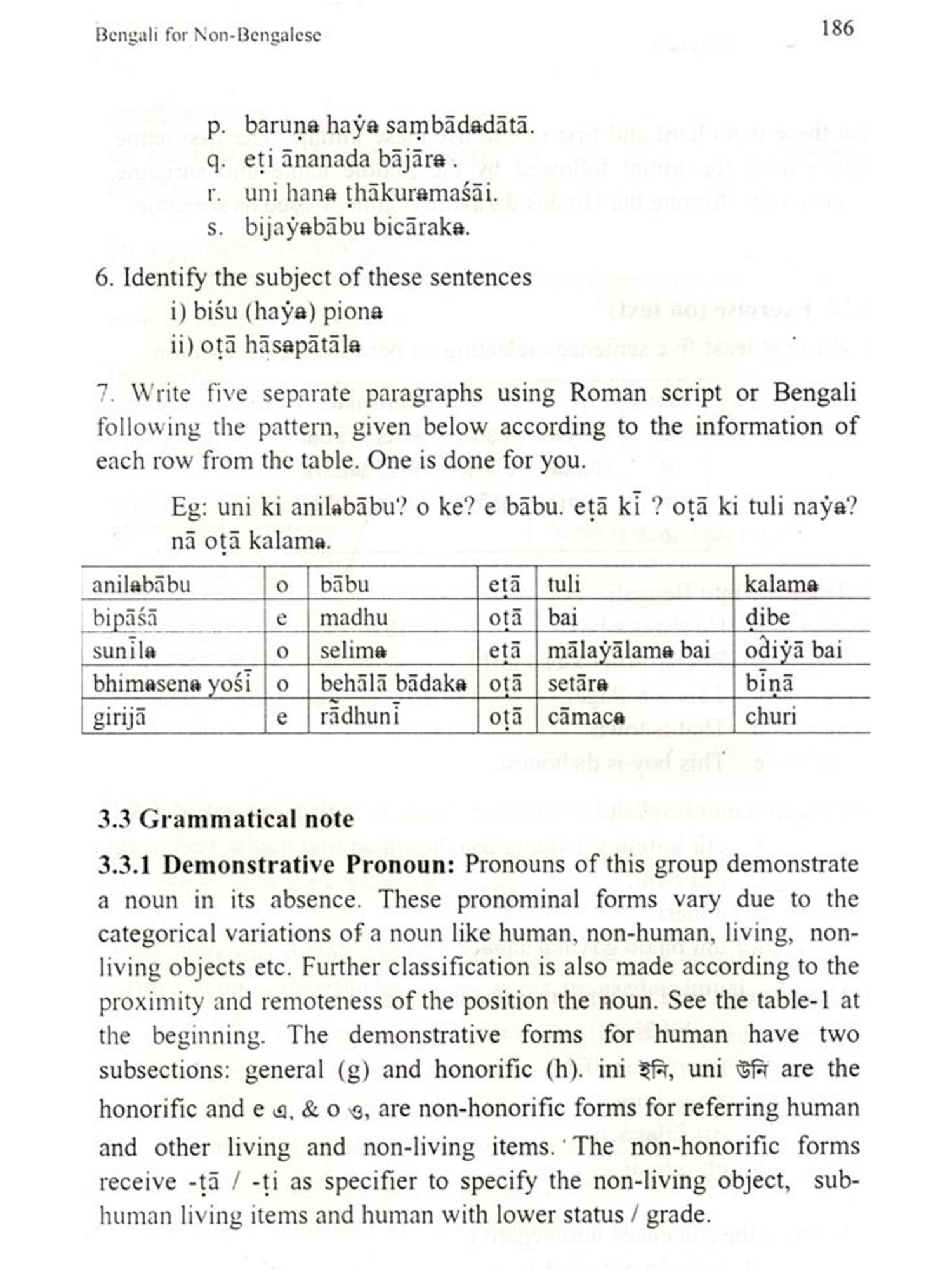 Another problem raised by some students is that no reference grammar on Bengali written in English is available. Some standard books are available but those are not meant for the primary learners. Similarly the method of teaching also needs the text and other materials according to this need.