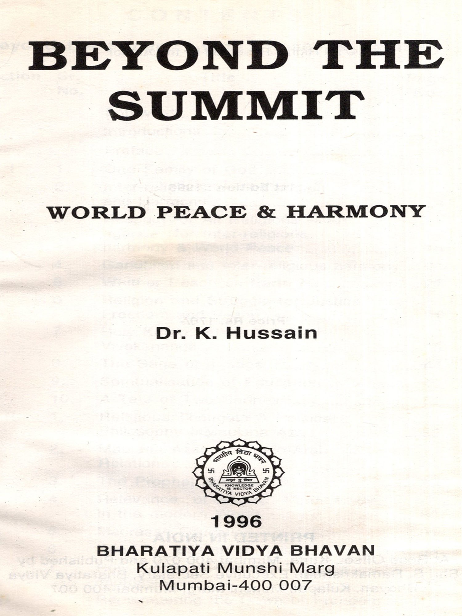 I first came to know Dr. K. Hussain, and Mrs. Hussain, some years ago, when he had kindly invited me to speak on peace and harmony at one of the Institution's functions. That as it may, we both share a deep and abiding interest in peace and harmony, a subject very dear to me, if not for any other reason, but that I grew up in such an environment during my 35 years’ service in the Indian Army, an organisation I am intensely proud of. Since then there has been no looking back over the intervening years on this very flourishing and productive relationship, because of the commonality in concerns and interests: Ecology: the Environment: Inter Religious Dialogue; Peace Communal Harmony: Values; and Leadership. To this end I have been a frequent invitee to Saboo Siddik college of Engineering Understandingly, I consider it leg and a pleasure to pen this introduction to his book "Beyond The Summit", an anthology of his numerous articles appearing in the media and magazines a pointer to Dr. Hussain's multi-faceted personality, whose abiding concern is what we all seek, viz, Peace and Harmony. This interest becomes manifest through the pages of the Institution's Annual magazine "Summit".