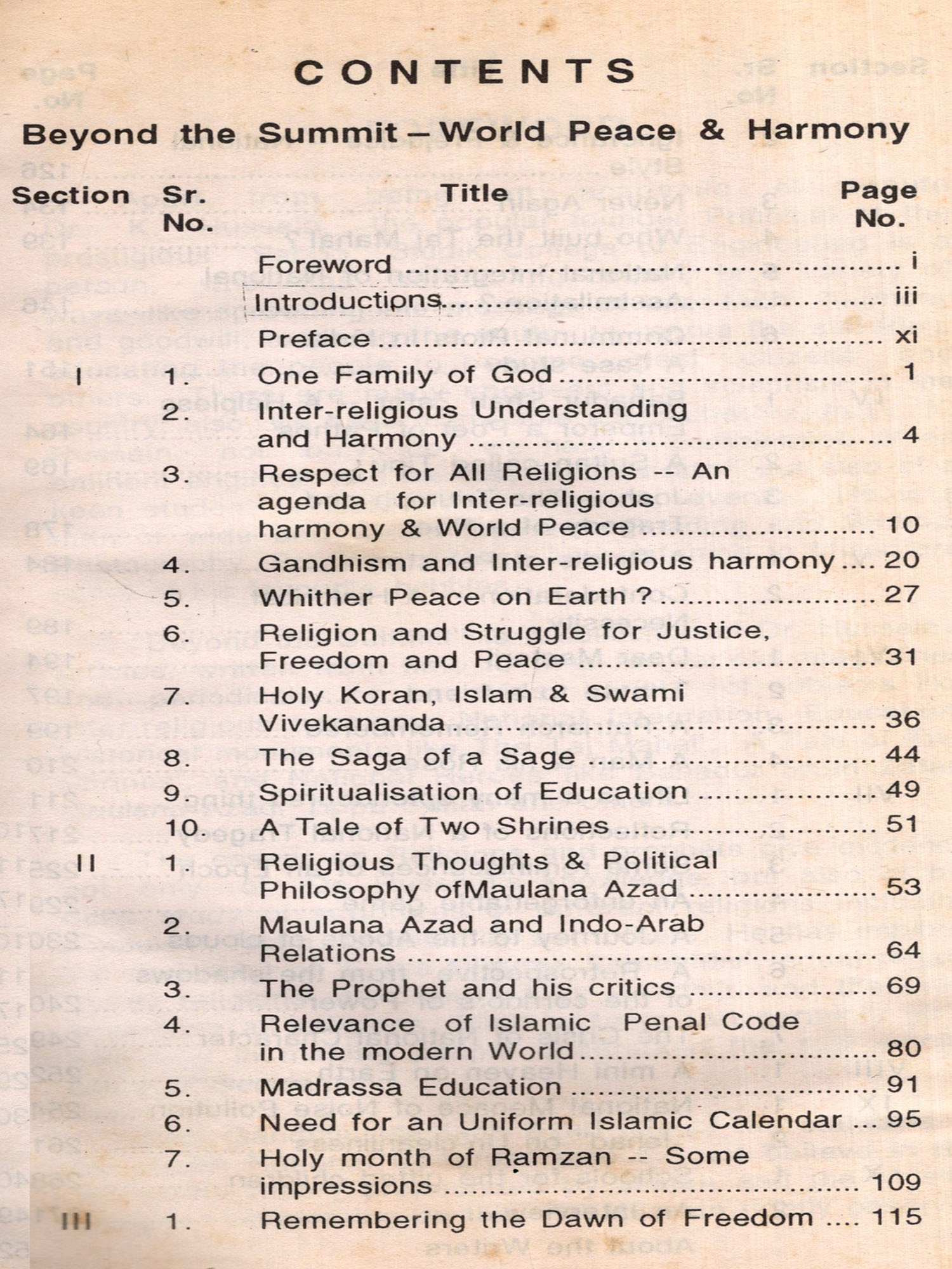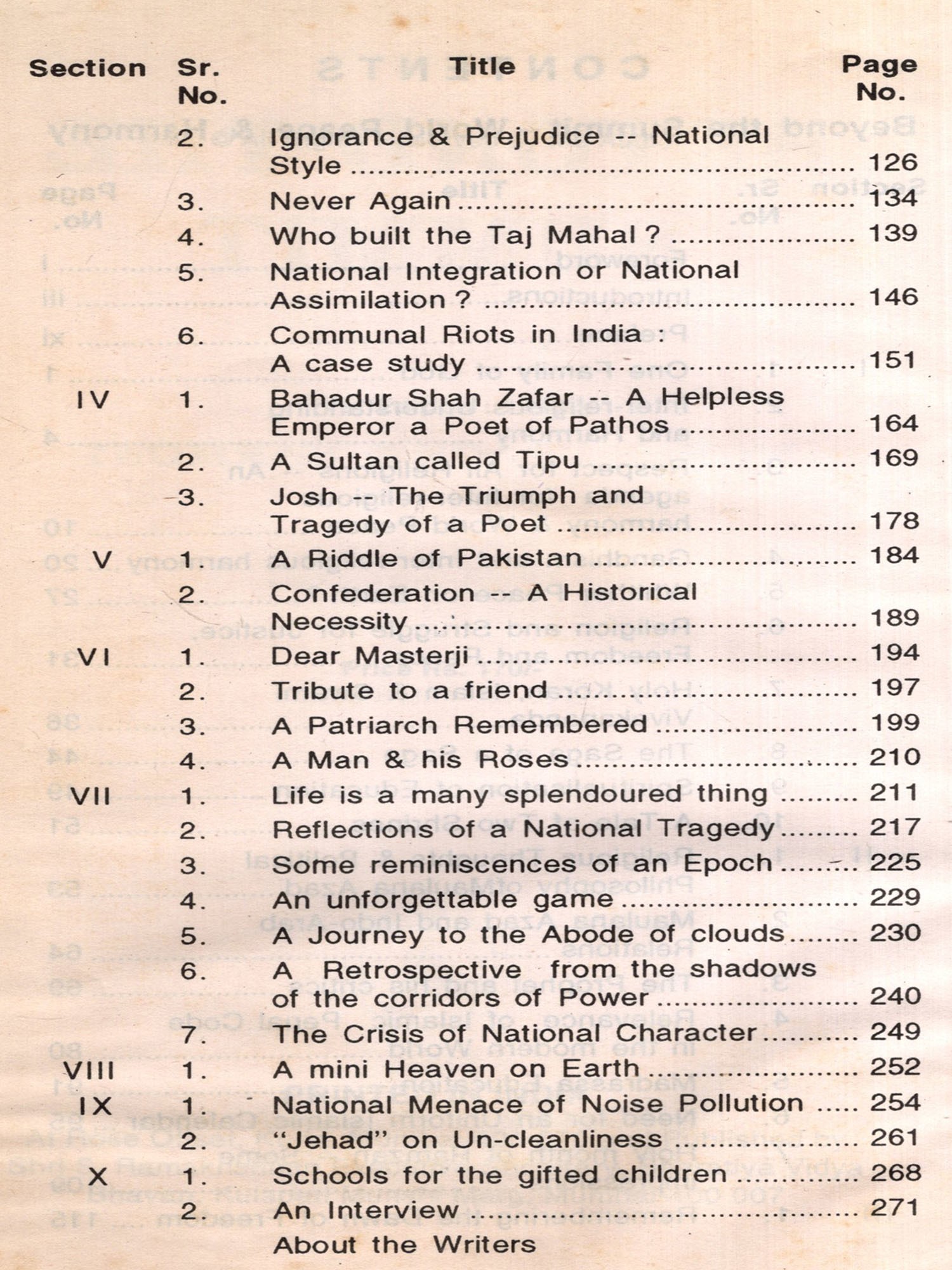 Dr. Hussain may not recognise it, but his concern is reflected unwittingly in one of my three modest manifestoes for the recent Assembly Electons!! Such is this nexus between two like-minded individuals, one an academic and the other a soldier. If proof is at all needed of the wide range of interests of an individual, who is by profession an academic, the areas and subjects covered in his articles would surely be an indicator. This very absorbing and interesting collection of essays and descriptive articles covers, inter alia, inter religious understanding, Peace and Harmony. Human Rights, Justice and Peace, History, Personalities influencing Indian History like Bahadur Shah Zafar, Maulana Abul Kalam Azad, Josh Mahilbadi et al. The views and concerns expressed by him in these wide-ranging themes are not only balanced, but more importantly unbiased, reflecting his abiding passion for national integration and his anguish at India's major tragedy of communal disharmony. Is it any wonder then why he is listened and heard with so much respect, why he is called upon to share his views; why, among his many admirers are Gandhian Dr. Usha Mehta and journalist S. B. Kolpe: why, he has written with such feeling "A Man And His Roses", a fitting and eulogy the late S. Rajagaopalan, who contributed so tangibly to the construction of the new Institute building. He displays a flair for descriptive prose evident in the article "Abode of the Clouds". Whether this gentle and committed academic shares his thoughts with his fellow-persons, be it on "The School For Gifted Children" or environmental concerns as in "Jehad on Uncleanliness" or "The National Menace of Noise Pollution", there is a constant discernible streak of compassion for individuals, and nature, but never with rancour, sarcasm, vindictiveness, bigotry or bias.