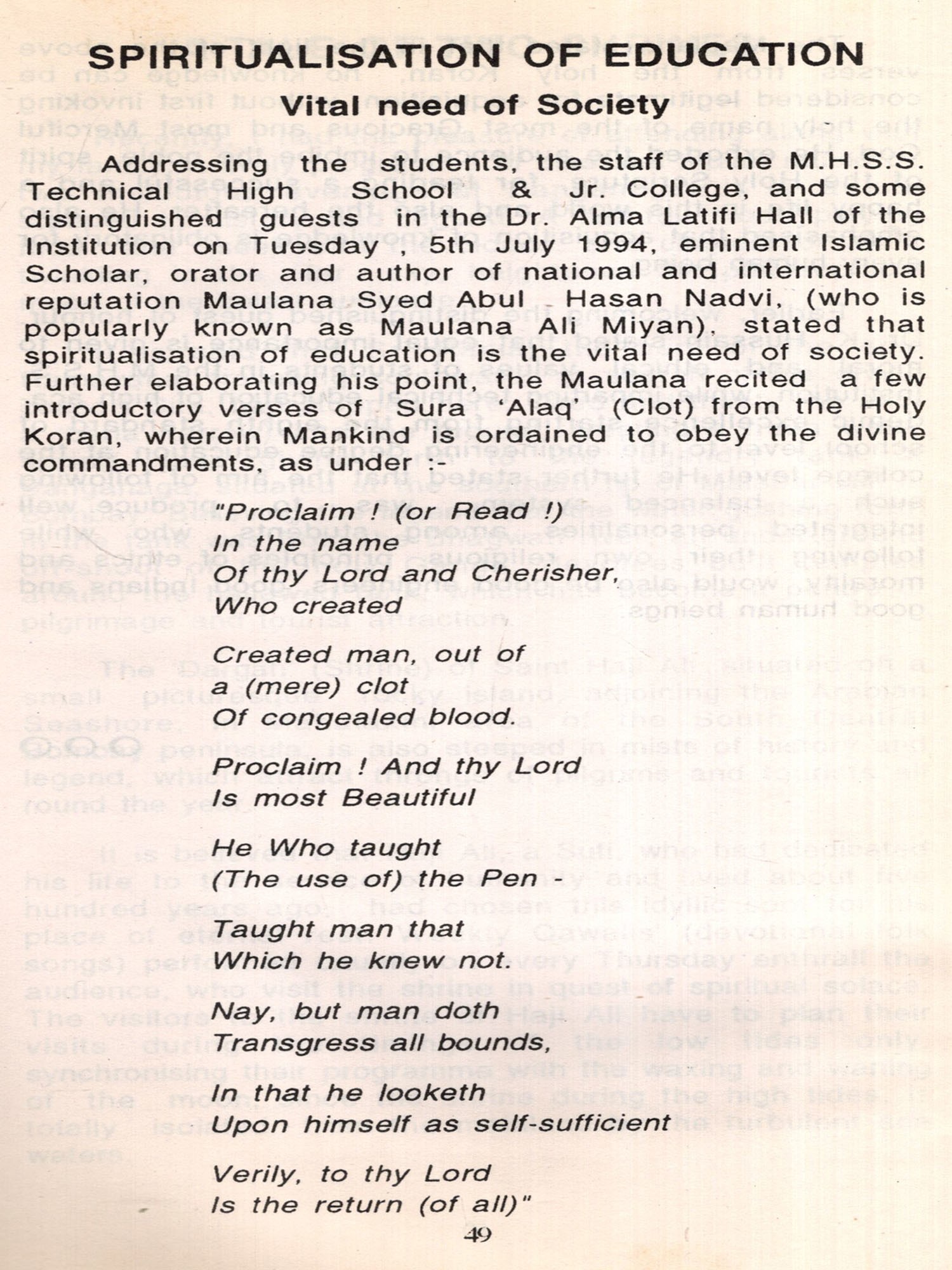 Unlike the fundamentalists and educationists with closed minds. Dr. Hussain, adopting a rational and progressive attitude regarding the system adopted in the Madarasas, well observes "the cobwebs of ignorance, obscurantism and prejudice that have gathered round this system of education have to be swept-off".