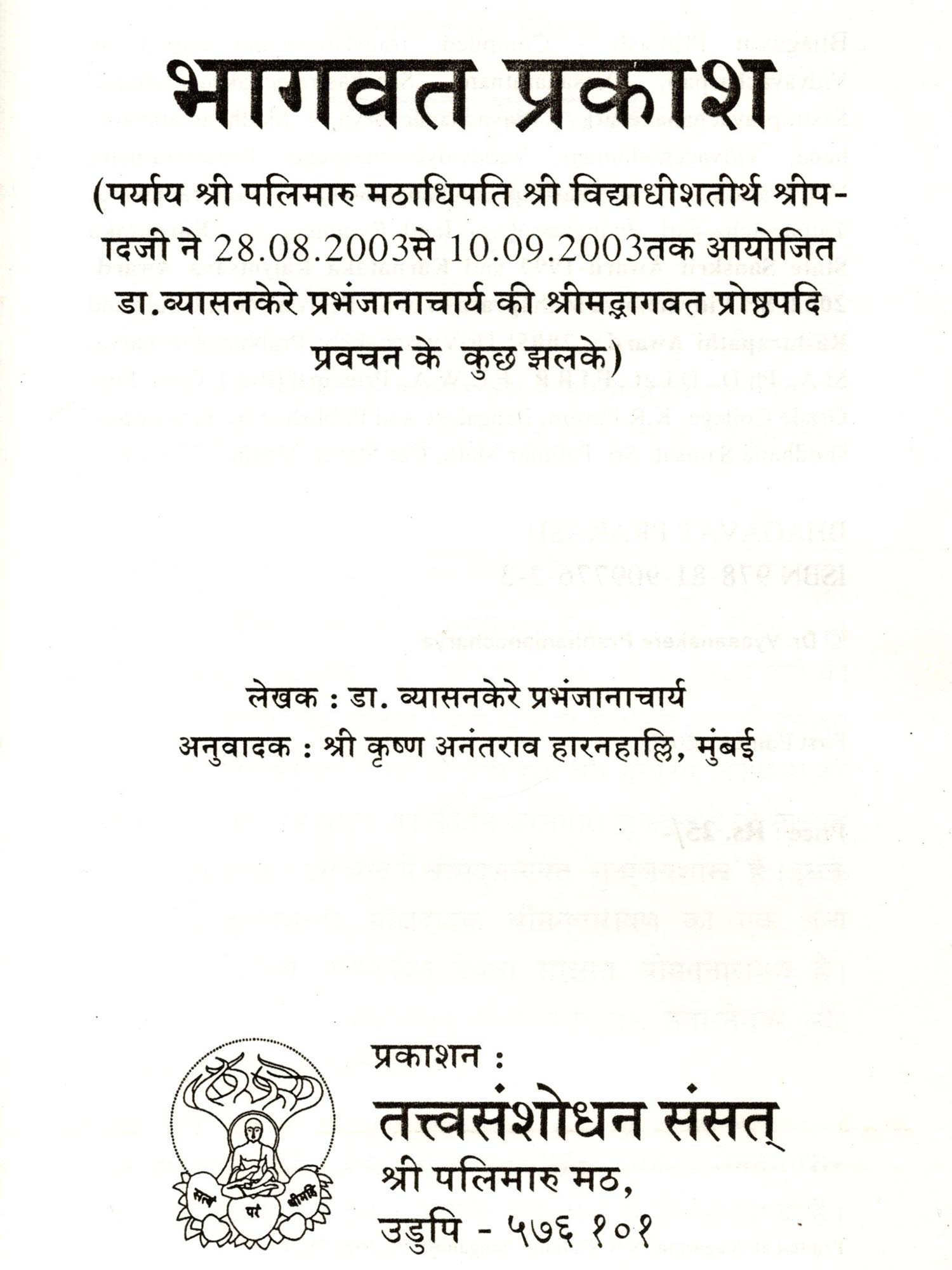 Paryaya Sri Palimaru Mathadhipati Sri Vidyadhishtirtha Sripadji held from 28.08.2003 to Some glimpses of Srimad Bhagavatam Prosthapadi discourse by Vyasankere Prabhanjanacharya