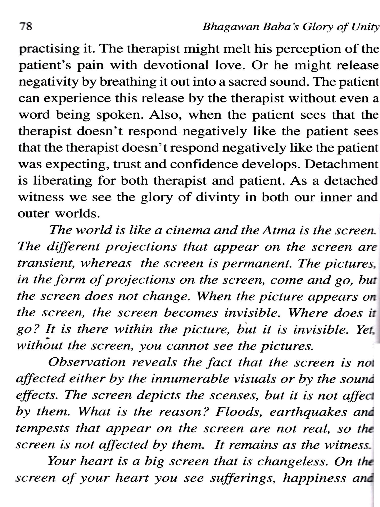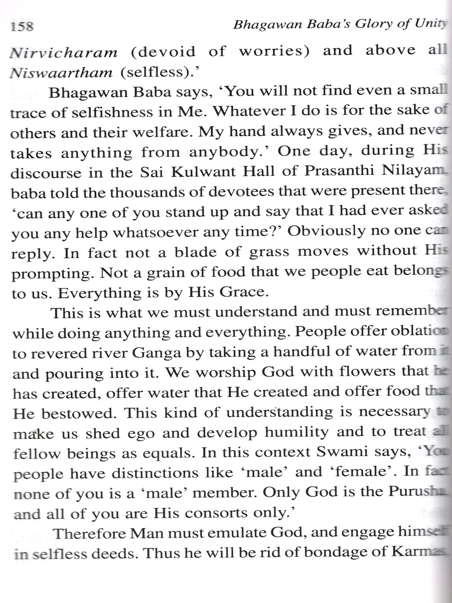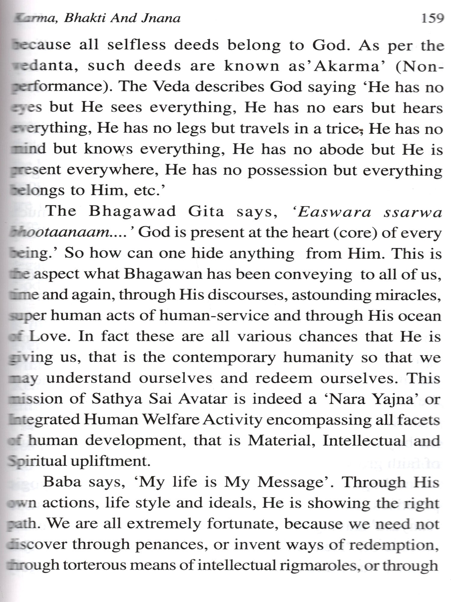 The advent of Sri Sathya Sai Avatar is undoubtedly the greatest phenomenon that the Earth had ever witnessed, in terms of single-handed lifetime achievements, in terms of world wide recognition about superhuman capabilities, in terms of scholastic erudition upon physical and meta-physical faculties and ideas, in terms of idealistic way of living set forth as practical ideology; in terms of astounding miracles displayed in conjunction with upliftment of the downtrodden, saving of the distressed and redemption of the wayward; in terms of the great organizational abilities; in terms of capability of attracting people of all cadres, creeds, races, religions, professions and political affiliations; In terms of capabilities of curing most incurable and unbearable diseases without the aid of any medication or surgery and by mere 'will'; in terms of capabilities of appearing in several places at the same time; in terms of knowing the innermost thoughts of all people and innermost feelings of their hearts; in terms of great personal qualities of patience, truthfulness, virtuosity, lifelong celibacy, simple living, divine charisma, blemishless character and above all the unfathomable inexhaustible, selfless and spontaneous Love towards humans, animals, birds, insects, Gods and even the sinful beings; in terms of equality towards all religions; in terms of practicability of preaching of all faiths; and in terms of knowledge about the past, future and the present of all beings.