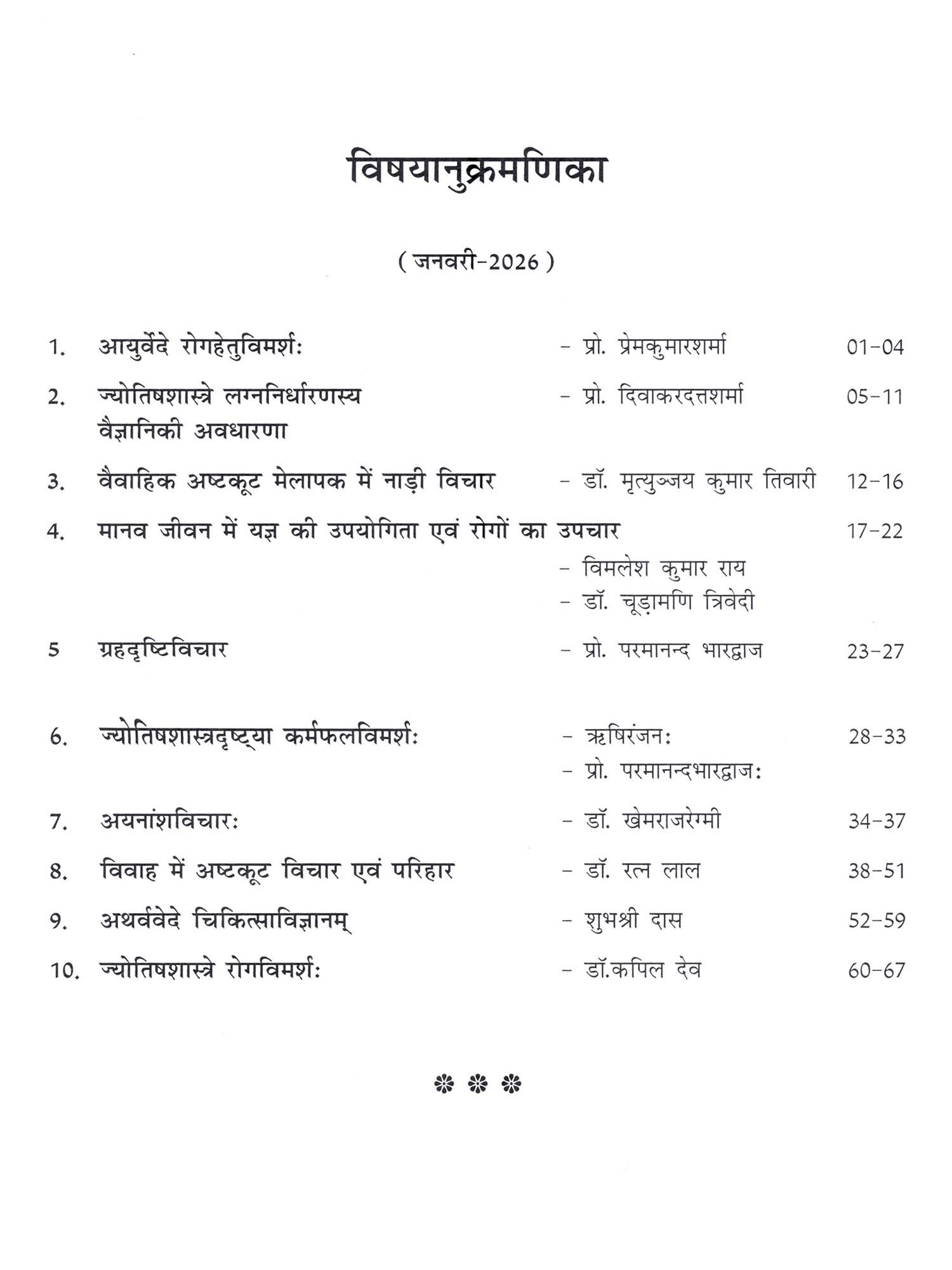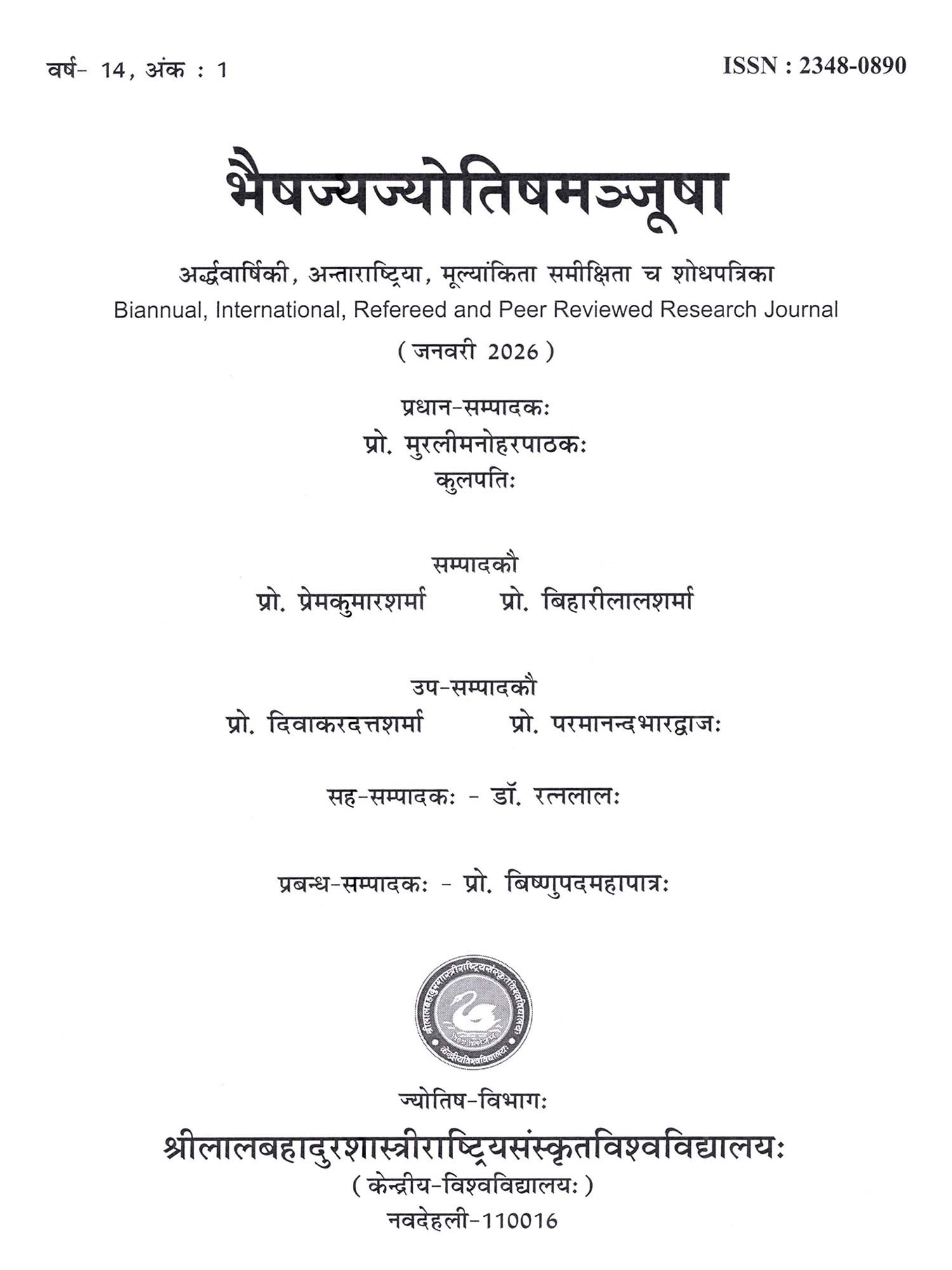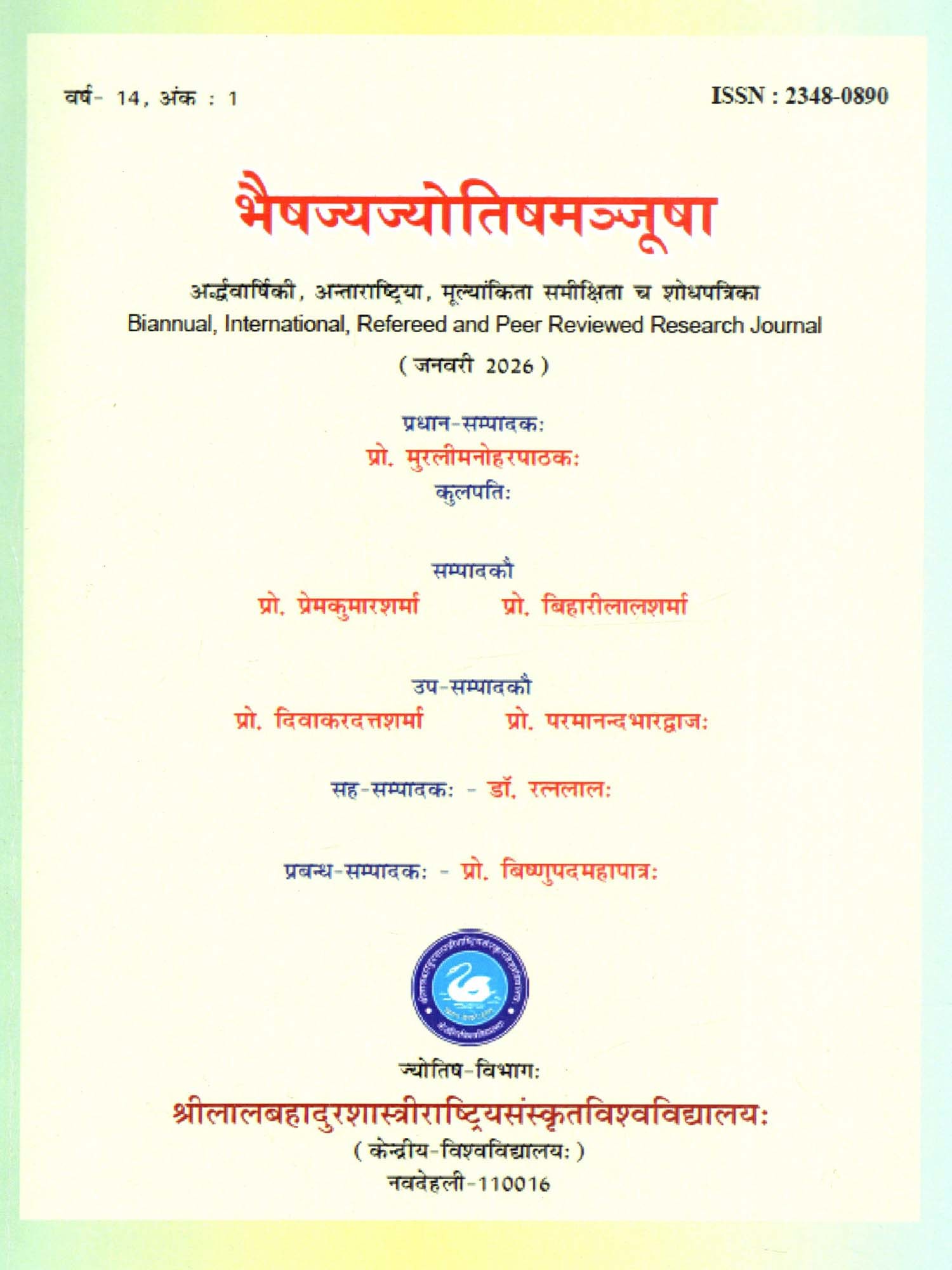 भैषज्यज्योतिषमञ्जूषा (अर्द्धवार्षिकी, अन्ताराष्ट्रिया, मूल्यांकिता समीक्षिता च शोधपत्रिका): Bhaishajya Jyotish Manjusha (Biannual, International, Refereed and Peer Reviewed Research Journal January 2026)