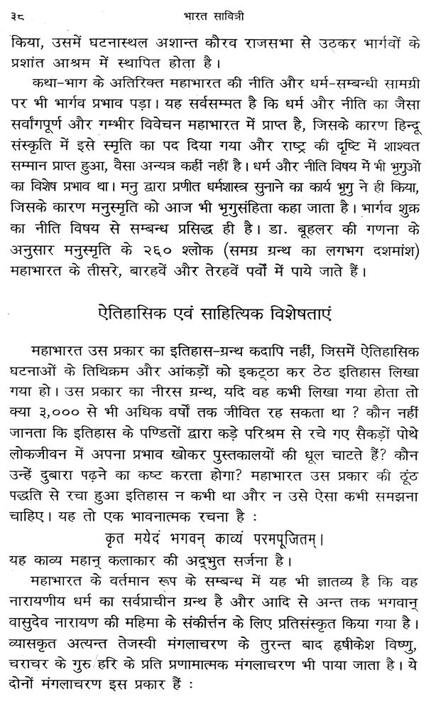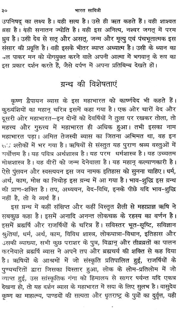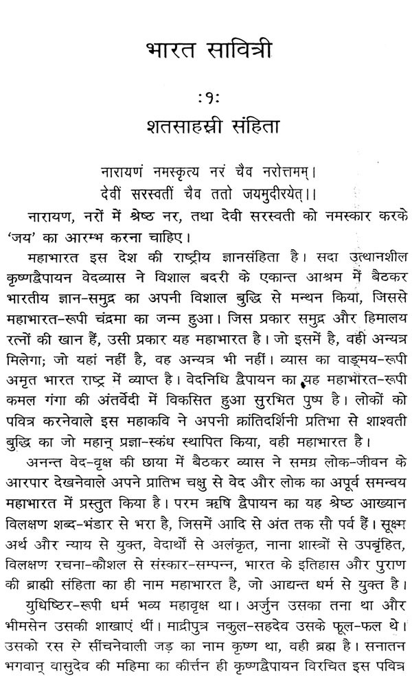 'भारत सावित्री' नाम महाभारत के अन्त में आया है। जैसे वेदों का सार गायत्री मन्त्र या सावित्री है, वैसे ही सम्पूर्ण महाभारत का सार धर्म शब्द में है। भारत-युद्ध की कथा तो निमित्त मात्र है, इसके आधार पर महाभारत के मनीषी लेखक ने युद्ध-कथा को धर्म-संहिता के रूप में परिवर्त्तित कर दिया था। धर्म की नित्य महिमा को बताने के लिए ग्रन्थ के अन्त में यह श्लोक है: