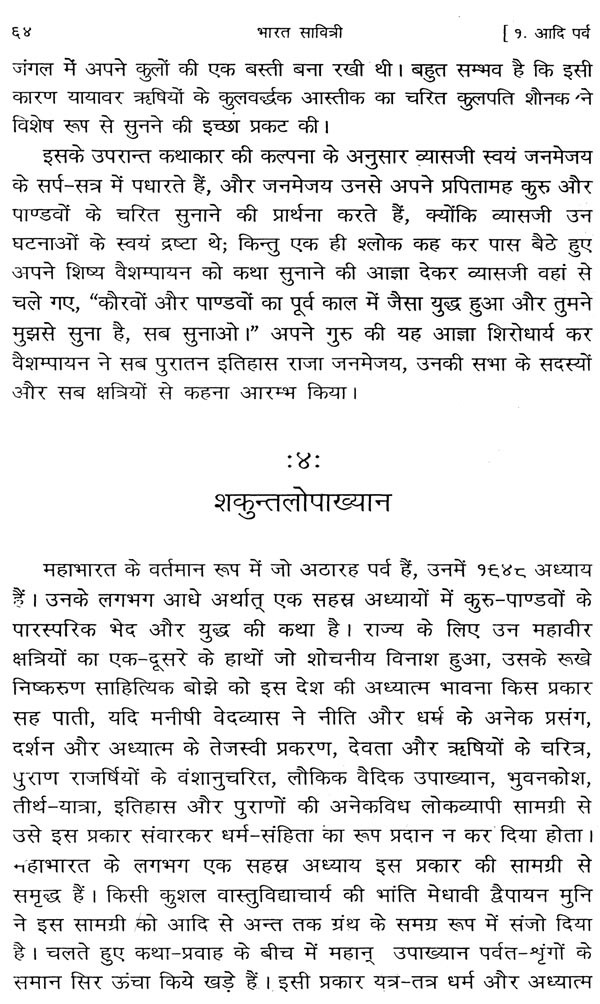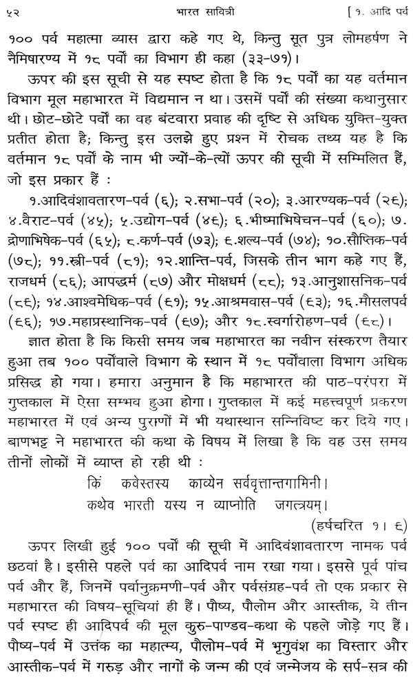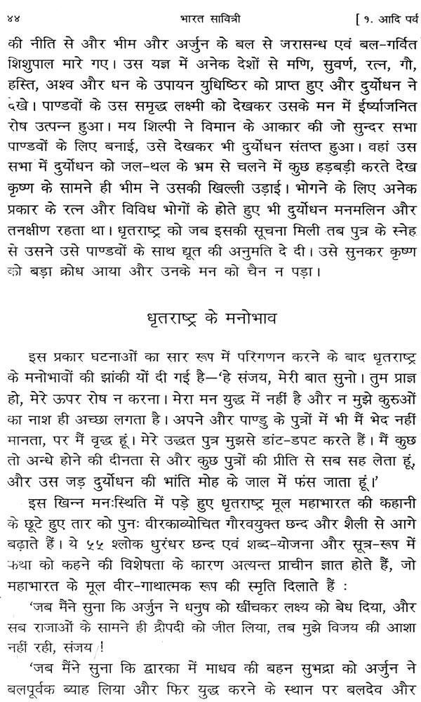 'भारत सावित्री' के रूप में महाभारत का एक नया अध्ययन यहाँ प्रस्तुत किया गया है। इस अध्ययन के अट्ठाइस लेख 'हिन्दुस्तान' साप्ताहिक पत्र में धारावाहिक रूप से १६५३-५४ में प्रकाशित हुए थे, शेष अंश बाद में लिखा गया है। पुस्तक तीन खण्डों में है। इस प्रथम खण्ड में 'विराट पर्व' तक की कथा आ गई है। दूसरे खण्ड में 'उद्योग पर्व' से 'स्त्री पर्व' अर्थात् युद्ध के अन्त तक की कथा है और तीसरे खण्ड में 'शान्ति पर्व' से लेकर महाभारत के अन्त तक का अंश दिया गया है।