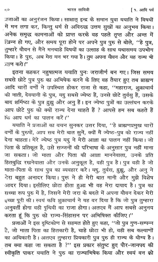 अर्थात् काम से, भय से, लोभ से अथवा प्राणों के लिए भी धर्म को छोड़ना उचित नहीं। धर्म नित्य है, सुख और दुःख क्षणिक हैं। जीव नित्य है और शरीर (धातु) अनित्य है। इस श्लोक की संज्ञा भारत सावित्री है (स्वर्गा० ५। ६४)। यही महाभारत का निचोड़ या उसका गायत्री मन्त्र है। विश्व की प्रेरक शक्ति का नाम सविता है। महाभारत ग्रन्थ का जो धर्मप्रधान उद्देश्य है, वही उसका सविता देवता है। उसकी प्रेरणात्मक भावना को इस अध्ययन में यथासम्भव सुरक्षित रखा गया है। यही इस नाम का हेतु है।