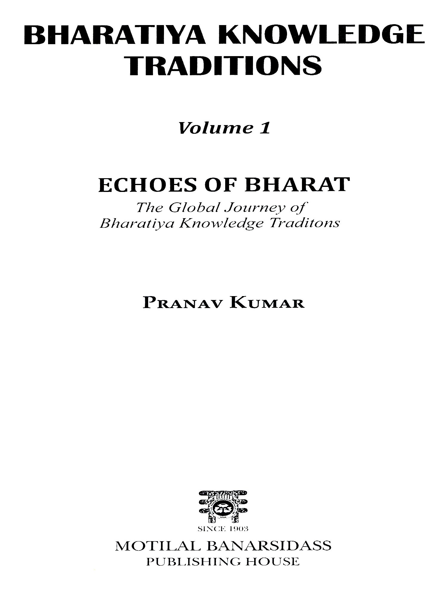 Heritage and Continuity of Bharatiya Knowledge India's profound intellectual legacy is based on one of the world's oldest and most dynamic traditions. From the immortal Vedic hymns passed down orally for millennia to profound philosophical treatises that helped mould millennia-old civilisations across disparate continents, India's knowledge systems have shown an impressive ability to preserve and transform. This volume-the first in the series- focuses on "Echoes of Bharat: The Global Journey of Bharatiya Knowledge Traditions" and provides an extensive overview of the ways in which knowledge systems originating from ancient Bharatvarsha (India) have been carried to other parts of the world where they have been nurtured and flourished.